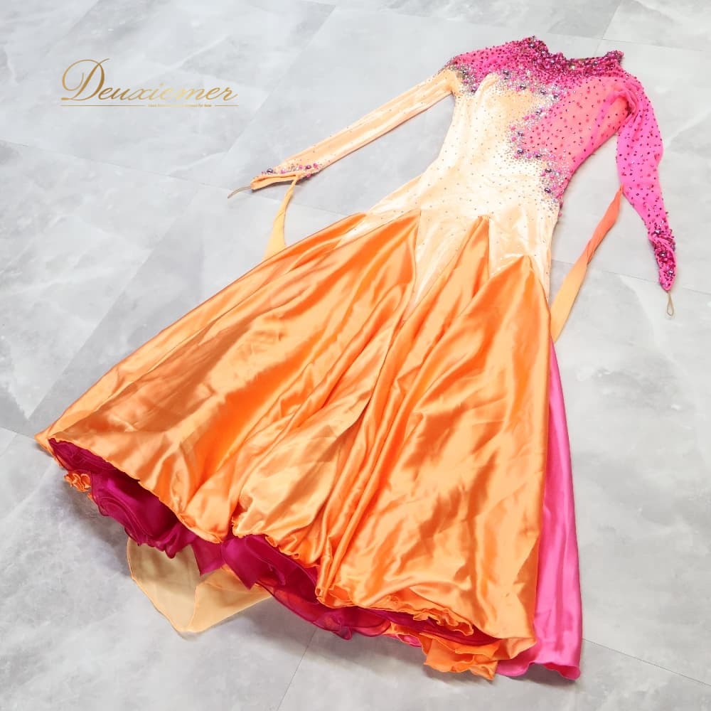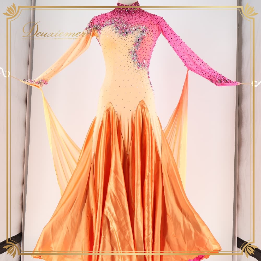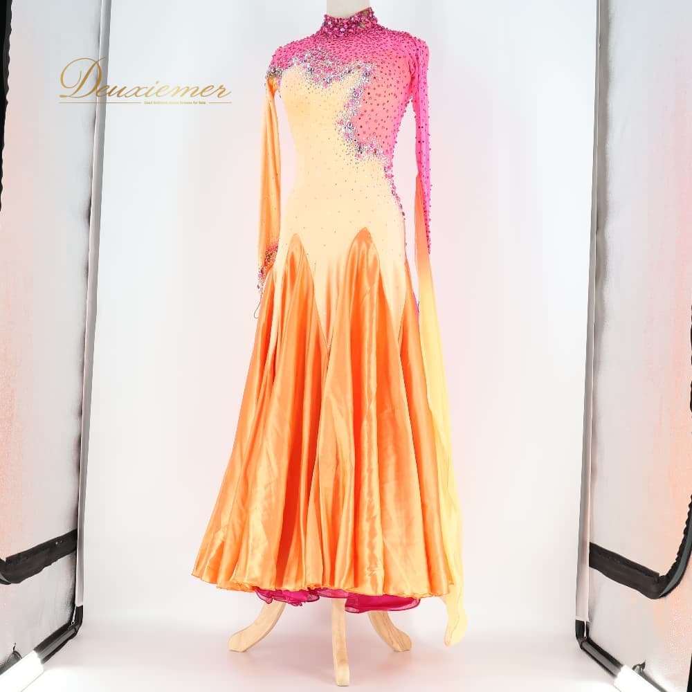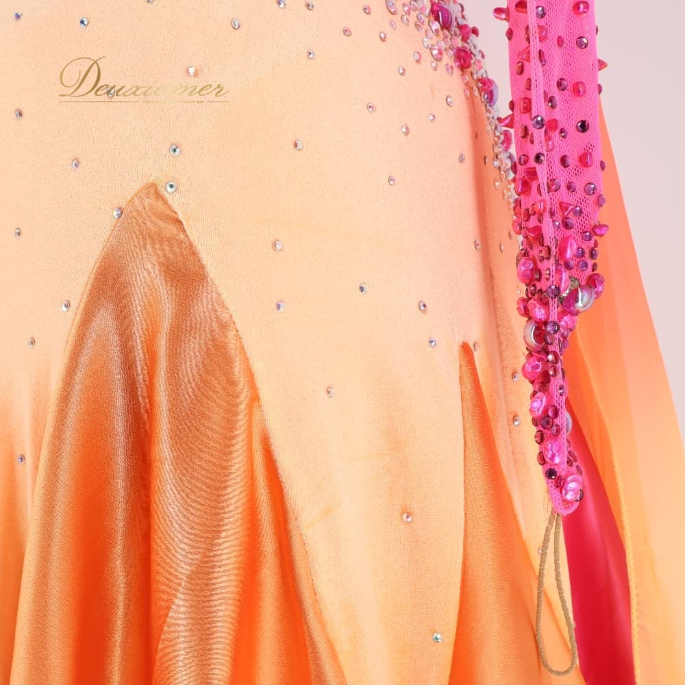 社交ダンス 衣装 CHRISANNE クリスアン イングランド製 ドレス ワンピース スタンダード ピンク系 イエロー系 オレンジ系 デモ 競技 ダンス パーティ 発表会 フロート レース ベロア 光沢 明るい コスチューム 上品 華やか フォーマル デモンストレーション 演技用 ダンス用