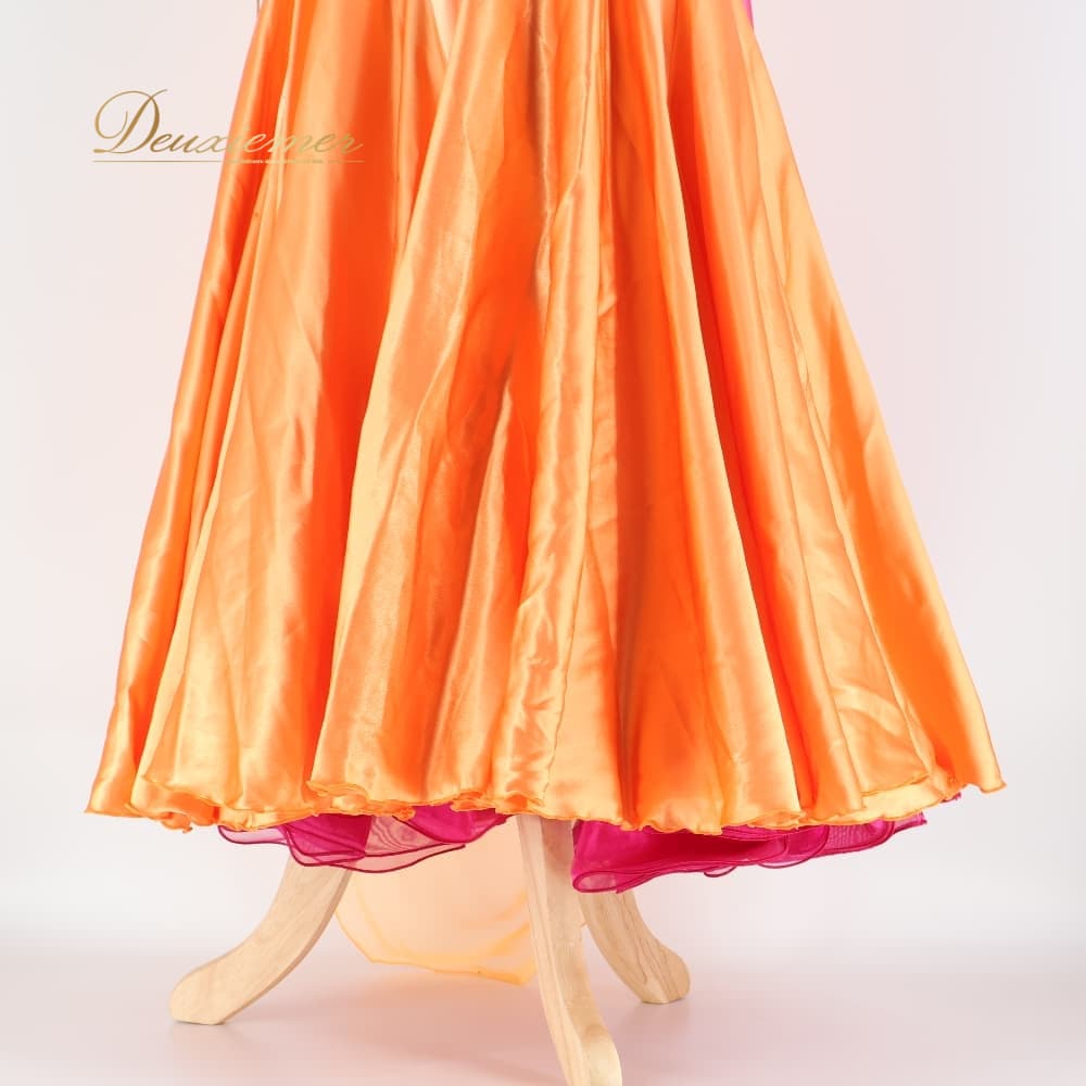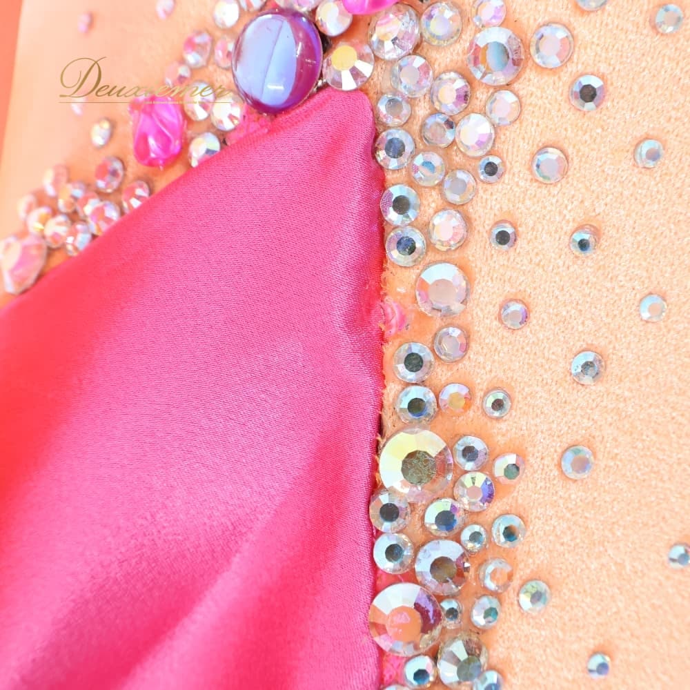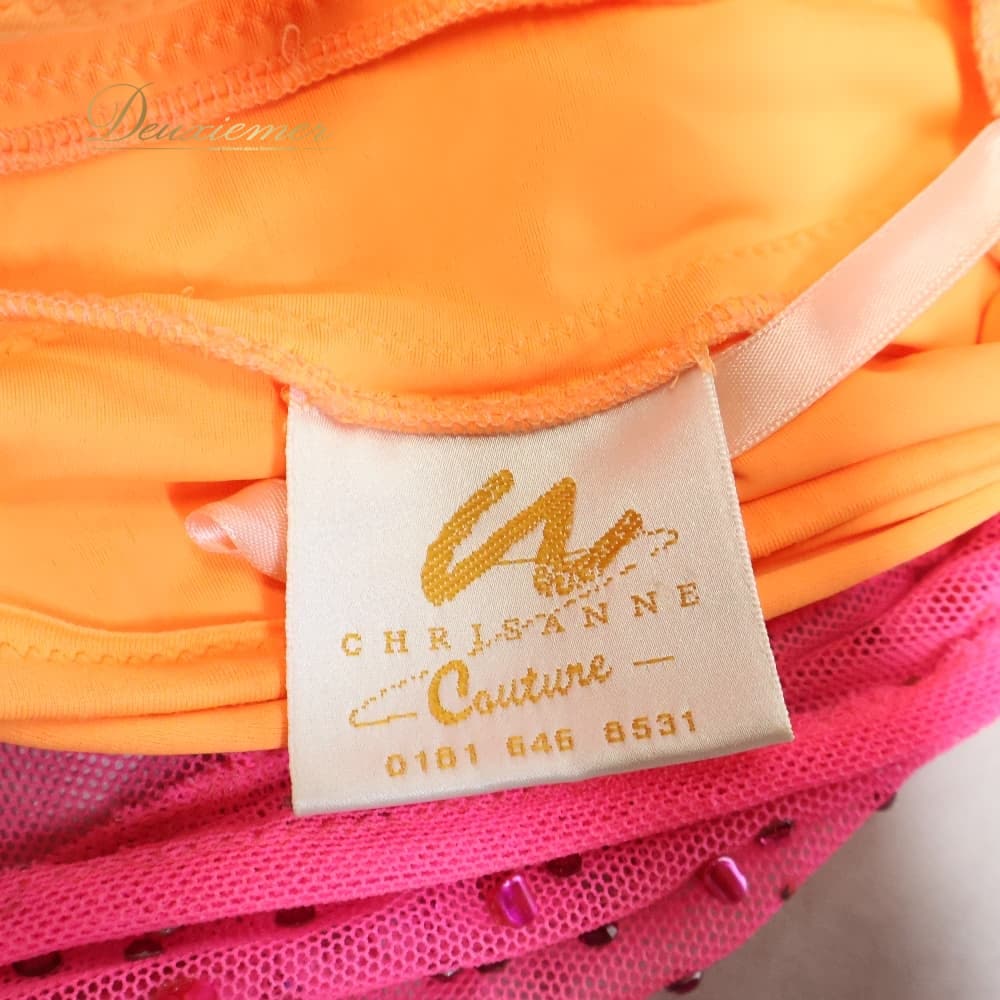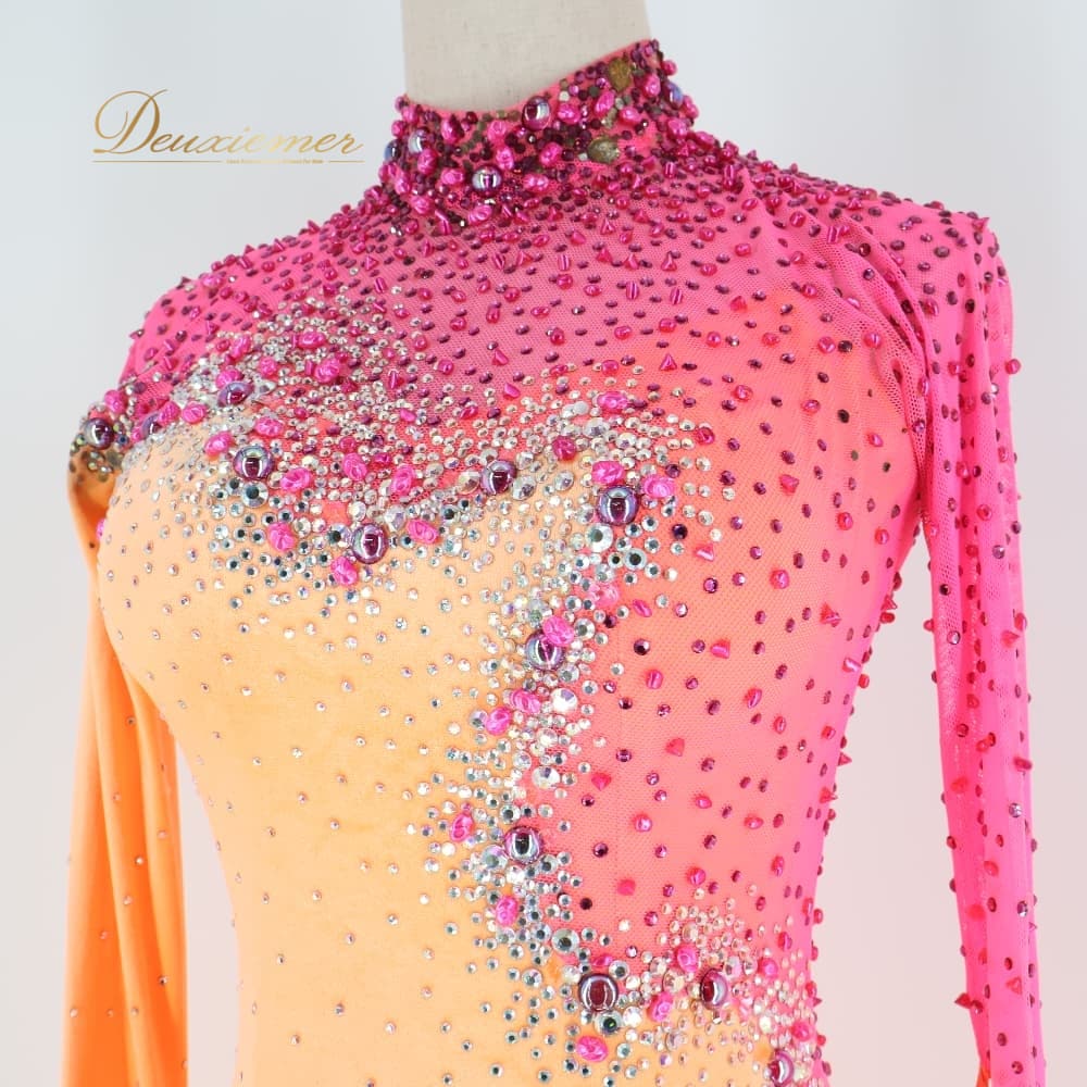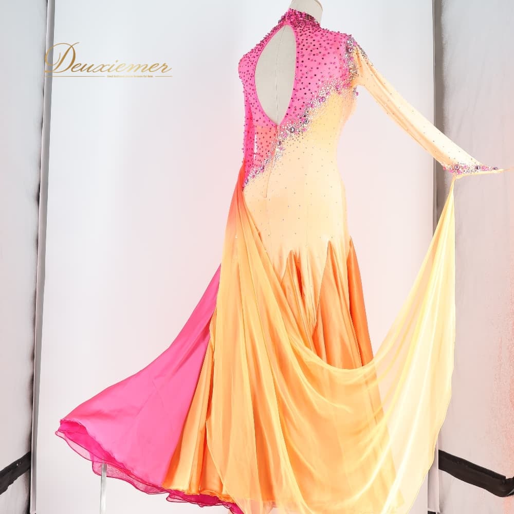 社交ダンス 衣装 CHRISANNE クリスアン イングランド製 ドレス ワンピース スタンダード ピンク系 イエロー系 オレンジ系 デモ 競技 ダンス パーティ 発表会 フロート レース ベロア 光沢 明るい コスチューム 上品 華やか フォーマル デモンストレーション 演技用 ダンス用