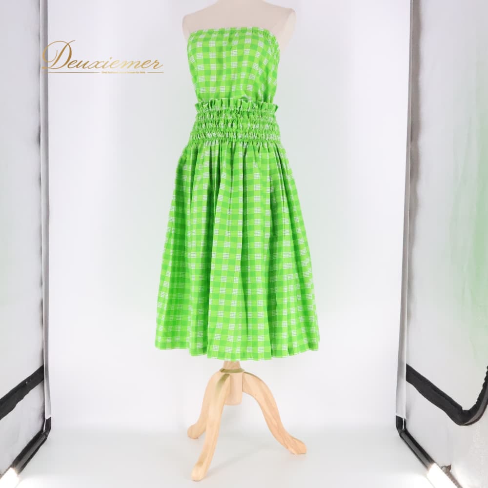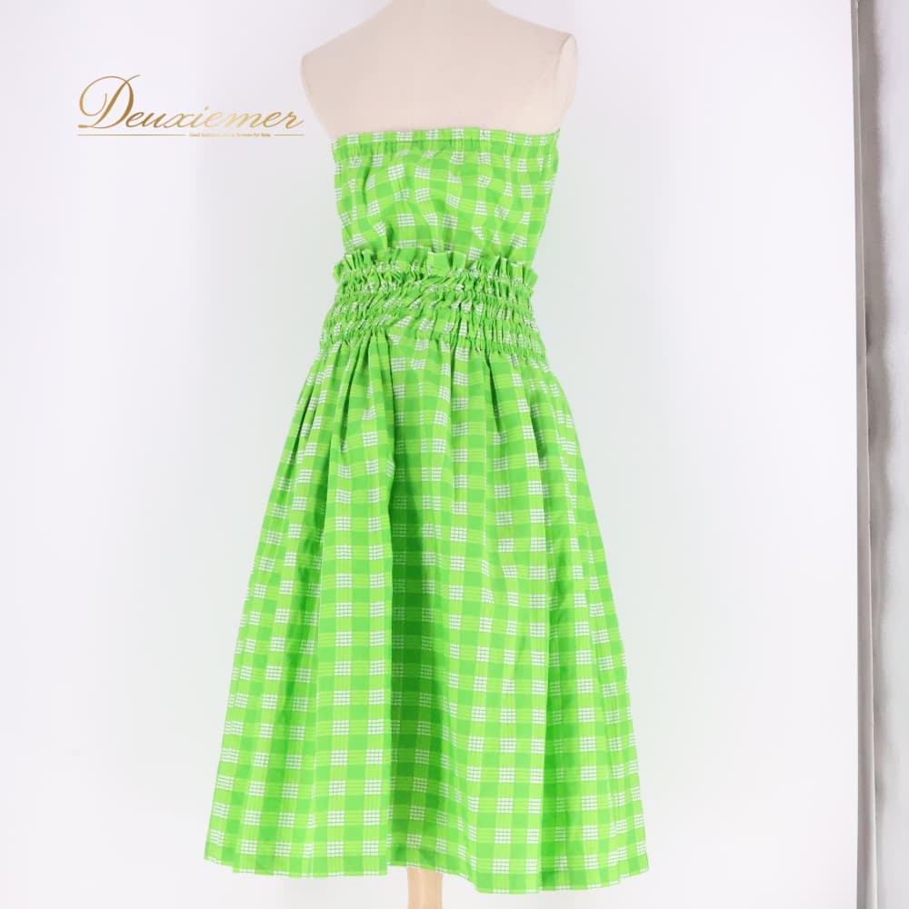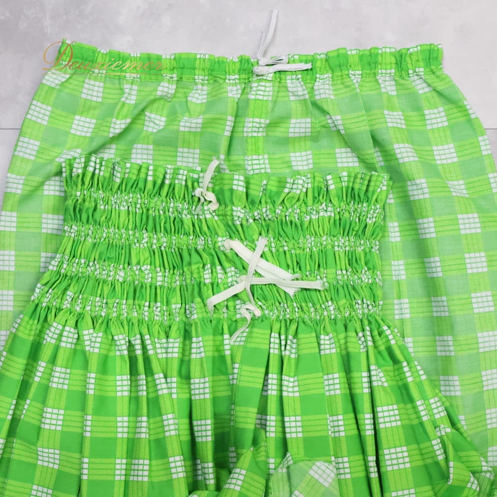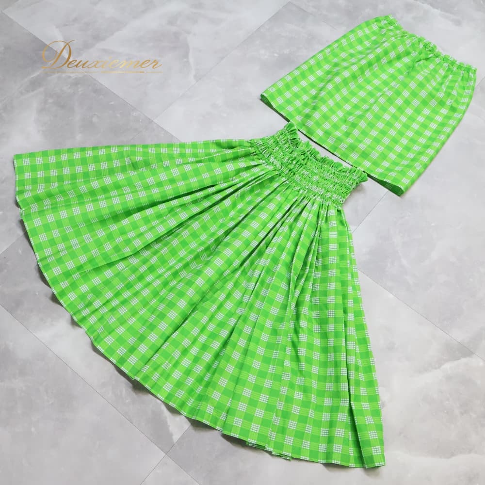 フラダンス 衣装 ツーピース 上下セット セットアップ グリーン系 ツーカラー チェック柄 かわいい 華やか 鮮やか 明るい シンプル シングル 黄緑 白 ハワイアン アロハ ハワイアンプリント フラ ダンス レッスン 練習 フラ衣装 チェック柄ワンピース風