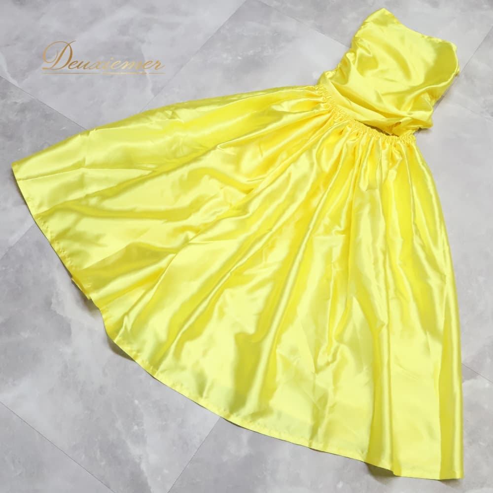 #イエローカラー #光沢感 #華やかコーデ #チューブトップ #トップス #背面ゴム #伸縮性あり #ウエストゴム #2本ゴム仕様 #スカート #セットアップ #上下セット #春夏コーデ #きれいめ #カジュアルミックス #トレンド #大人可愛い #体型カバー #旅行コーデ #ENUTSU