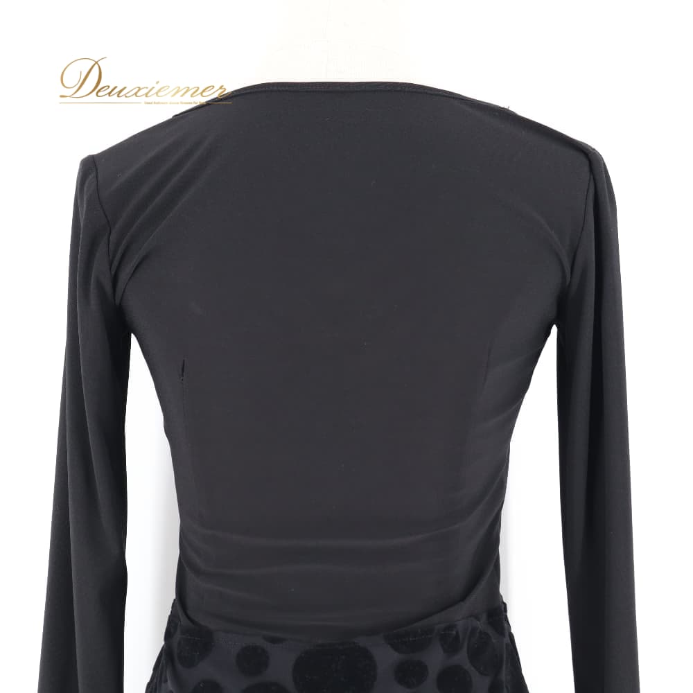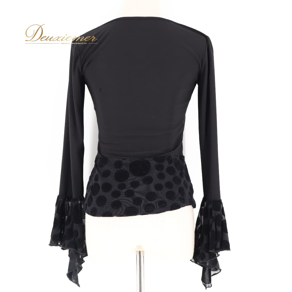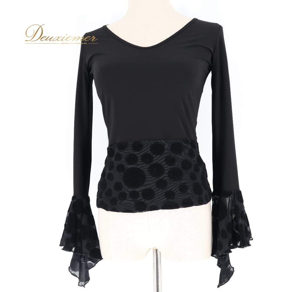 社交ダンス 衣装 gentil ジャンティトップス カットソー レッスンウェア ブラック系 黒 ドット柄 水玉 ベロア フレア袖 透け感 チュール ベロア 華やか かわいい おしゃれ 上品 大人っぽい 練習着 レッスン着 レッスン