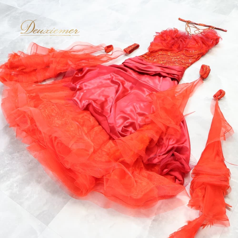 社交ダンス 衣装 KAORI カオリ ドレス ワンピース スタンダード レッド系 オレンジ系 赤 朱色 フロート レース 羽 デモ 競技 パーティ 発表会 ダンス 豪華 フリル 華やか レディース ダンス衣装 鮮やか 舞台衣装 競技衣装 パーティー衣装