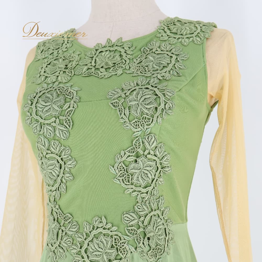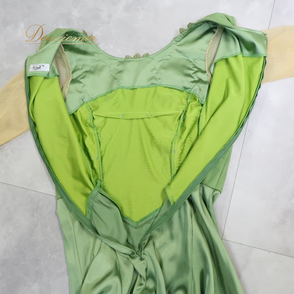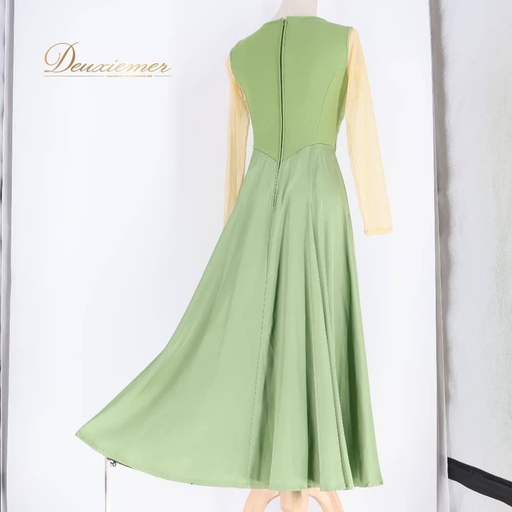 社交ダンス 衣装 サンヨシムラ 日本製 ドレス ワンピース スタンダード ベージュ系 グリーン系 緑 抹茶色 レース 光沢 軽い 薄い ダンス パーティ 発表会 ダンス衣装 発表会衣装 きれいめ エレガント