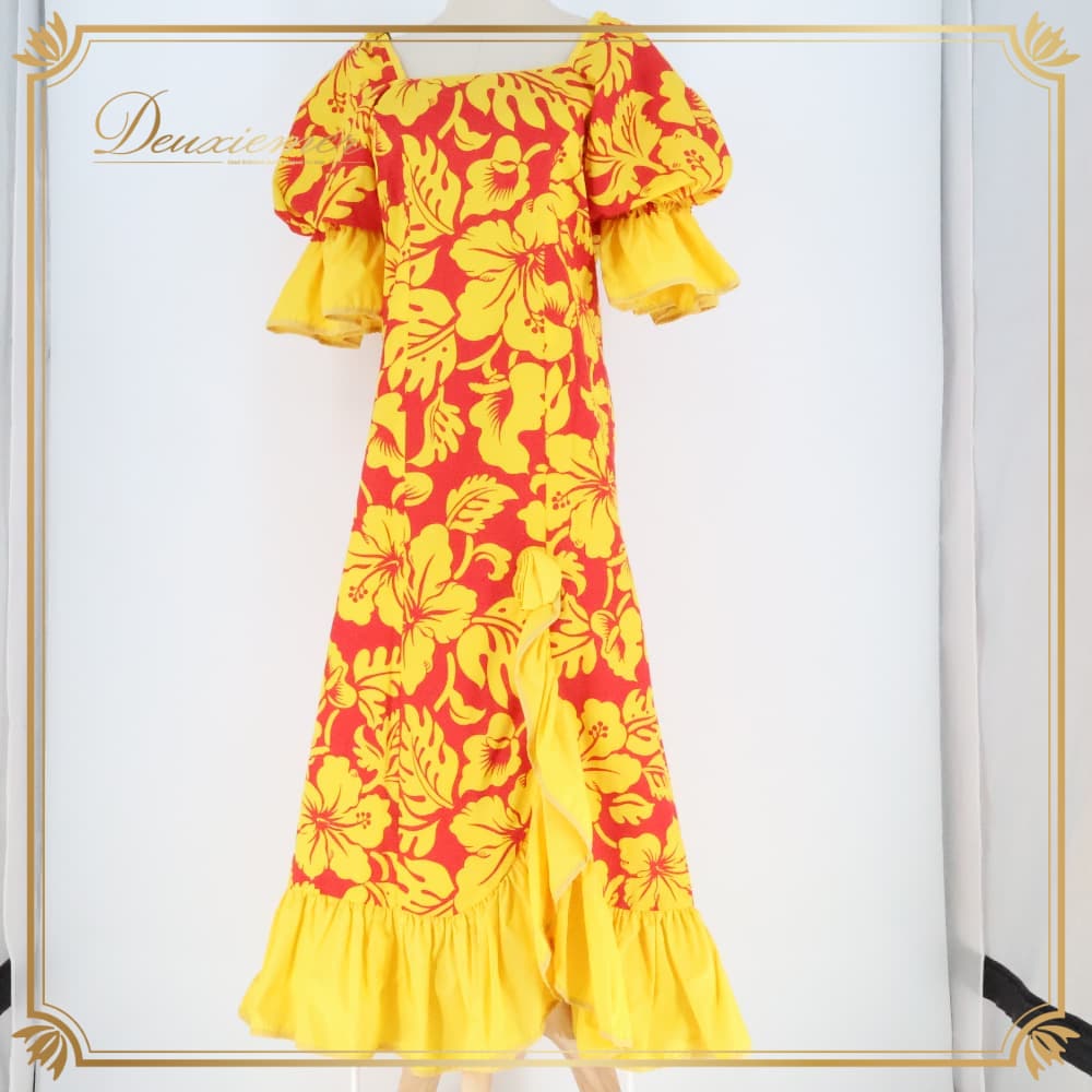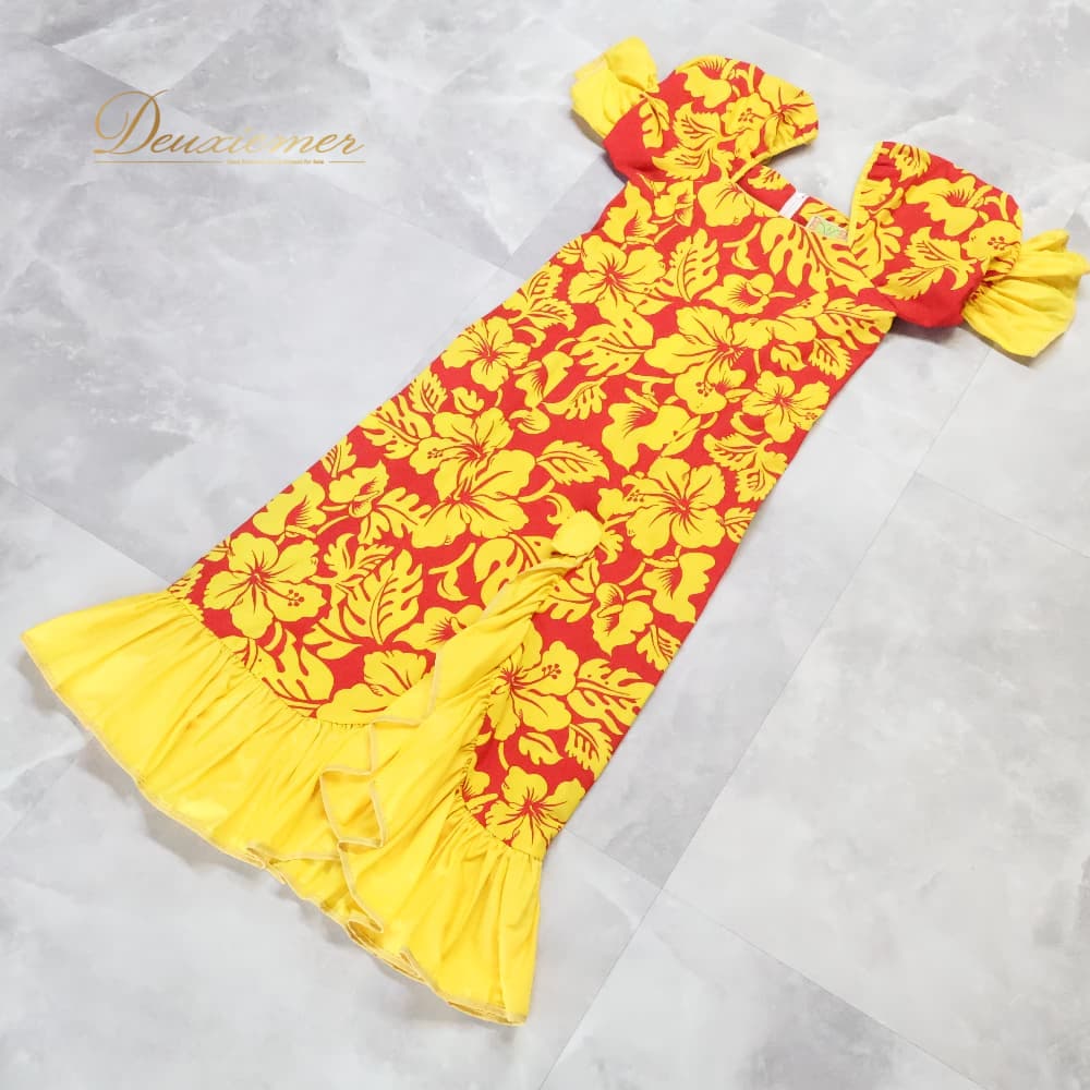 フラダンス 衣装 MENEHUNE PLANTETION メネフネプランテーション ワンピース ドレス レッド系 イエロー系 ツーカラー パフスリーブ フリル アシンメトリー ハイビスカス柄 アンスリウム柄 かわいい 華やか 鮮やか 明るい 赤 黄 練習