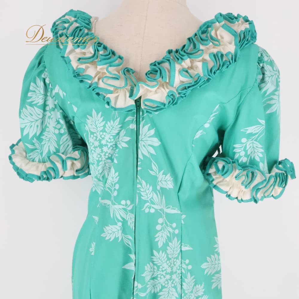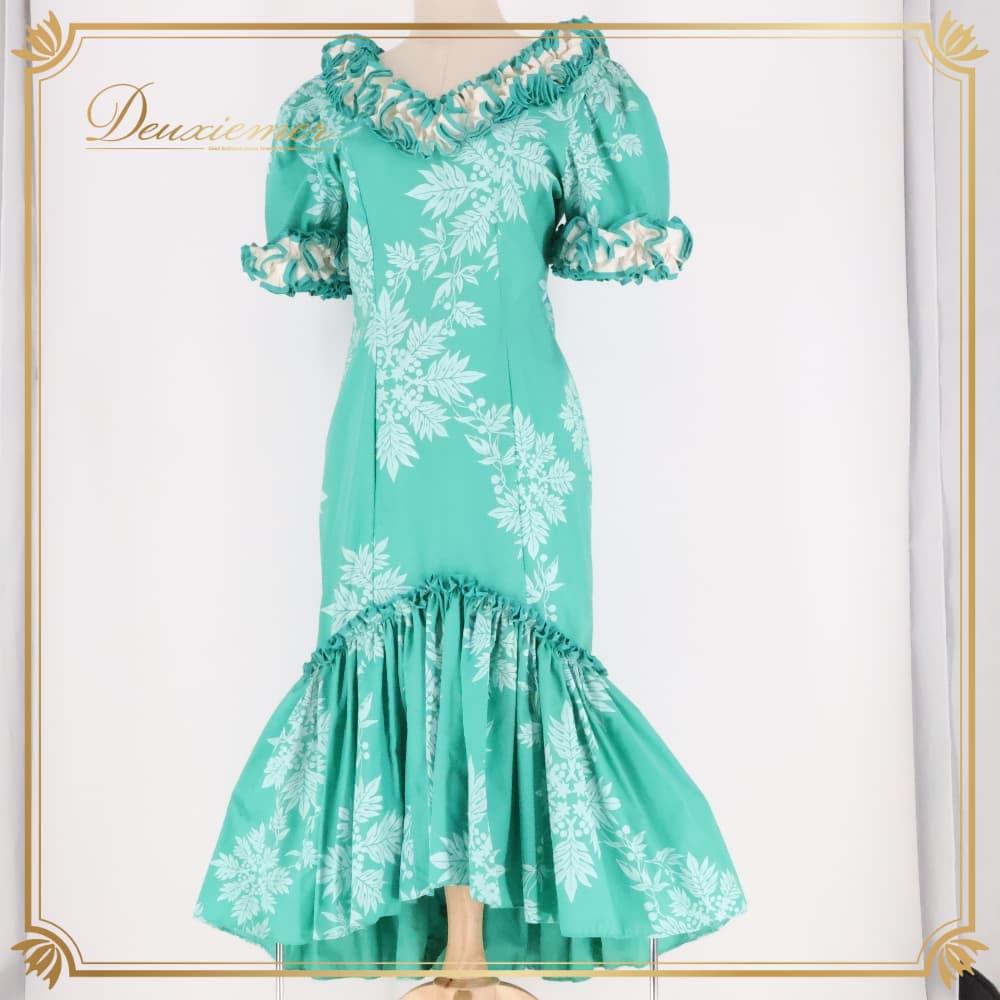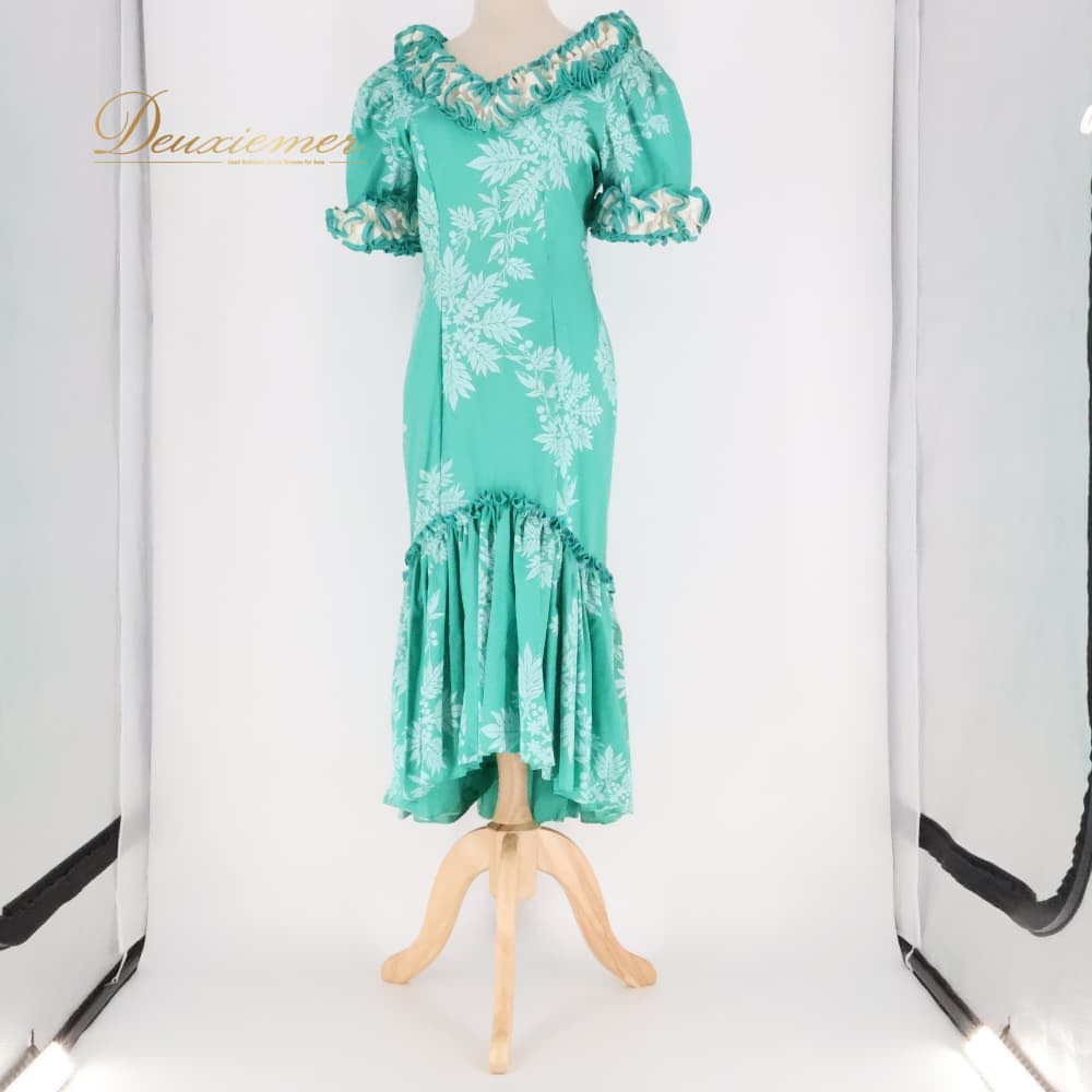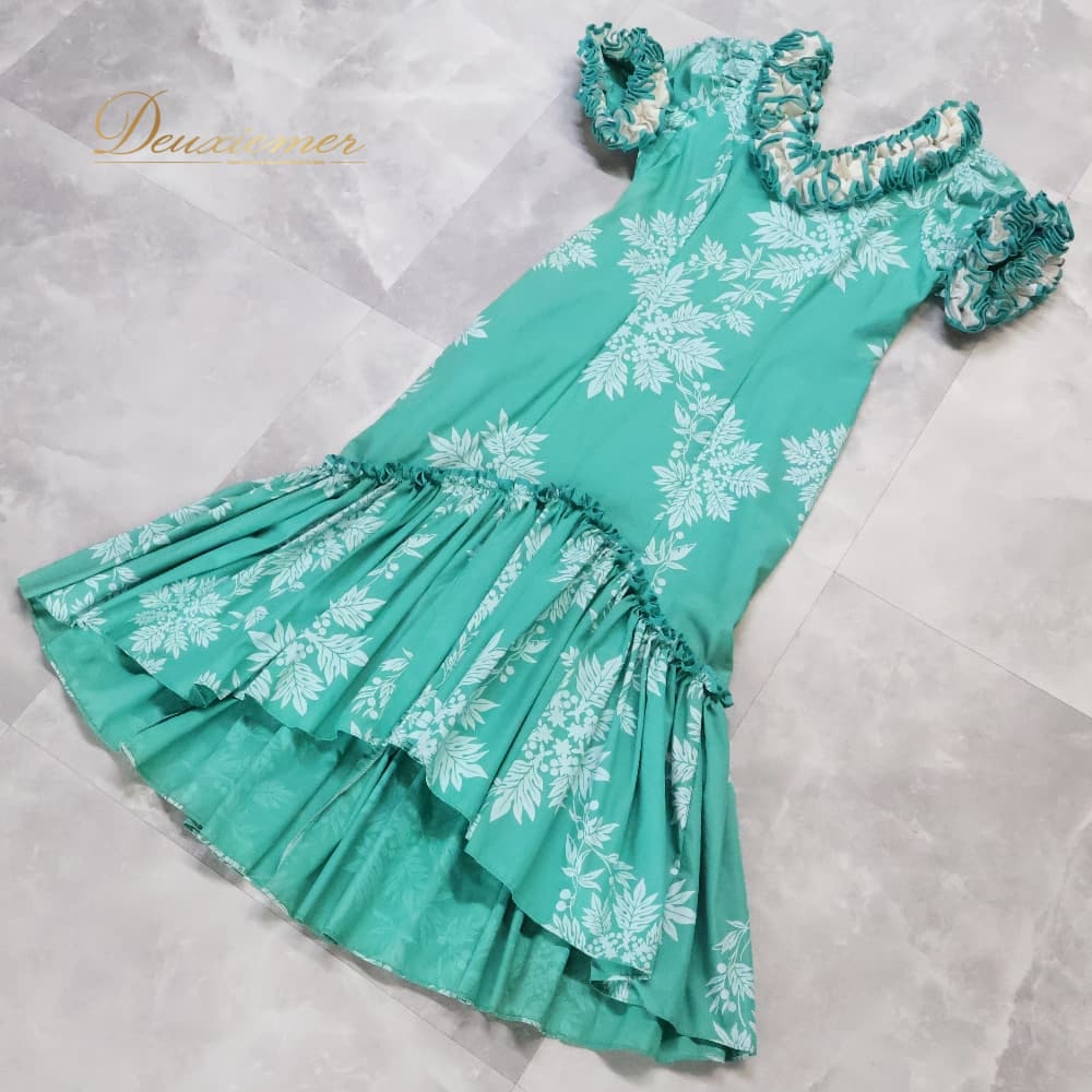 フラダンス 衣装 yen's ワンピース ドレス ホワイト系 グリーン系 ハワイ製 アシンメトリー フリル ツーカラー ラウアエ柄 ポケット かわいい 華やか 鮮やか 明るい 爽やか 緑 白 ハワイアン アロハ ハワイアンプリント フラ ダンス レッスン 練習