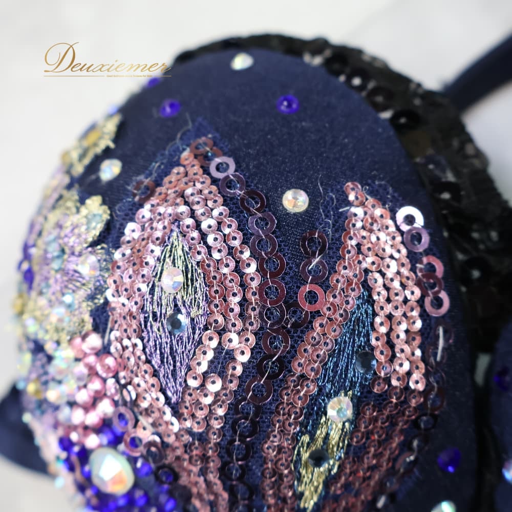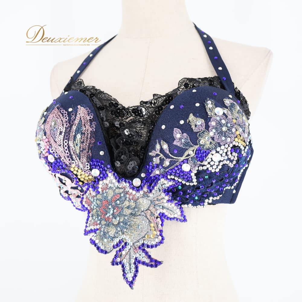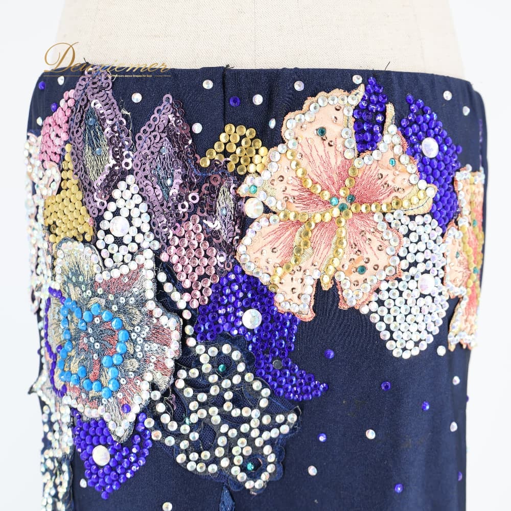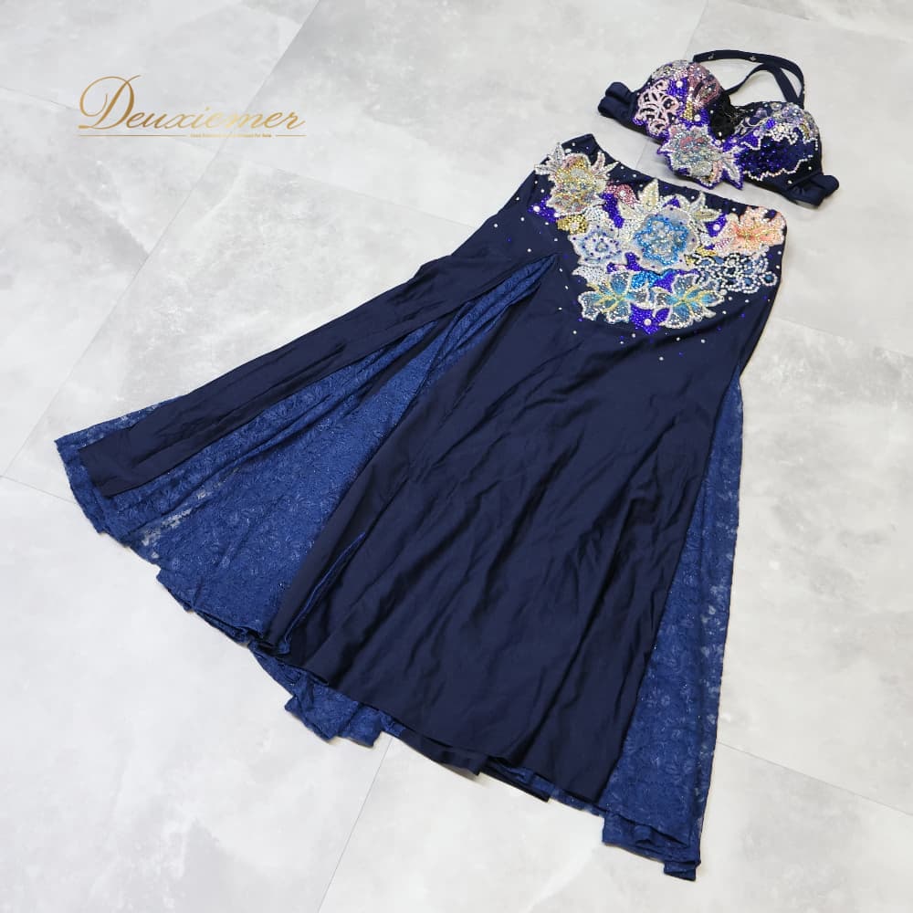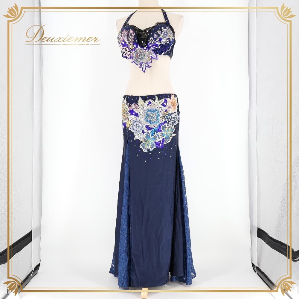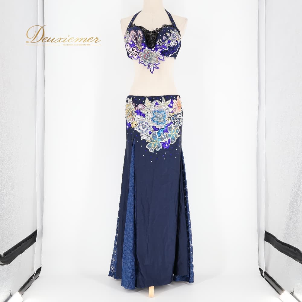ベリーダンス 衣装 上下セット オリエンタル ネイビー系 トップス スカート ラインストーン キラキラ 豪華 装飾 華やか 紺 黒 花 レース スリット ダンス衣装 イベント ステージ ピンク系 パープル系 ブラック系 ブルー系 ゴールド系 シルバー系