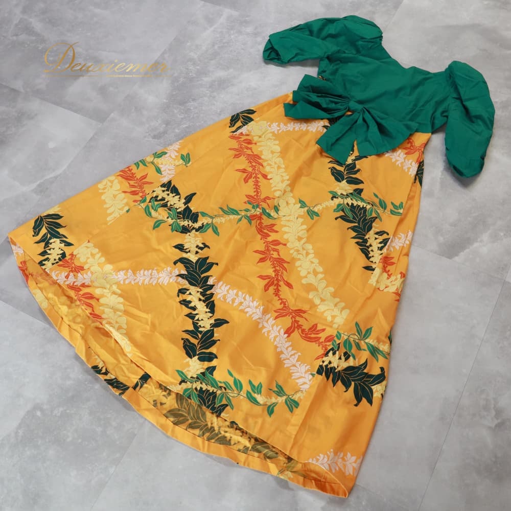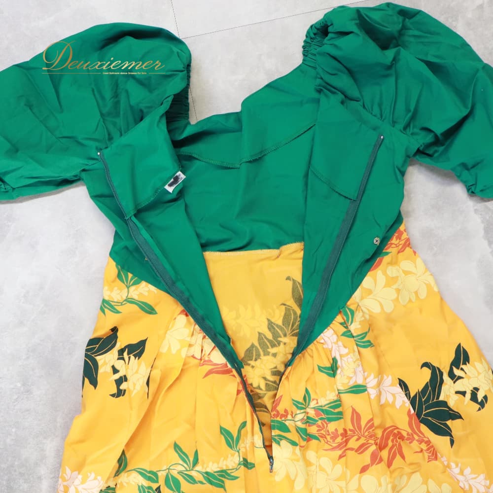 フラダンス 衣装 ワンピース ドレス グリーン系 オレンジ系 ハワイアンプリント 植物柄 花柄 フラワープリント リボン フレアスカート 緑 オレンジ 橙 華やか 鮮やか かわいい おしゃれ ホワイト系 イエロー系 レッスン着 レッスンウェア 練習着