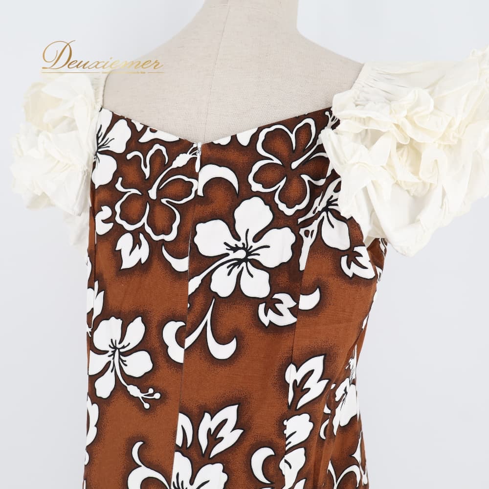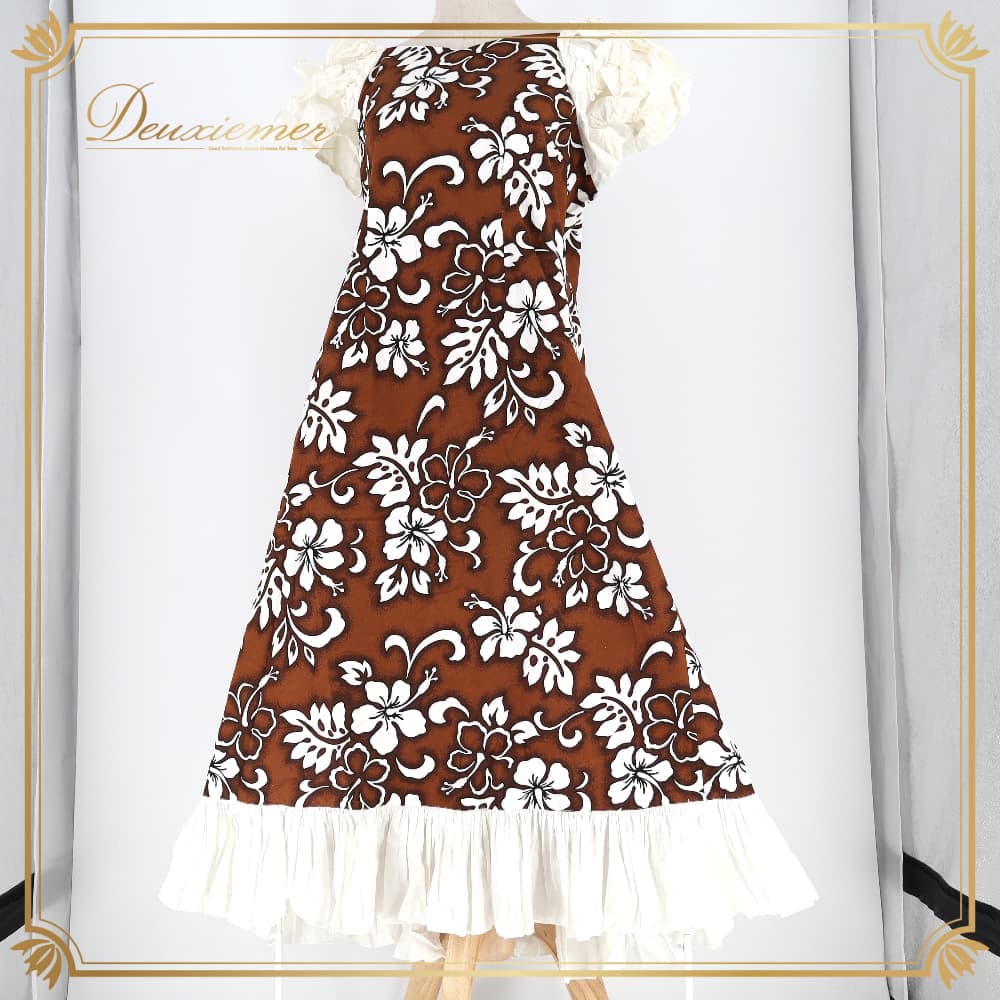 フラダンス 衣装 ワンピース ドレス ブラウン系 ハイビスカス柄 モンステラ柄 ハワイアンプリント 茶 フリル アロハ フラ ダンス レッスン 練習 おしゃれ かわいい 上品 華やか 大人っぽい ブラック系 ホワイト系 黒 白