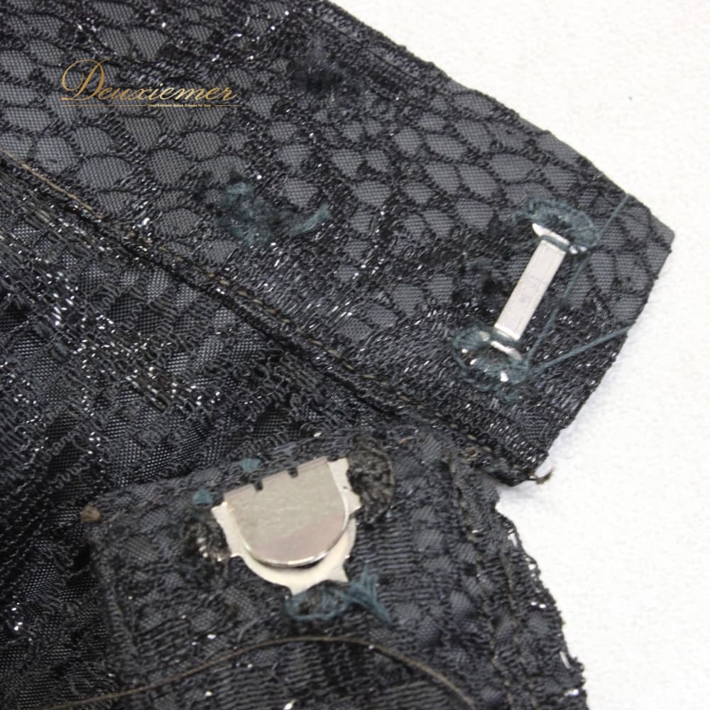 ウエストやファスナーの辺りに細い糸で補整が施されております。