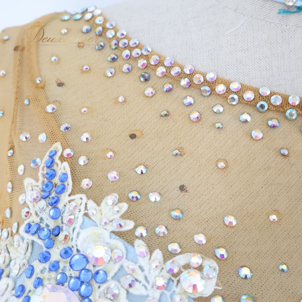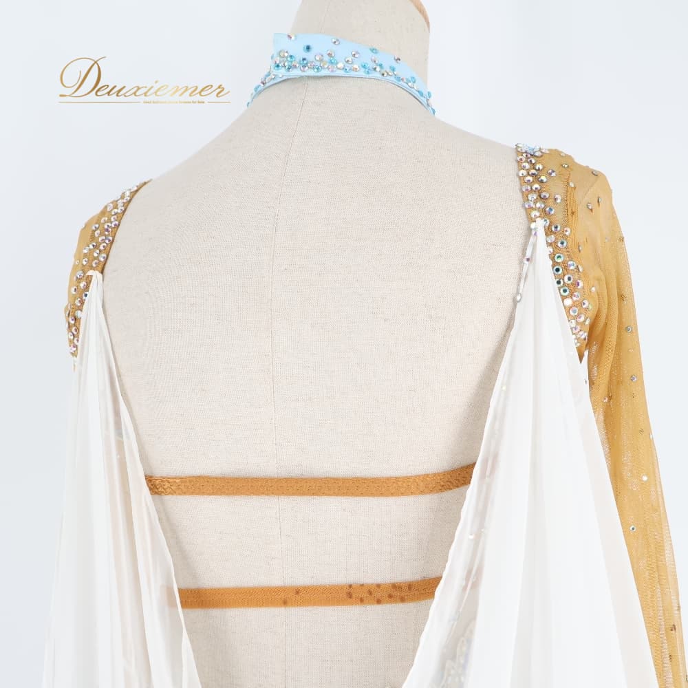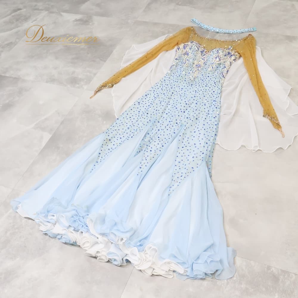 社交ダンス 衣装 HIROKO YAMAGUCHI ヒロコヤマグチ ドレス ワンピース スタンダード ホワイト系 ブルー系 水色 白 デモ 競技 ダンス パーティ 発表会 落ち感 明るい レース 上品 エレガント 大人 発表会衣装