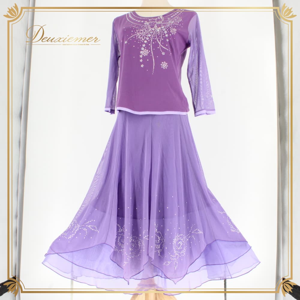 社交ダンス 衣装 ツーピース スタンダード パープル系 セットアップ 上下セット トップス スカート 紫 ラインストーン レース フォーマル 上品 大人っぽい きれいめ 華やか エレガント レッスンウェア 練習着 ステージ衣装 発表会 ダンスパーティー レディース オールシーズン ボールルームダンス ソシアルダンス