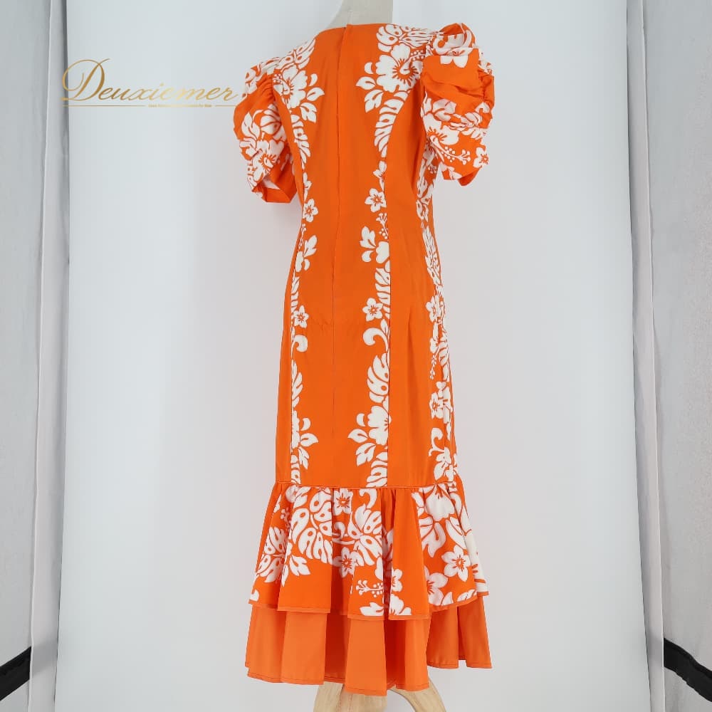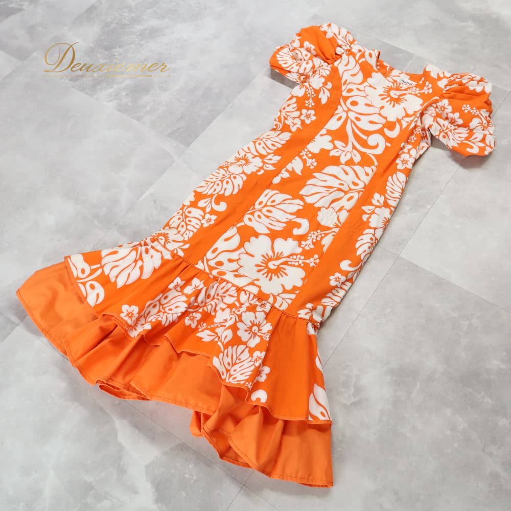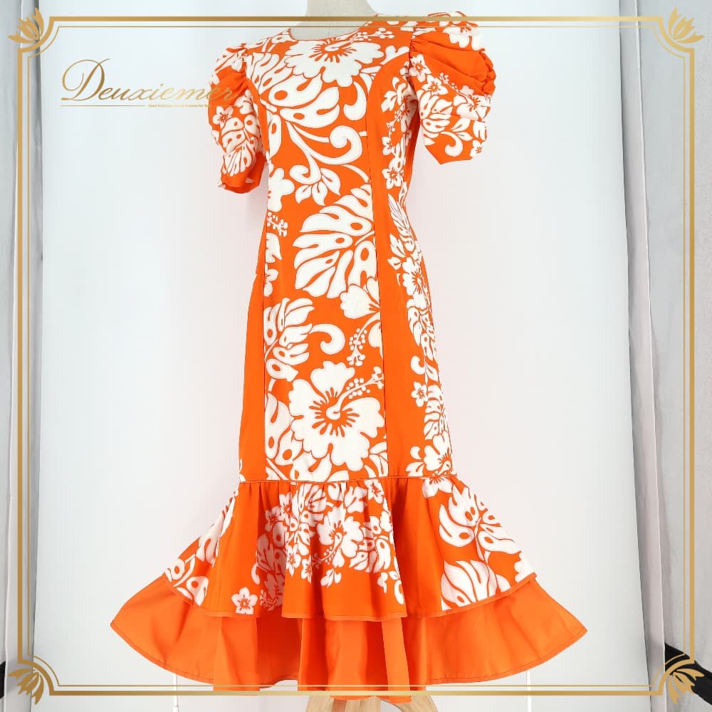 フラダンス 衣装 MENEHUNE PLANTETION メネフネプランテーション ワンピース ドレス オレンジ系 ハイビスカス柄 モンステラ柄 パフスリーブ フレア ホワイト系 オレンジ 橙 白 華やか 鮮やか かわいい おしゃれ ハワイアンプリント ハワイアン アロハ フラ ダンス レッスン 練習