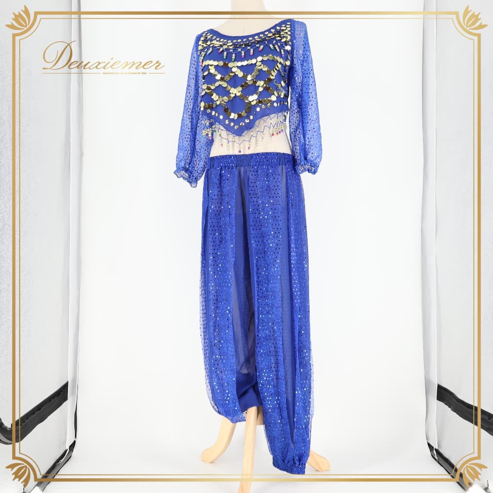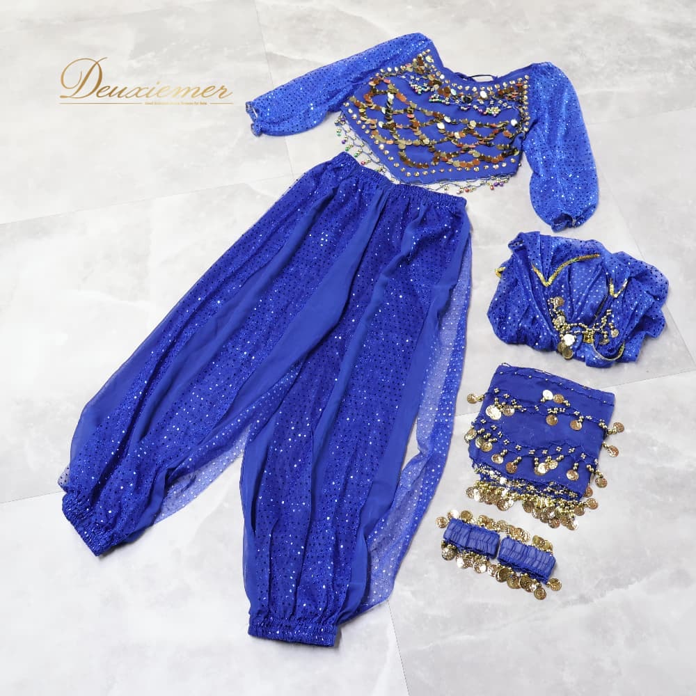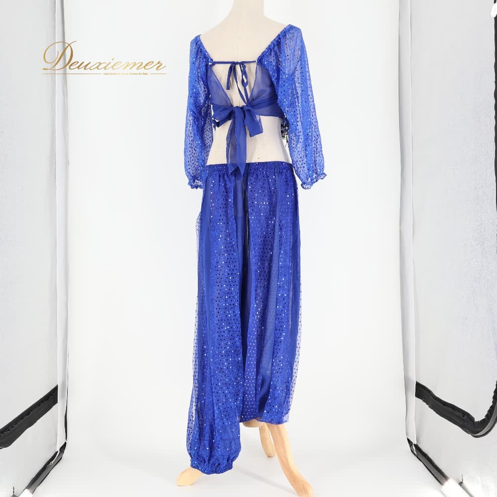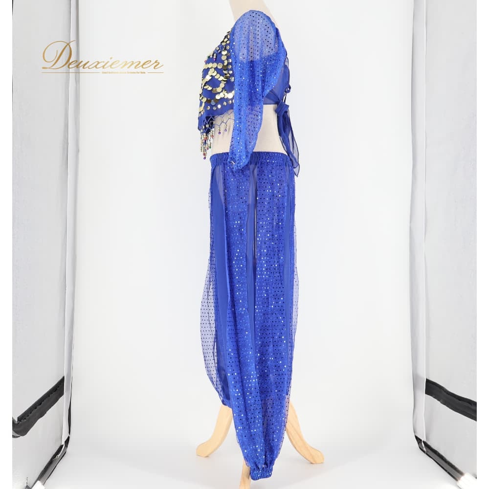 ベリーダンス 衣装 ツーピース レッスンウェア ブルー系 トップス パンツ 青 金 ボトムス ズボン 練習 レッスン イベント 華やか キラキラ ヒップスカーフ 腕飾り 透け感 かわいい 華やか おしゃれ ダンス衣装 ゴールド系