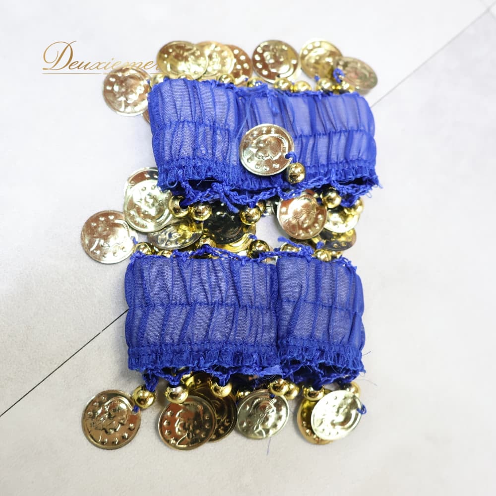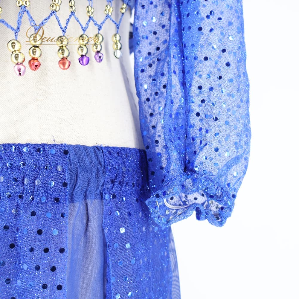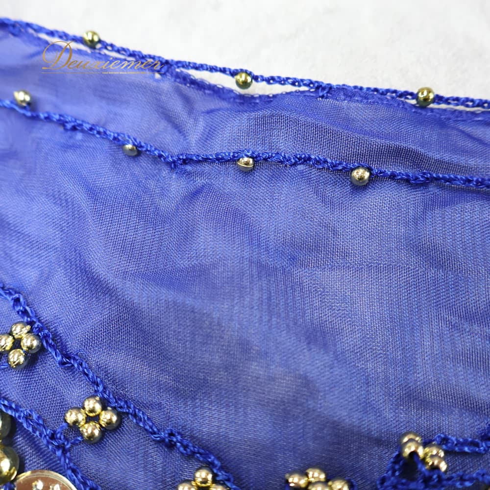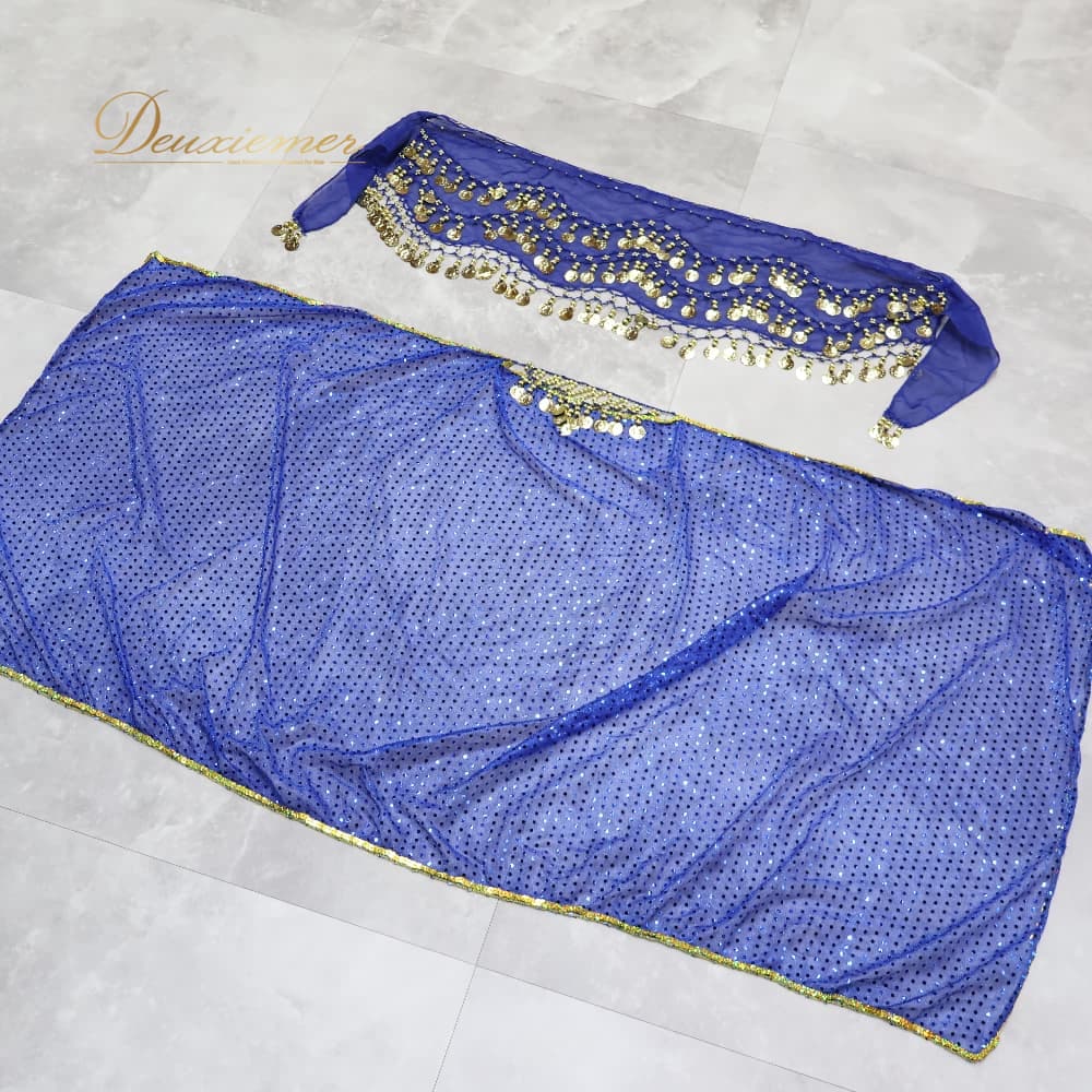 ベリーダンス 衣装 ツーピース レッスンウェア ブルー系 トップス パンツ 青 金 ボトムス ズボン 練習 レッスン イベント 華やか キラキラ ヒップスカーフ 腕飾り 透け感 かわいい 華やか おしゃれ ダンス衣装 ゴールド系