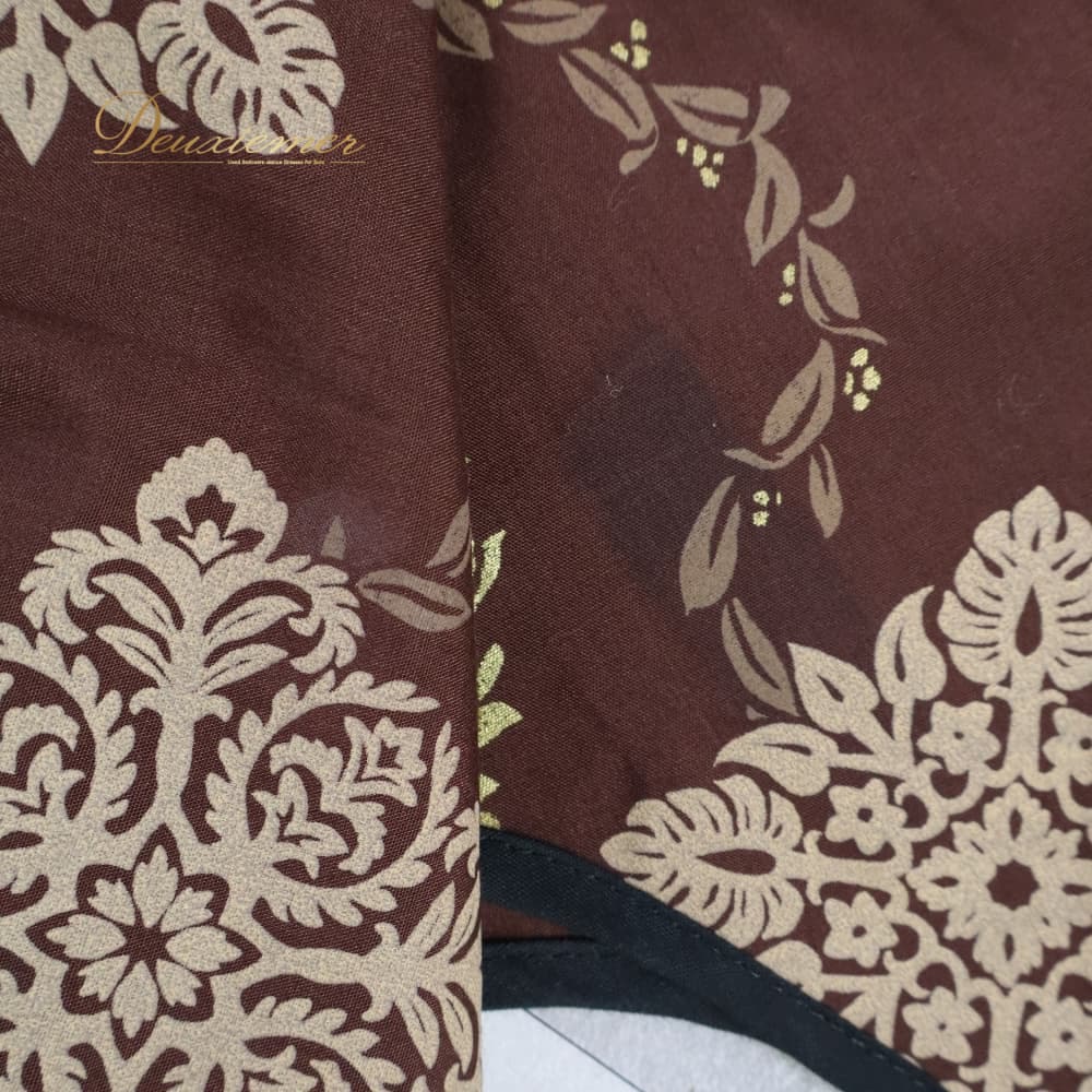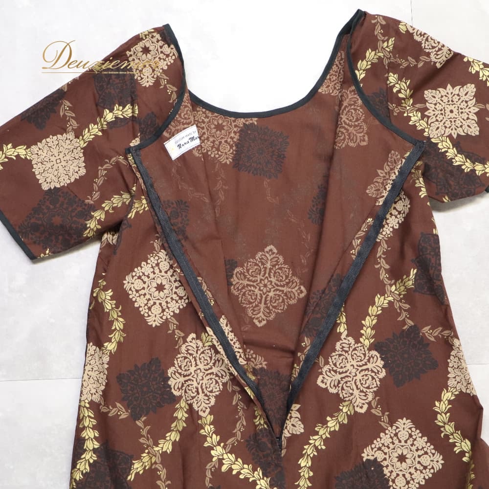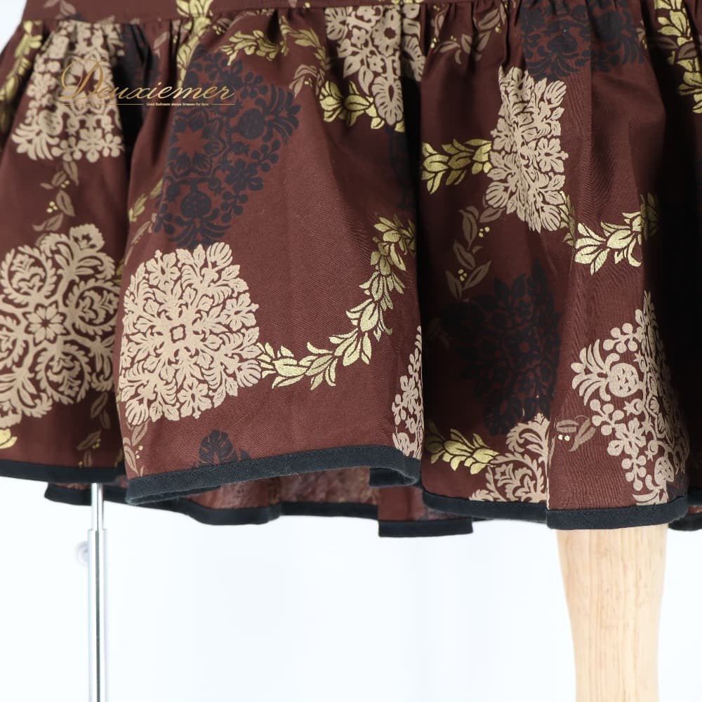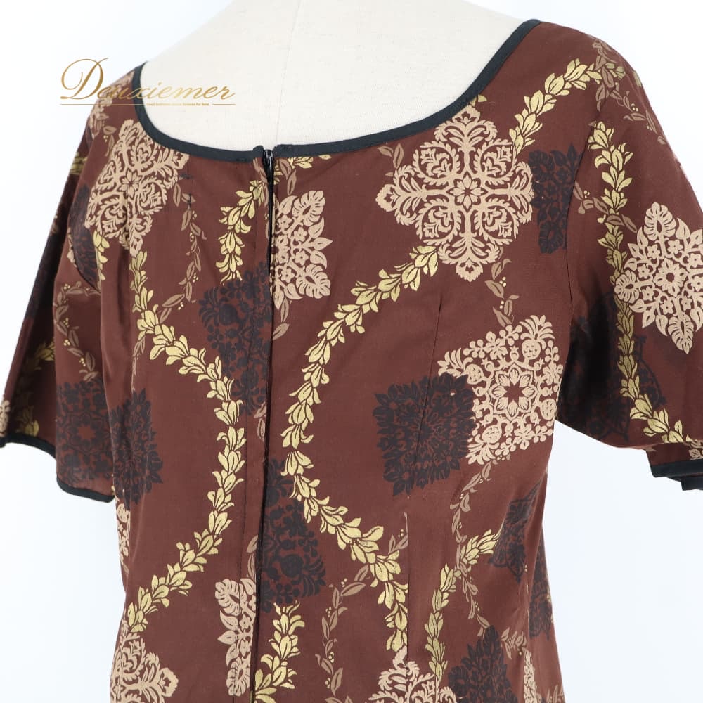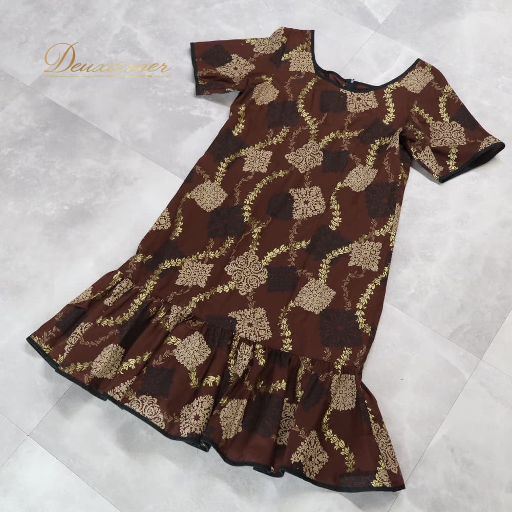 フラダンス 衣装 ワンピース ドレス ブラウン系 Nara Marcos 茶 ハワイアンプリント アロハ フラ ダンス レッスン 練習 フリル 華やか 大人っぽい 上品 ブラック系 ベージュ系 ゴールド系 黒 金 植物柄 フラワープリント