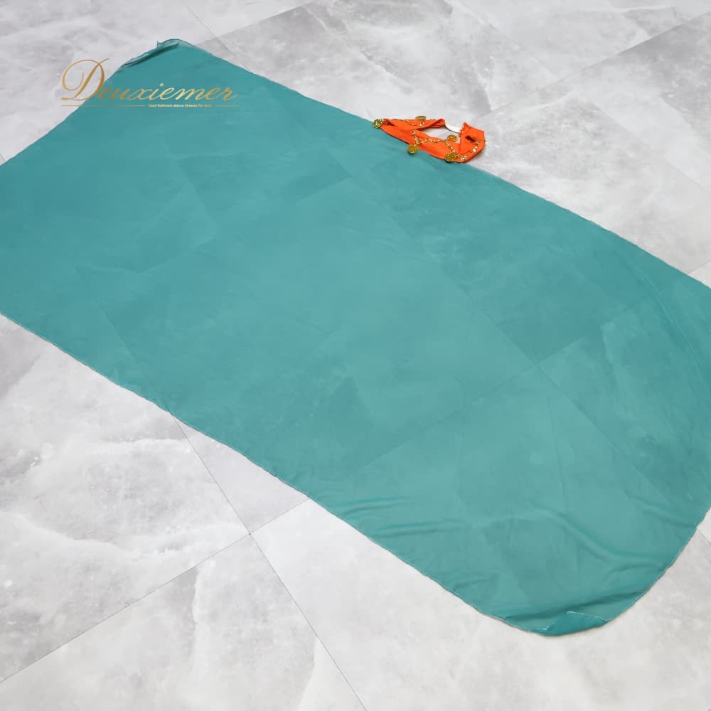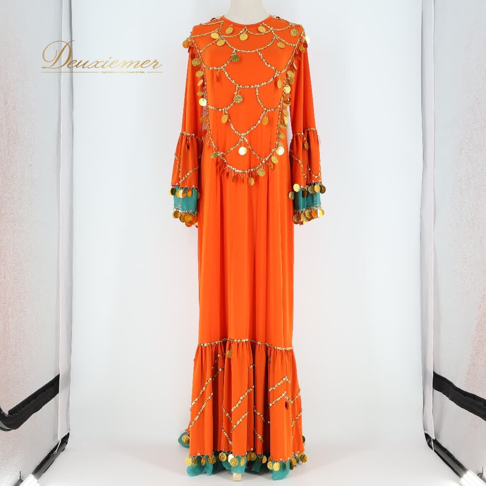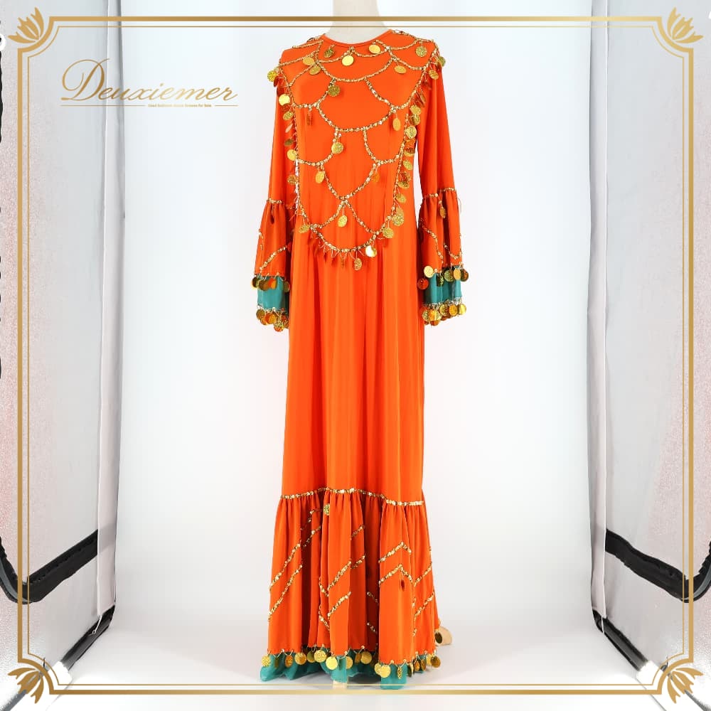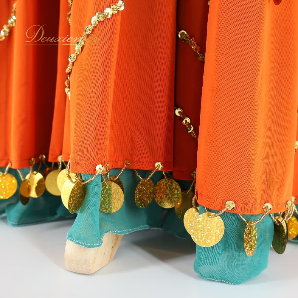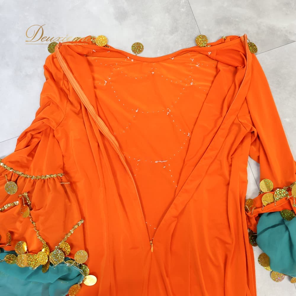 ベリーダンス 衣装 ワンピース ドレス オレンジ系 伸縮 ストレッチ 金 緑 華やか 装飾 ビーズ 練習 レッスン イベント ステージ スカーフ セット かわいい ダンス衣装 ダンス用 ゴールド系 グリーン系