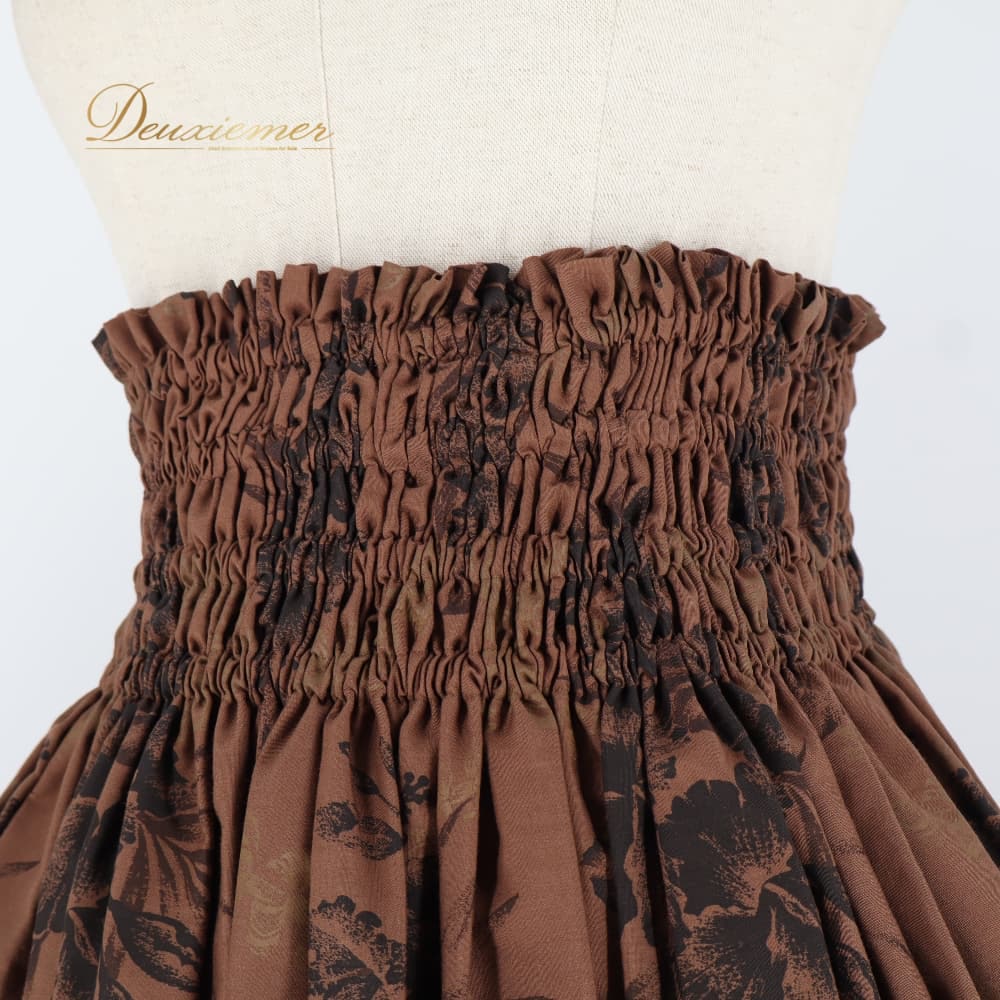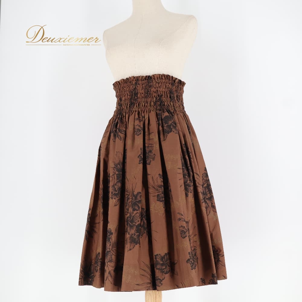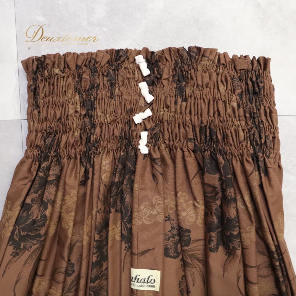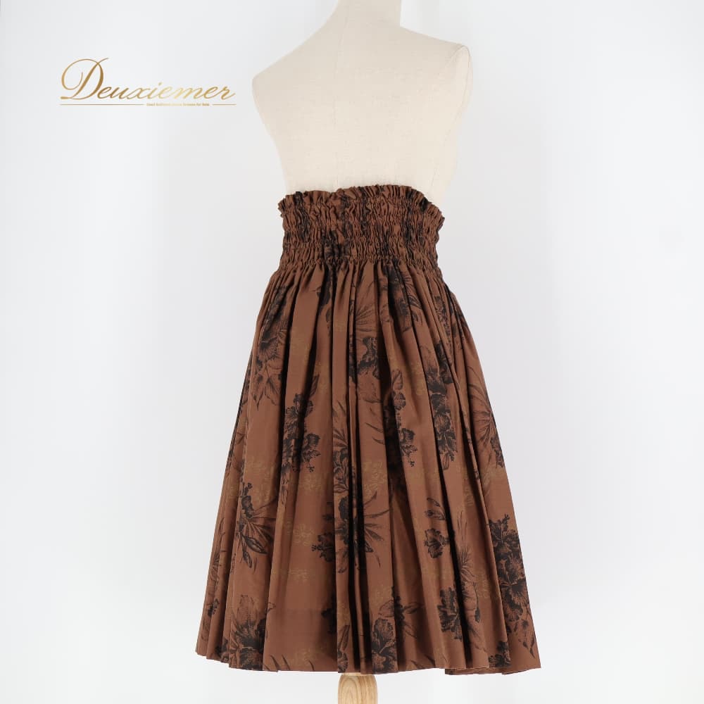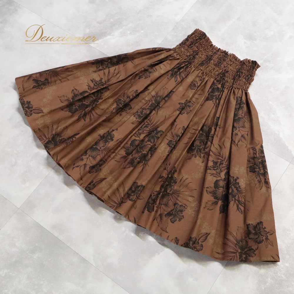 フラダンス 衣装 Mahalo マハロ パウスカート ブラウン系 日本製 ハイビスカス柄 花柄 植物柄 ハワイアンプリント フラワープリント アロハ フラ ダンス レッスン 練習 茶 シングル フレアスカート ブラック系 ベージュ系 黒 華やか おしゃれ かわいい 上品