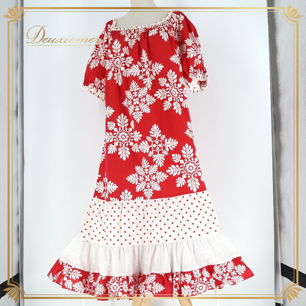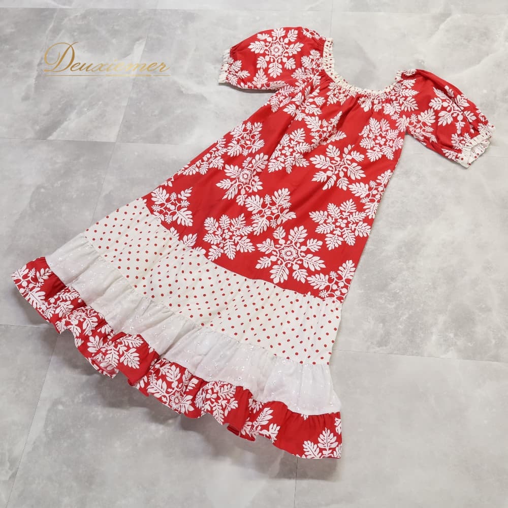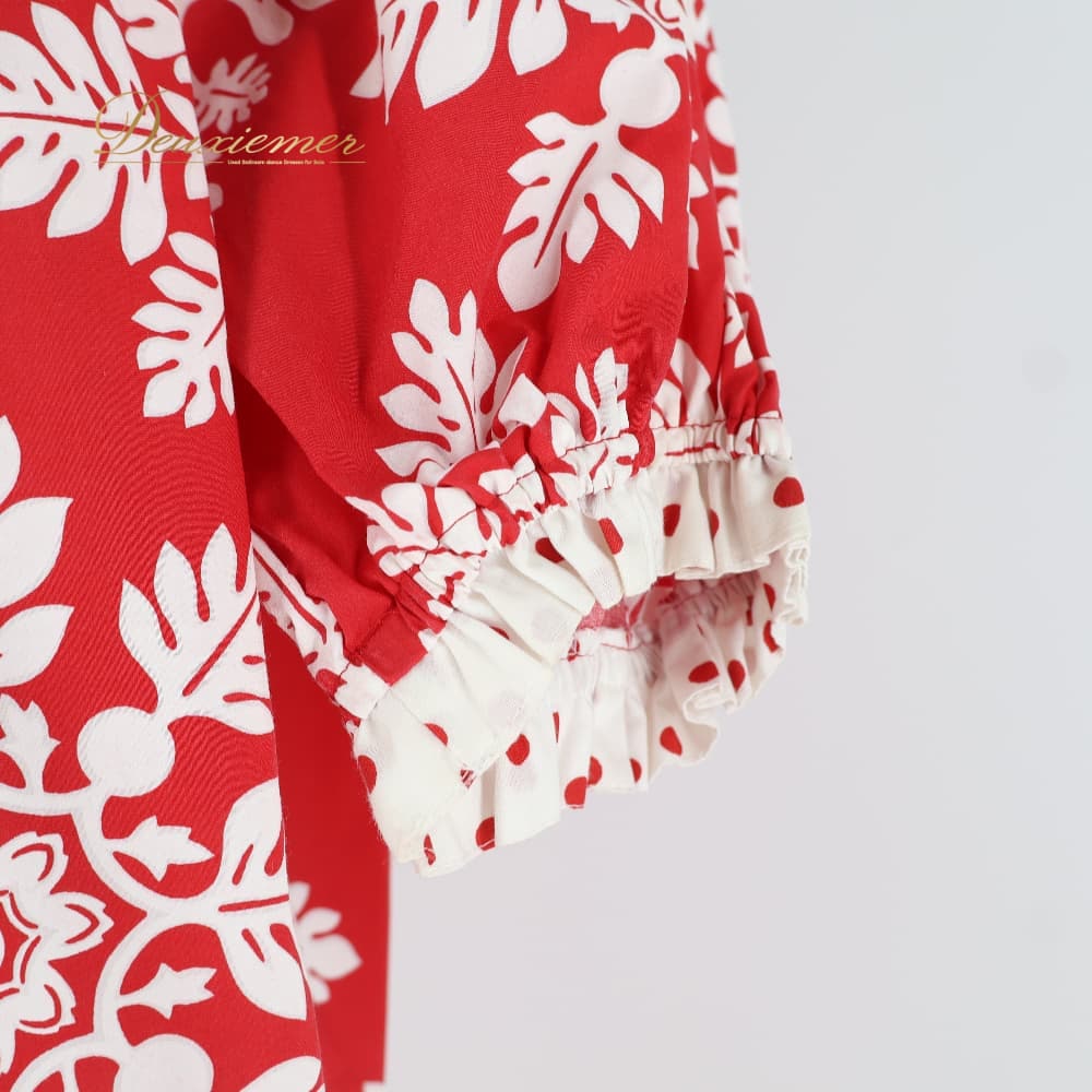 フラダンス 衣装 ワンピース ドレス レッド系 ハワイアンプリント 植物柄 花柄 ホワイト系 赤 白 ドット 水玉 レース フリル 華やか 鮮やか かわいい おしゃれ ハワイアン アロハ フラ ダンス レッスン 練習 レッスンウェア 練習着