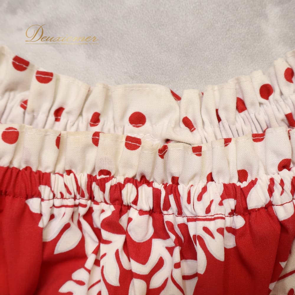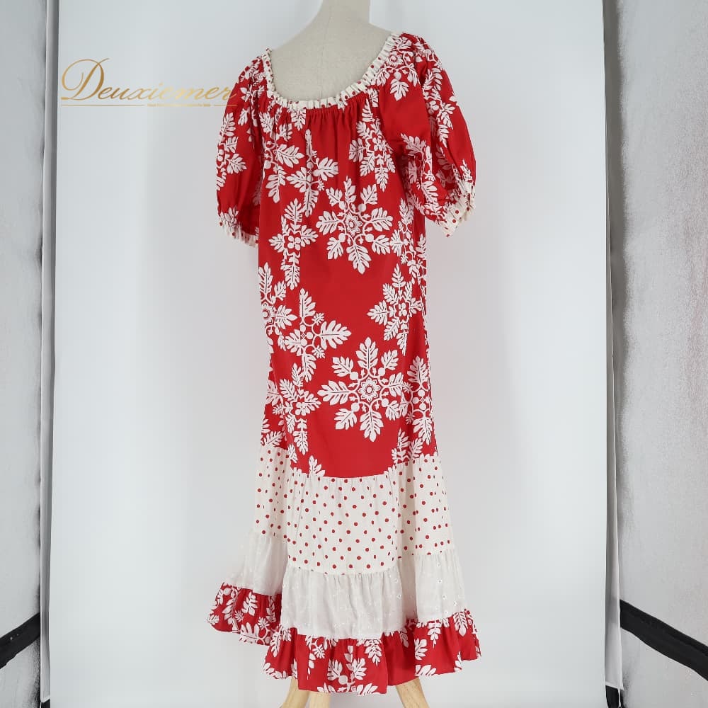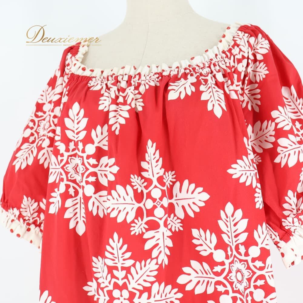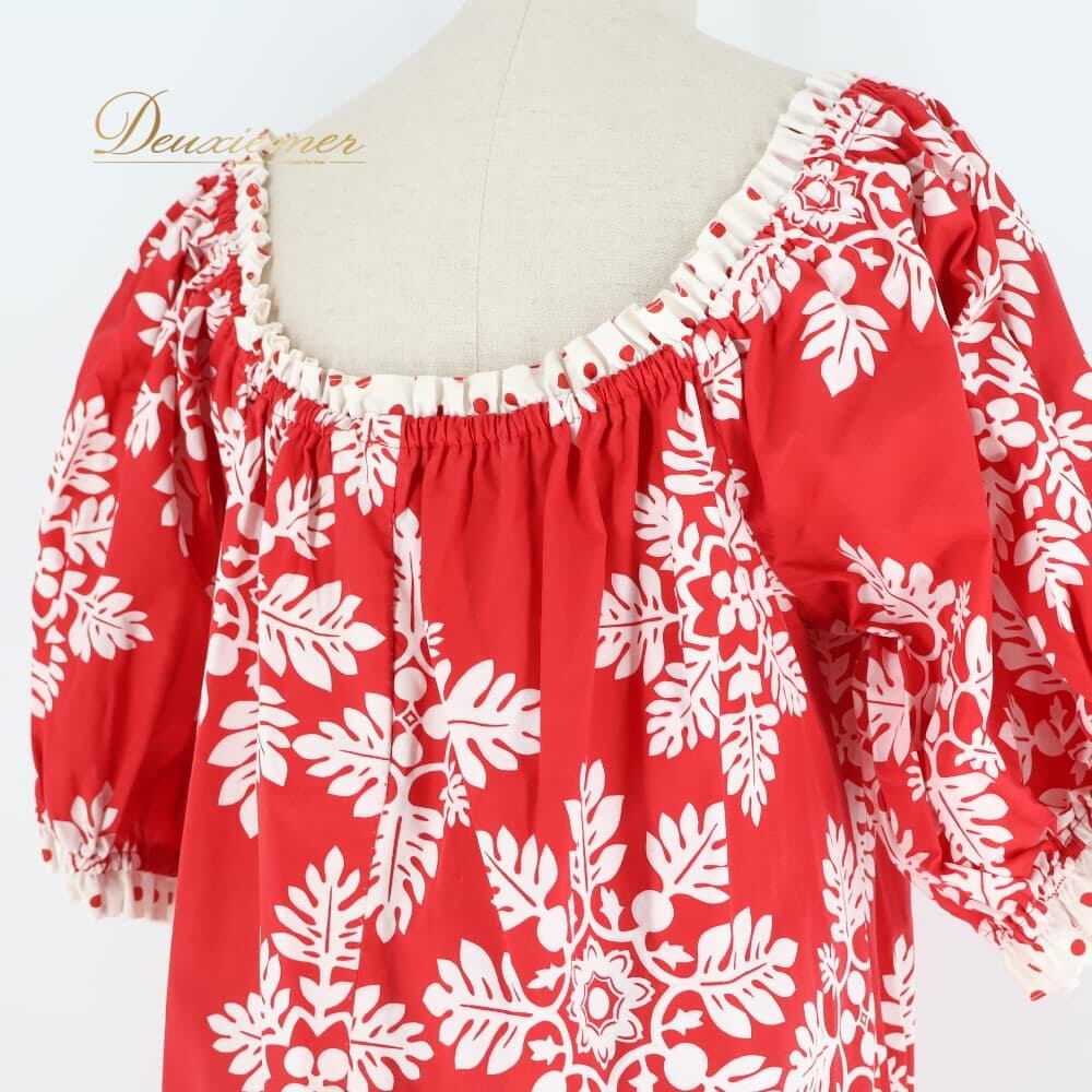 フラダンス 衣装 ワンピース ドレス レッド系 ハワイアンプリント 植物柄 花柄 ホワイト系 赤 白 ドット 水玉 レース フリル 華やか 鮮やか かわいい おしゃれ ハワイアン アロハ フラ ダンス レッスン 練習 レッスンウェア 練習着