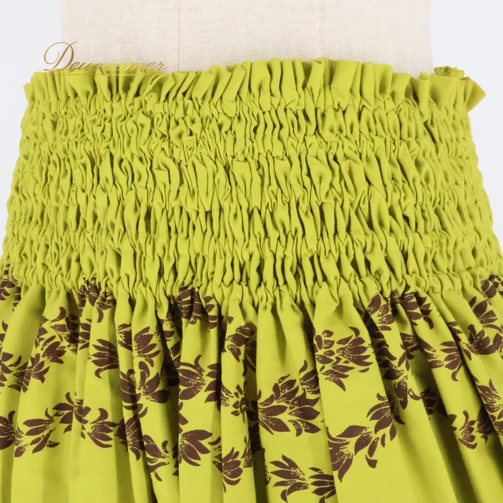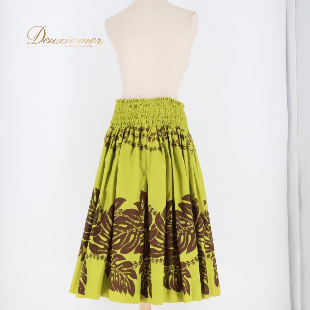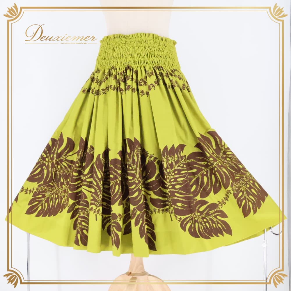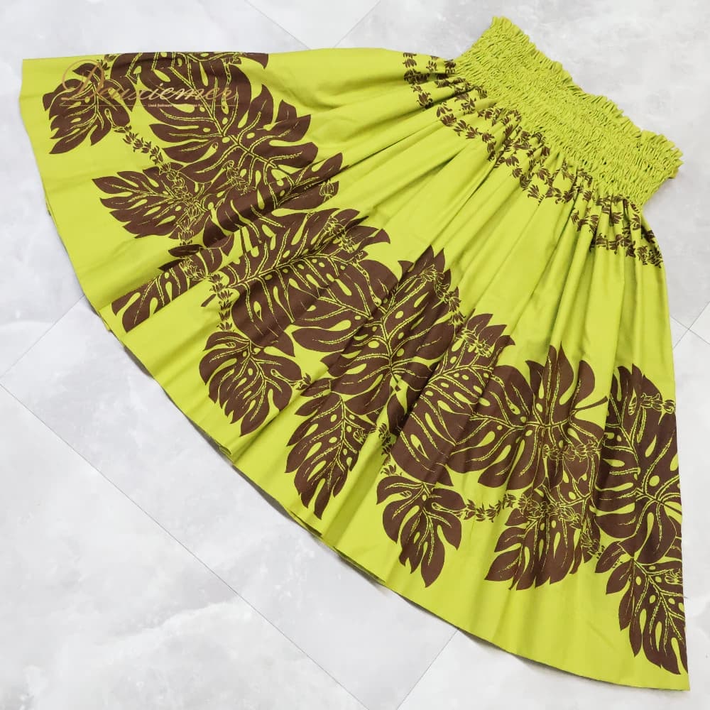 フラダンス 衣装 MAMAGON パウスカート グリーン系 ブラウン系 ツーカラー モンステラ柄 シングル シンプル かわいい 華やか 鮮やか 明るい 黄緑 茶 ハワイアン アロハ ハワイアンプリント フラ ダンス レッスン 練習 シングルスカート