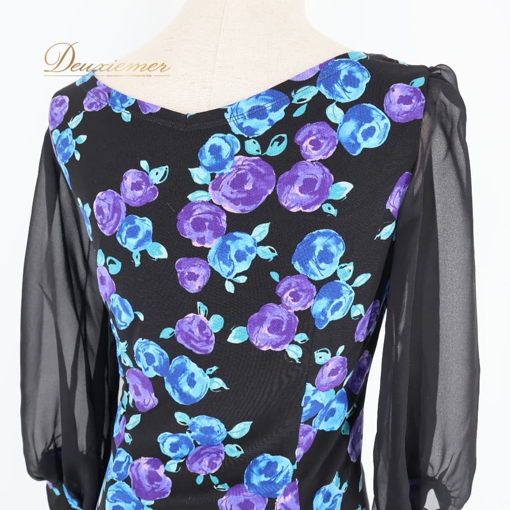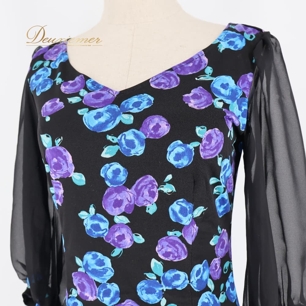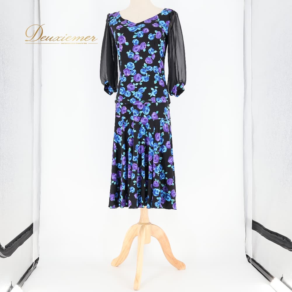 社交ダンス 衣装 Chacott チャコット ツーピース ブラック系 花 花柄 黒 青 紫 緑 上下セット セットアップ トップス スカート 上品 かわいい 華やか 透け感 ダンス衣装 イベント ステージ パーティー パープル系 ブルー系 グリーン系