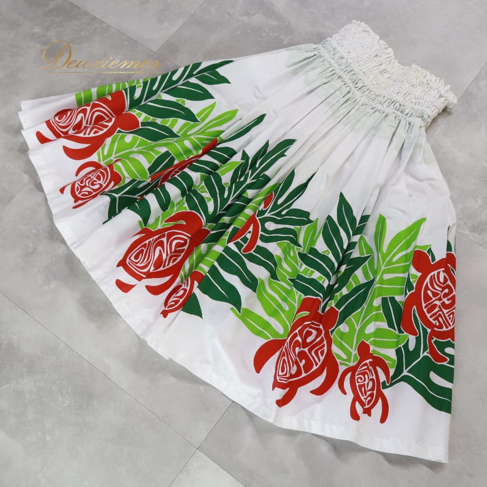 フラダンス 衣装 パウスカート ホワイト系 Hula Style モンステラ柄 ホヌ柄 ハワイアンプリント アロハ フラ ダンス レッスン 練習 白 赤 緑 黄緑 シングル スカート フレア レッド系 グリーン系 華やか 鮮やか かわいい おしゃれ 上品 ハワイアンダンス