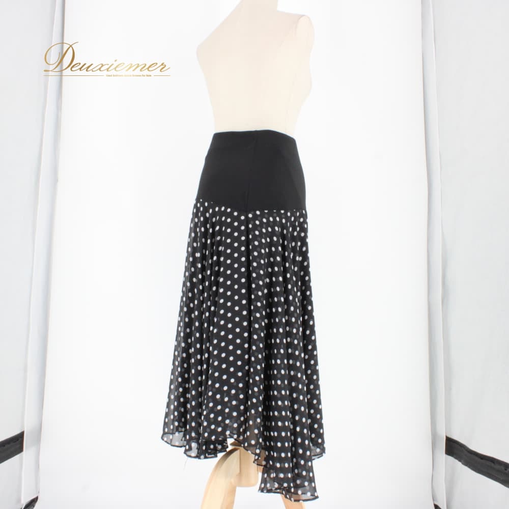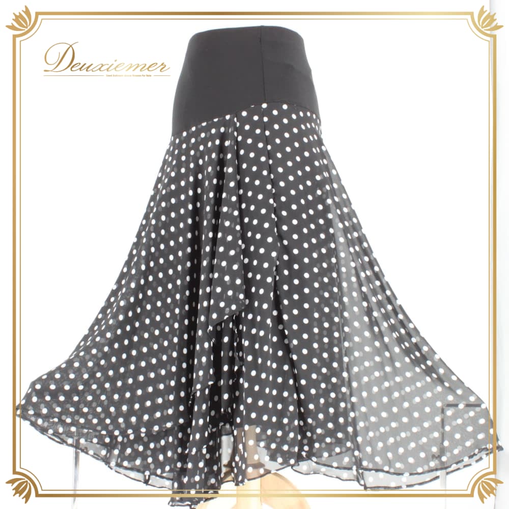 社交ダンス 衣装 ICHIOKU イチオク スカート レッスンウェア ブラック系 ホワイト系 水玉 練習着 ドット スタンダード フォーマル 透け感 上品 大人っぽい きれいめ シック 華やか エレガント レディース オールシーズン ソシアルダンス ボールルームダンス ドット柄 競技 練習用 スカート丈 ミディ丈 コーデ 柄物 ダンス衣装 ロングスカート風 裾広がり フレア シフォン風 体型カバー おしゃれ レトロかわいい サイズ表記なし 伸縮性あり ウエストゴム 86cm丈