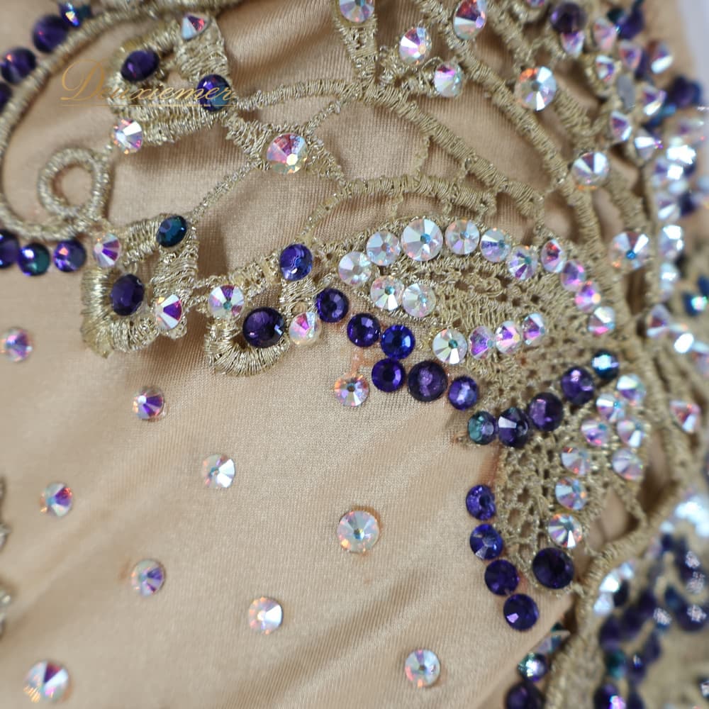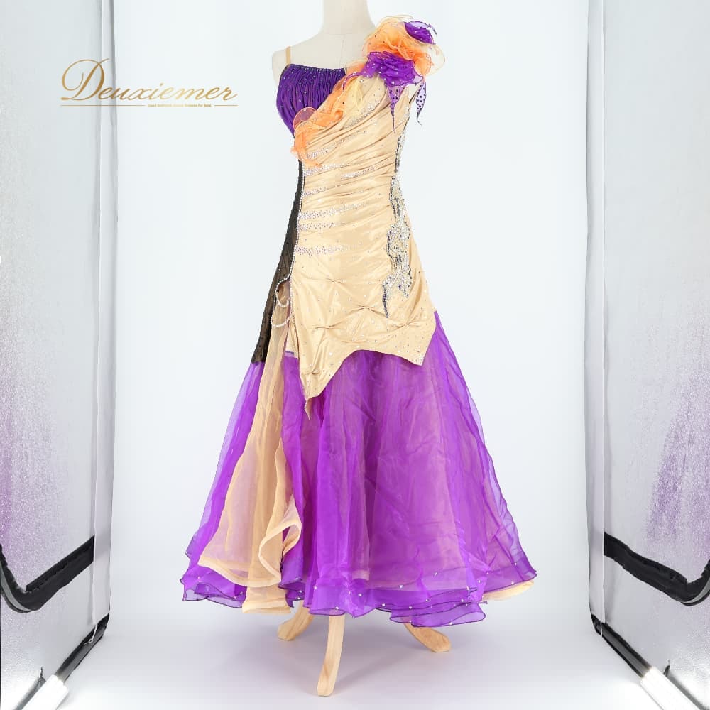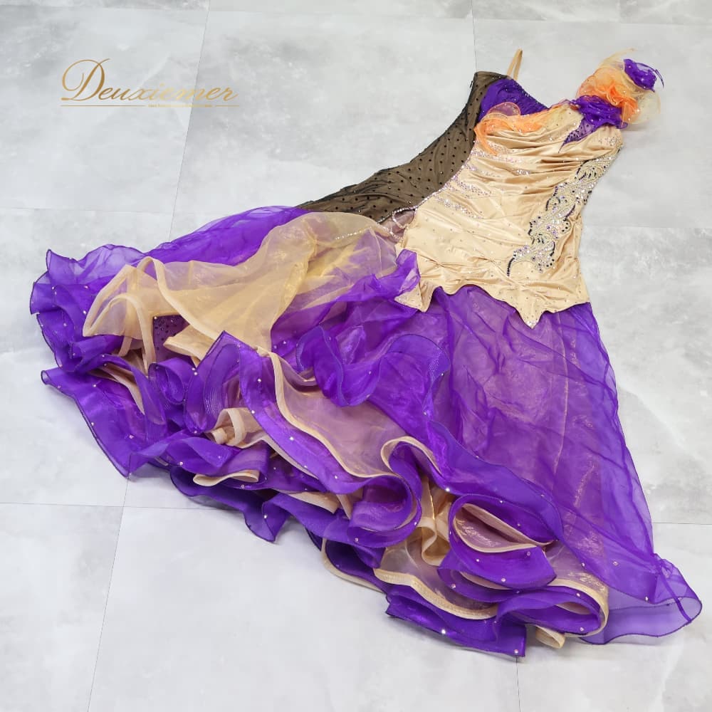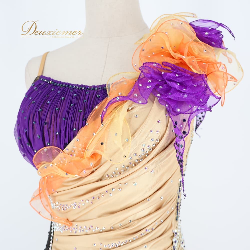 社交ダンス 衣装 KAORI カオリ ドレス ワンピー パープル系 フリル 競技用 デモ 紫 金 ラインストーン 光沢 上品 華やか ボリューム かわいい キラキラ 袖なし ダンス衣装 イベント ベージュ系 ゴールド系