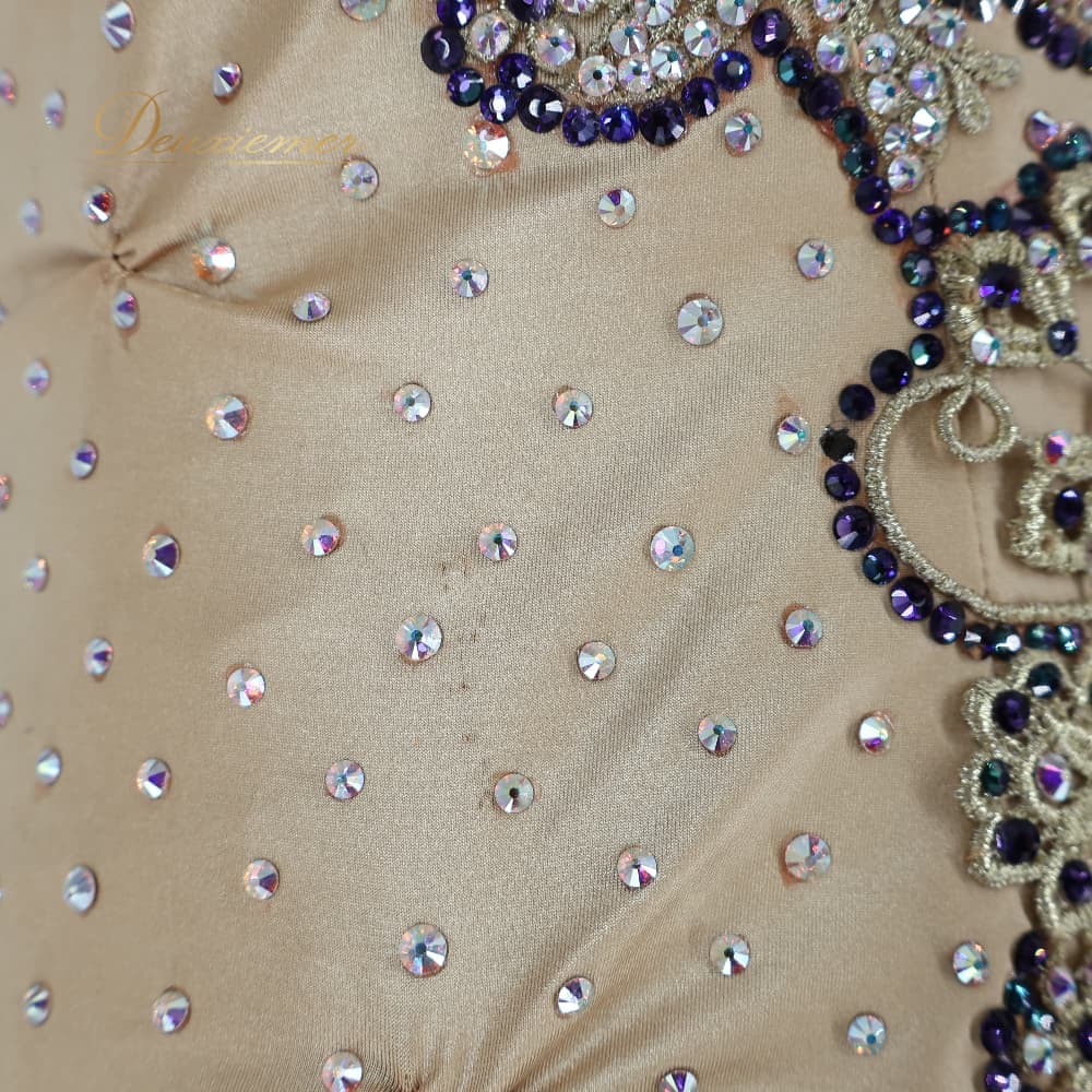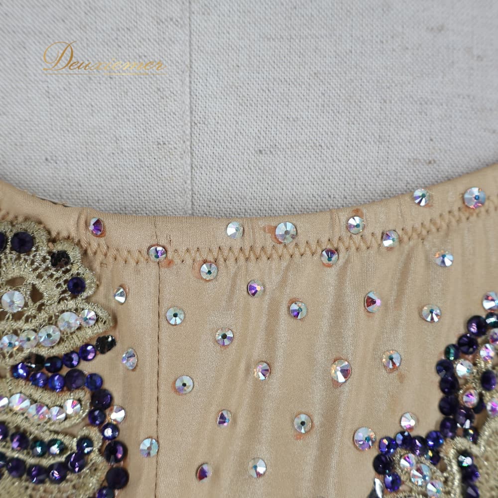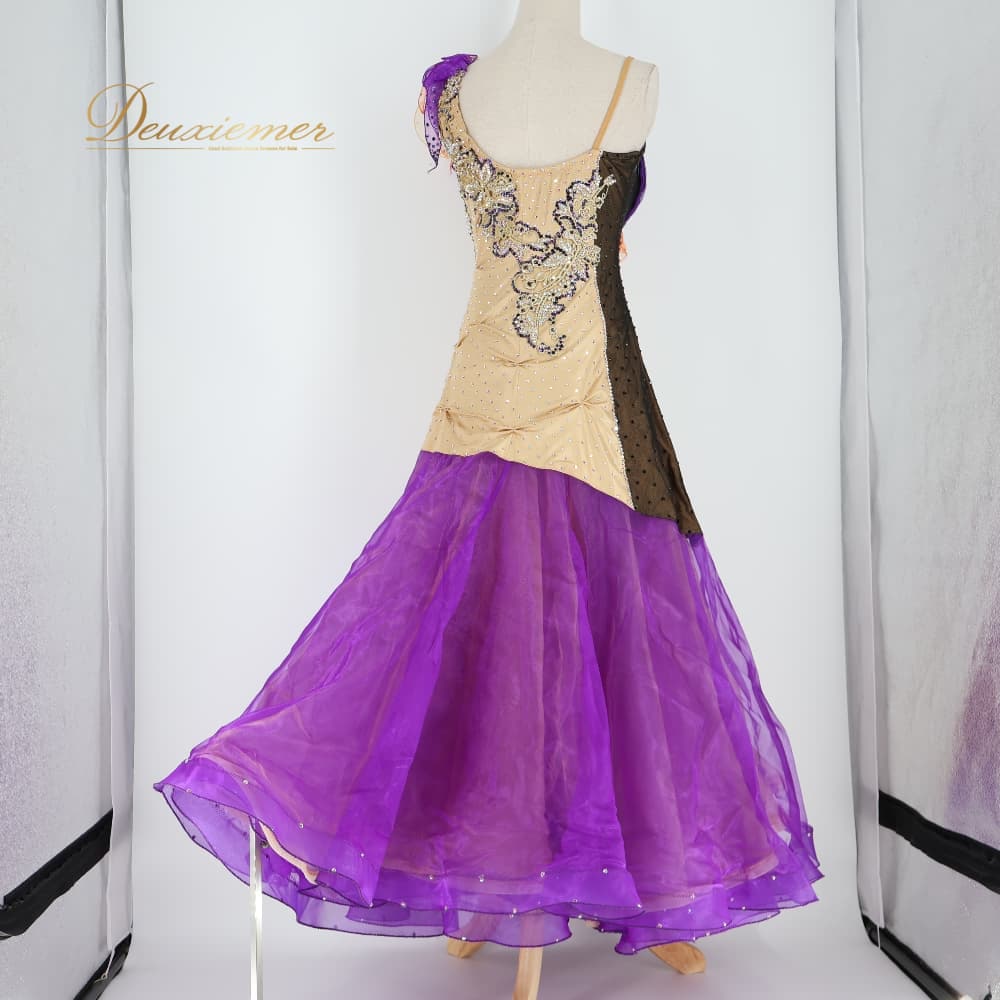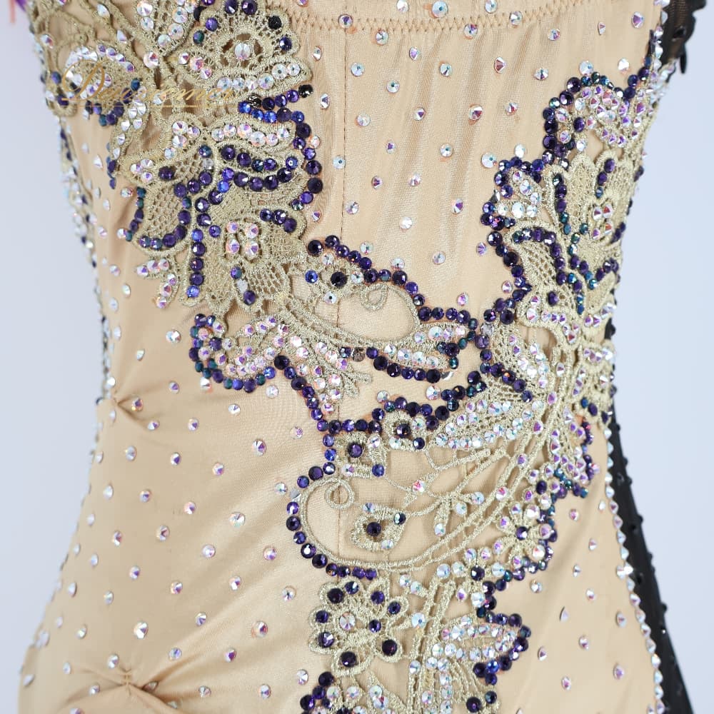 社交ダンス 衣装 KAORI カオリ ドレス ワンピー パープル系 フリル 競技用 デモ 紫 金 ラインストーン 光沢 上品 華やか ボリューム かわいい キラキラ 袖なし ダンス衣装 イベント ベージュ系 ゴールド系