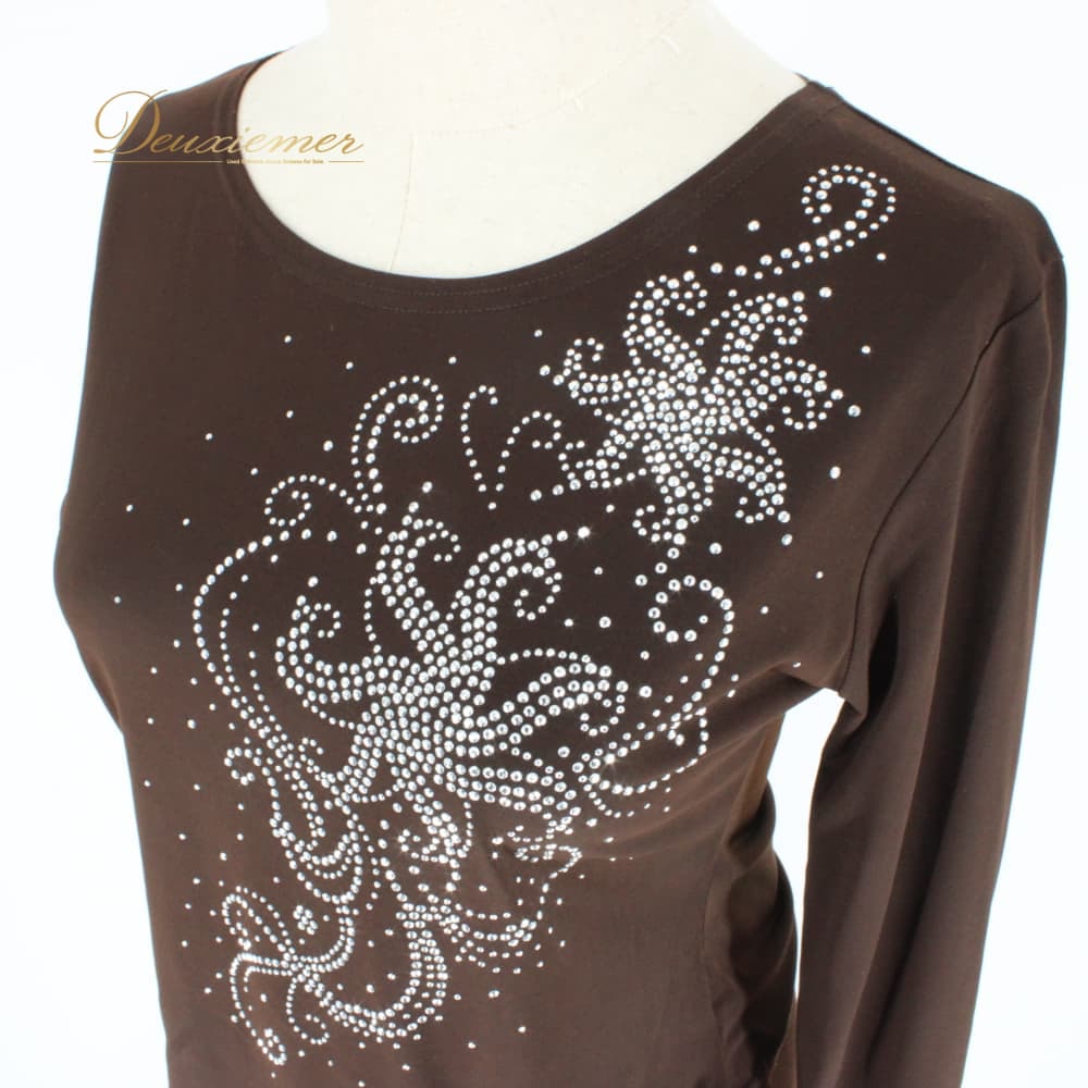 社交ダンス 衣装 Leirena レイリーナ ツーピース レッスンウェア ブラウン系 茶色 ラインストーン スタンダード セットアップ 上下セット トップス スカート ステージ衣装 発表会 上品 大人っぽい きれいめ 華やか エレガント 長袖 フォーマル シック