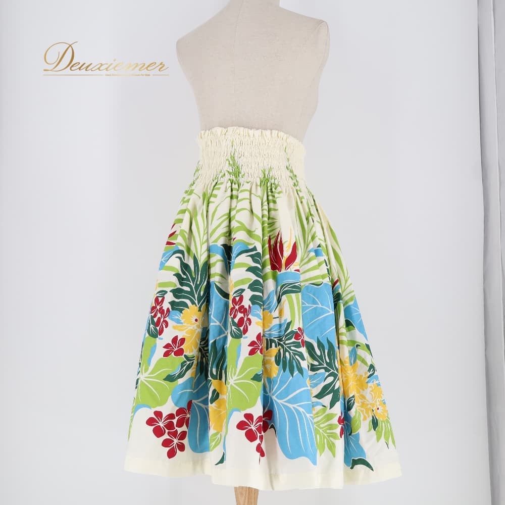 フラダンス 衣装 パウスカート ホワイト系 プルメリア柄 モンステラ柄 花柄 植物柄 ハワイアンプリント アロハ フラ ダンス レッスン 練習 シングル フレア スカート 華やか 鮮やか かわいい おしゃれ 白 緑 黄緑 水色 黄 赤 レッド系 ブルー系 グリーン系 イエロー系
