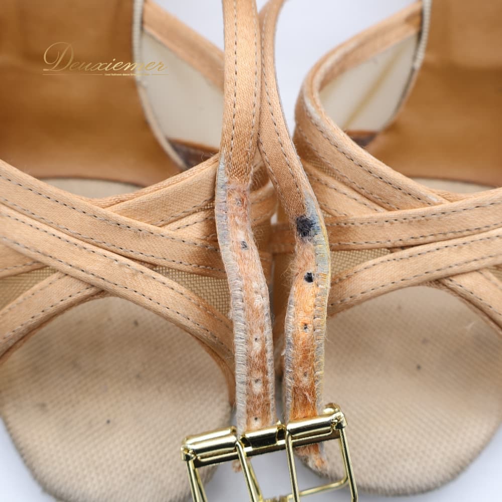かかとに小さな穴有り。ストラップを通す部分生地が裂けております。