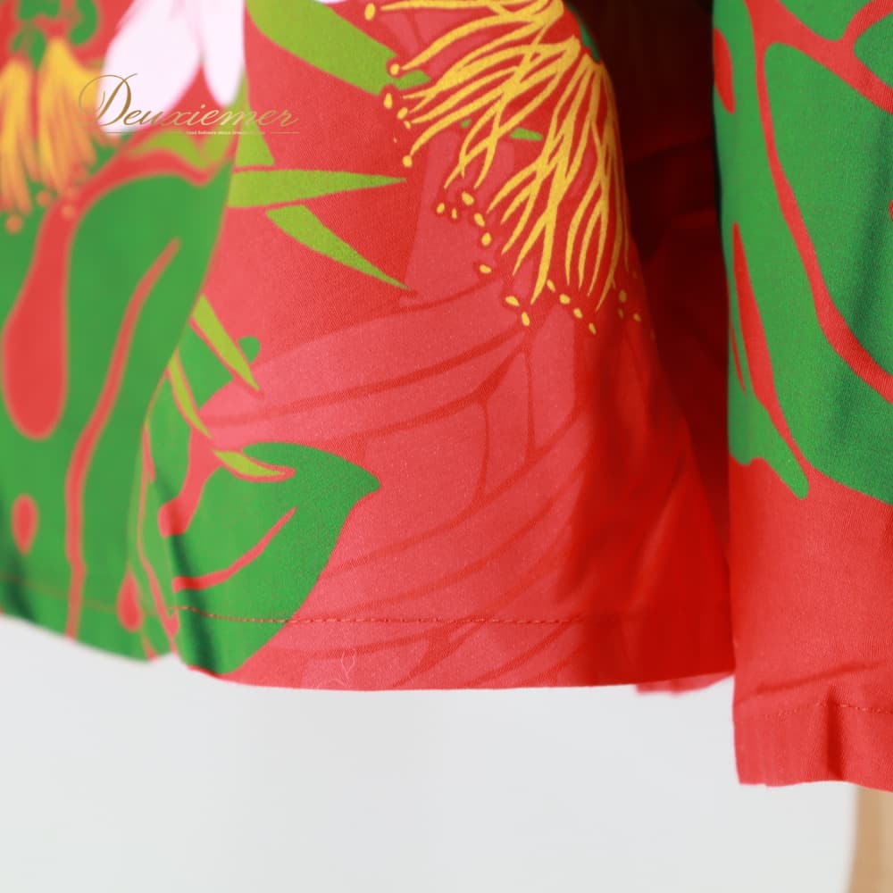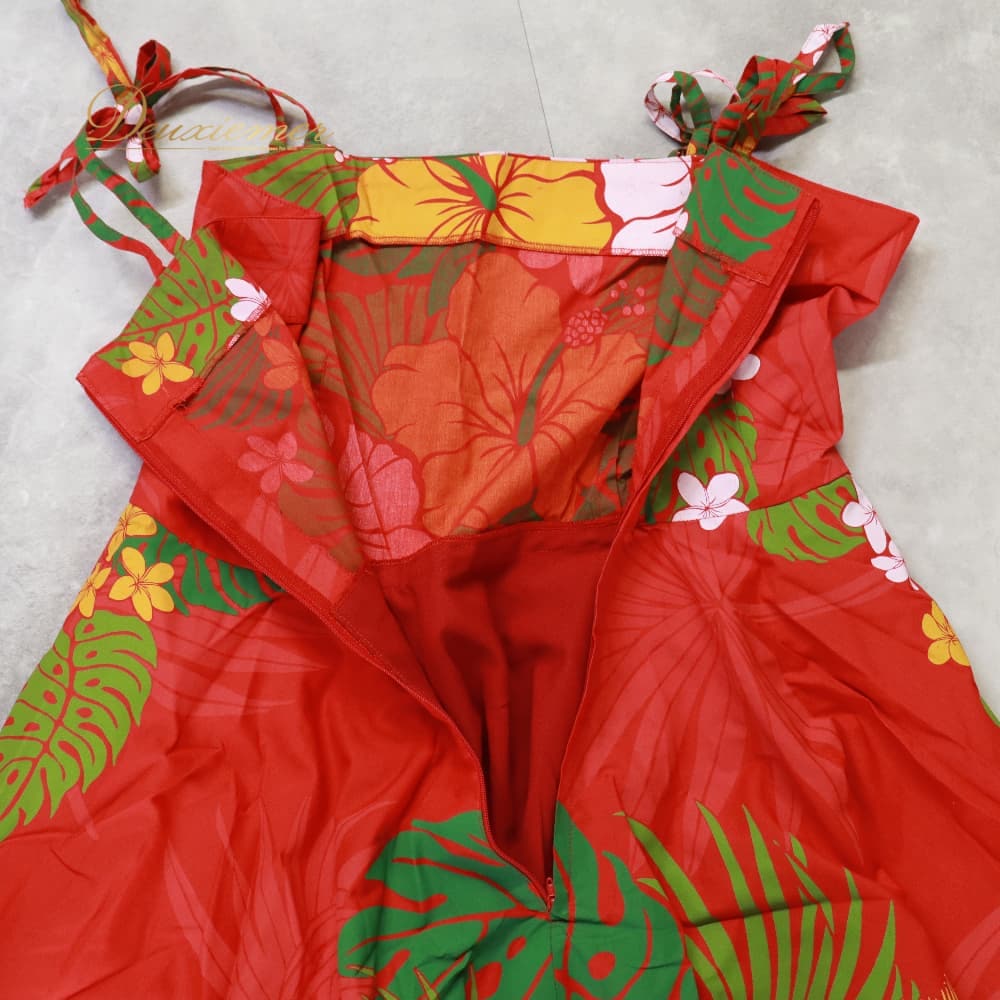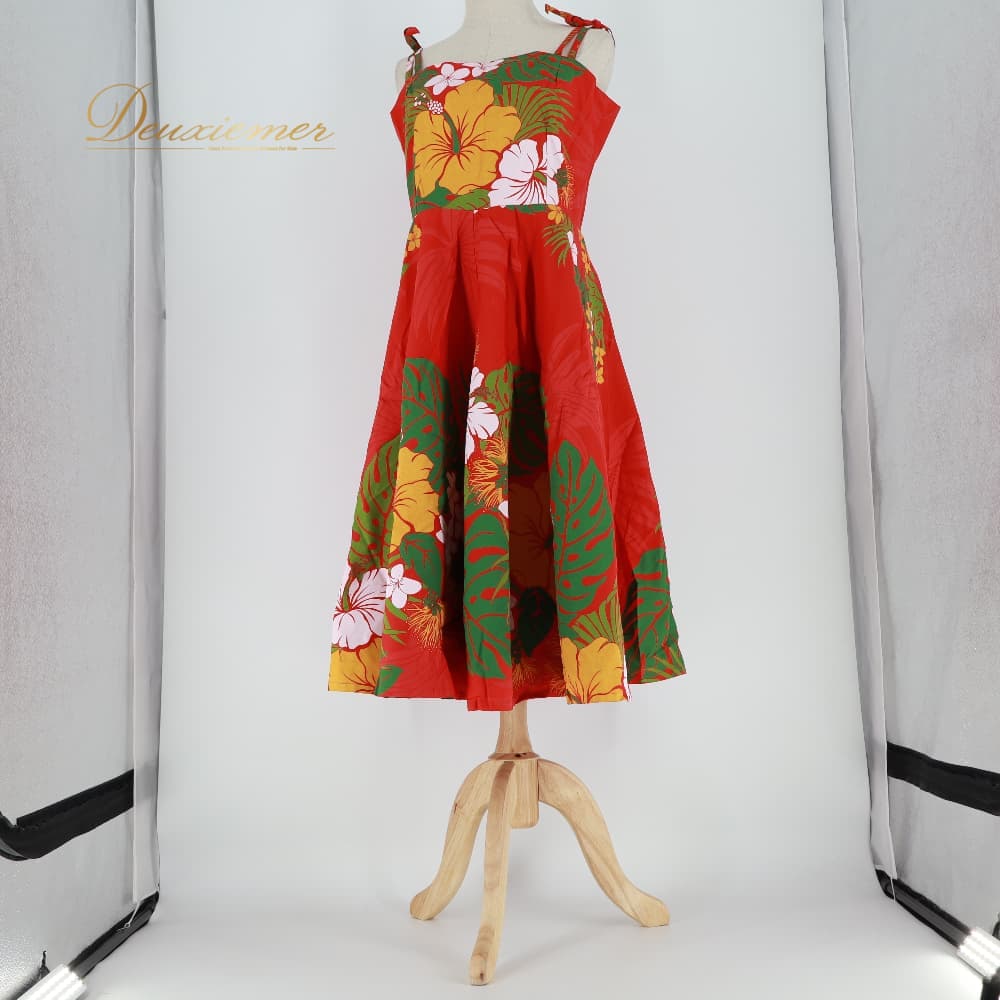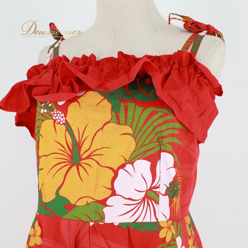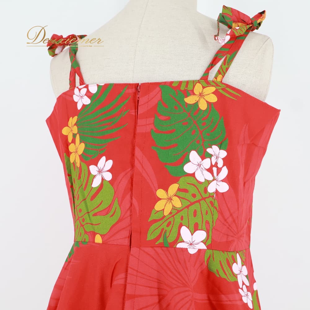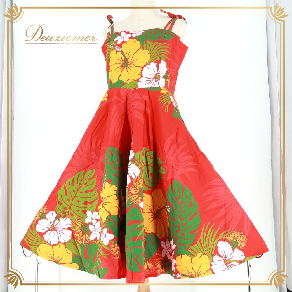 フラダンス 衣装 ワンピース ドレス レッド系 赤 ハイビスカス柄 モンステラ柄 プルメリア柄 ハワイアンプリント 花柄 植物柄 キャミソールドレス リボン フリル アロハ フラ ダンス レッスン 練習 ホワイト系 グリーン系 イエロー系 華やか 鮮やか フレアスカート かわいい おしゃれ