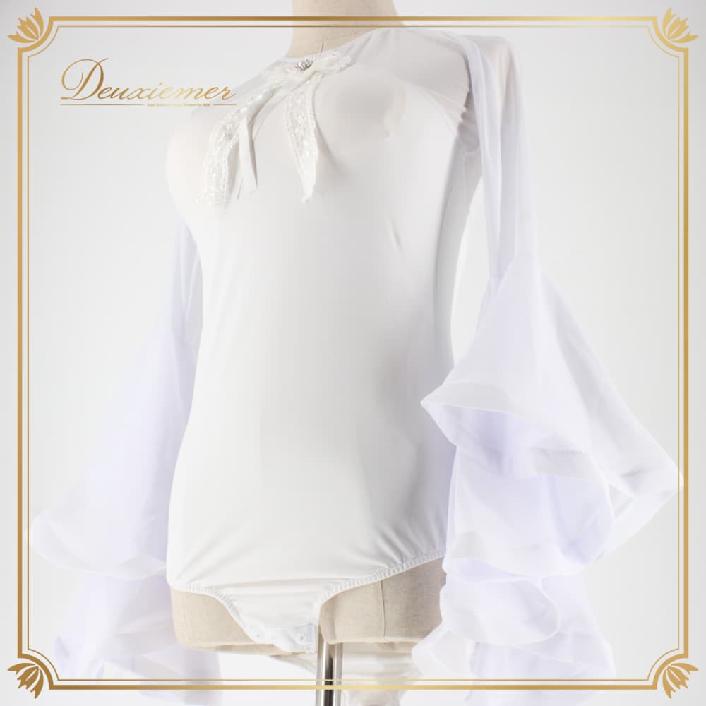 #レオタード #オールホワイト #ホワイトコーデ #ボタン付き #リボンデザイン #胸元アクセント #バレエ衣装 #ダンス衣装 #新体操 #体操 #ヨガウェア #フィットネス #伸縮性あり #肌にやさしい #胸パッド付き #肩パッドなし #スタジオコーデ #トルソー撮影 #白トップス #ENUTSU
