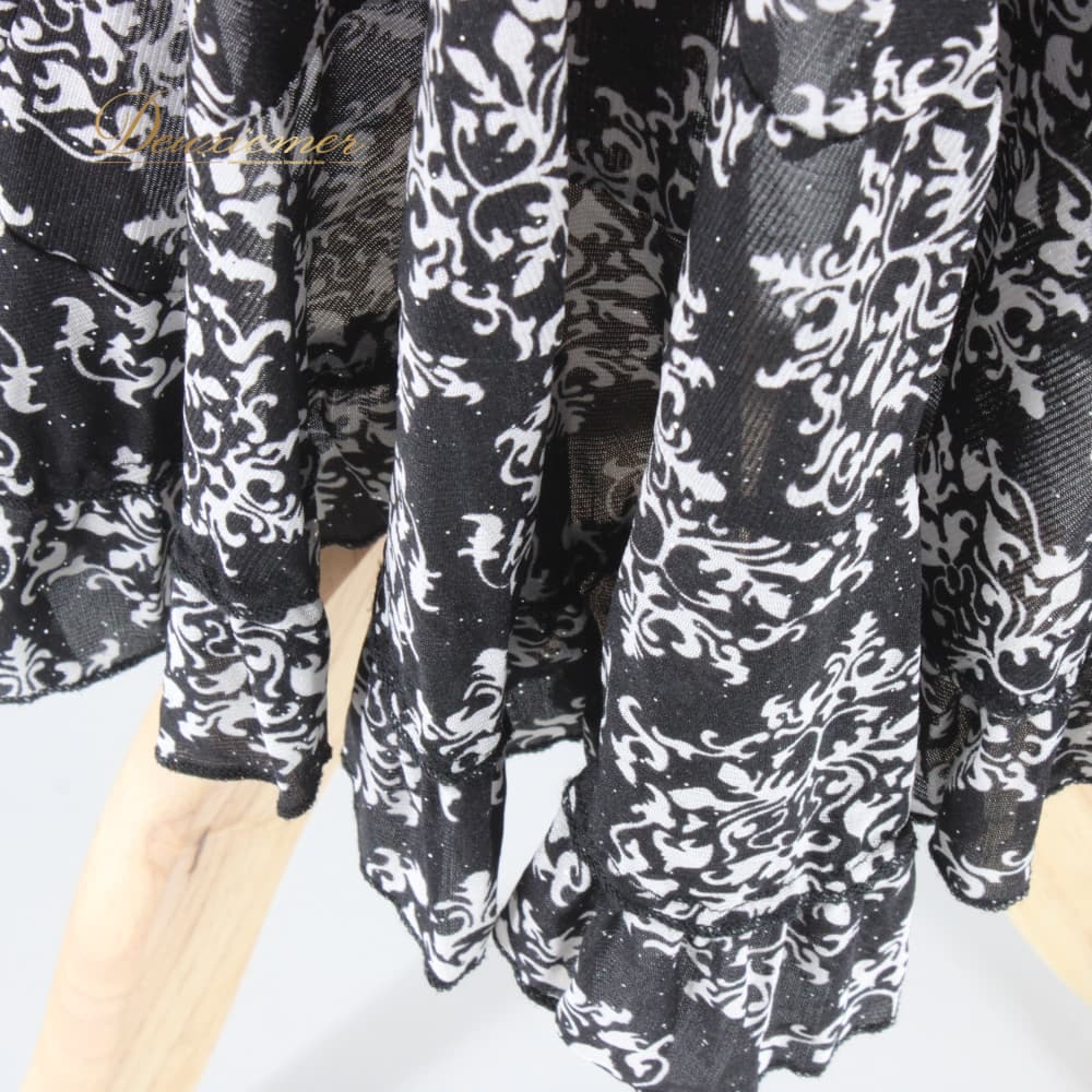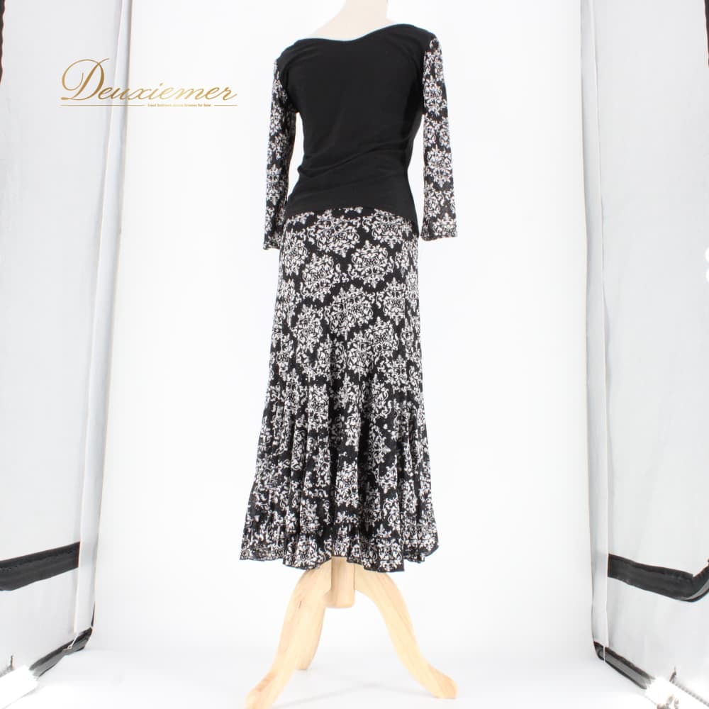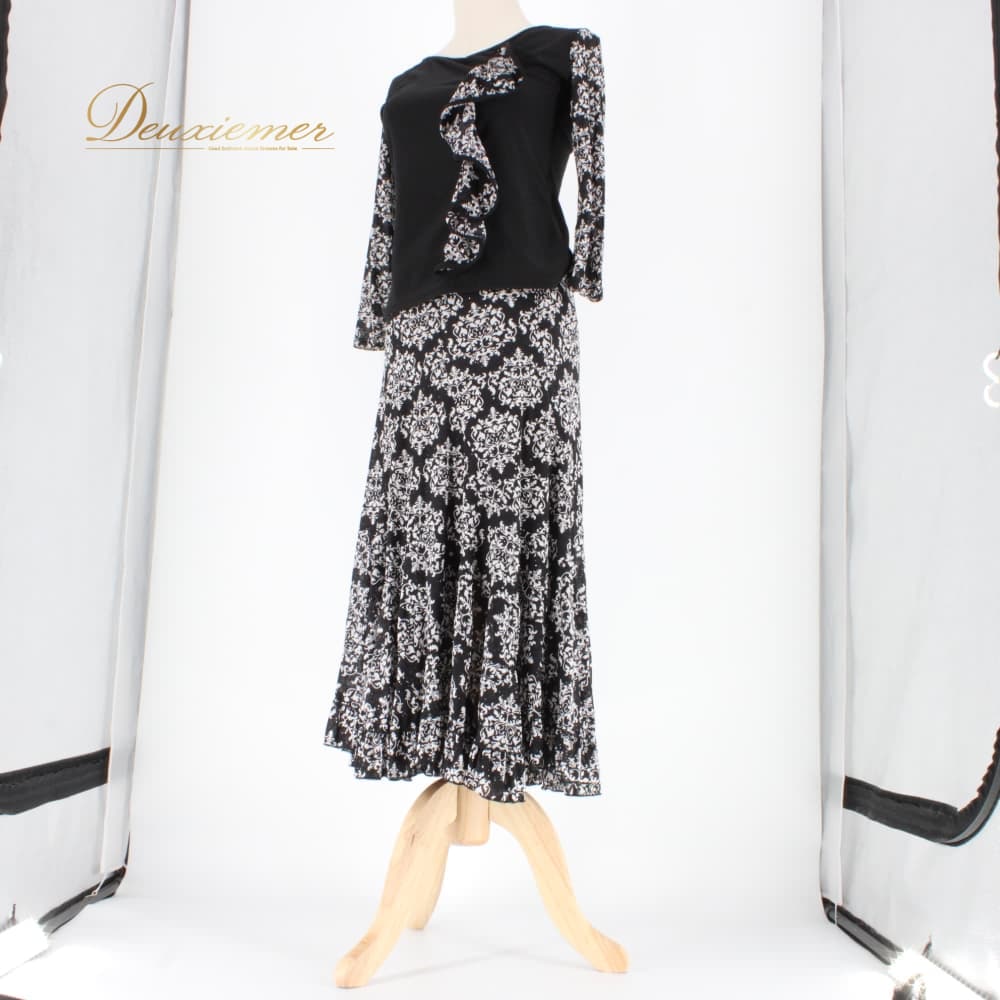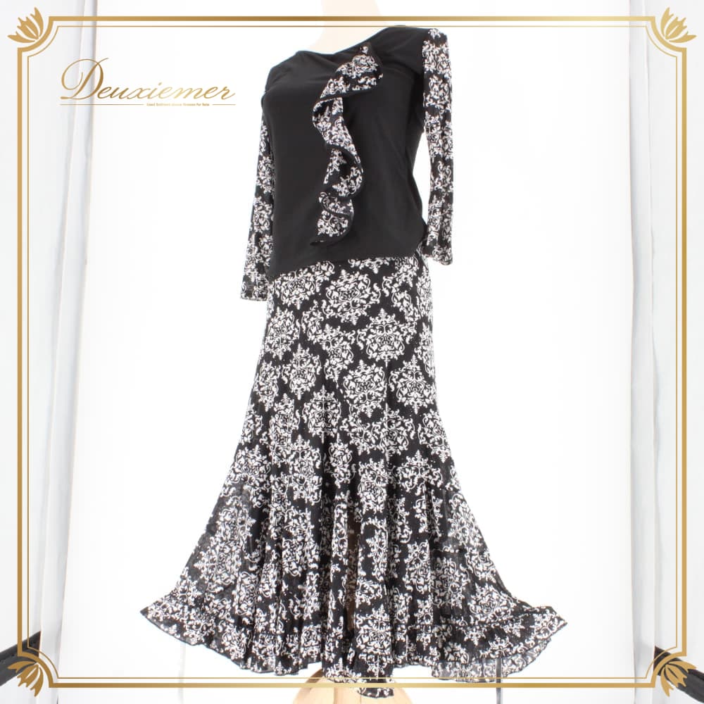 社交ダンス 衣装 ICHIOKU イチオク ツーピース レッスンウェア ブラック系 ホワイト系 黒 白 セットアップ 上下セット トップス スカート フォーマル 上品 シック スタイリッシュ スタンダード 練習着 気品 大人っぽい きれいめ モノトーン 服 2点セット 長袖 フリル ひざ丈 柄 総柄 ペイズリー風 エレガント 大人 女性 モダン 黒白 コーデ タンゴ ドレス 体型カバー ストレッチ おしゃれ シルエット 女性用