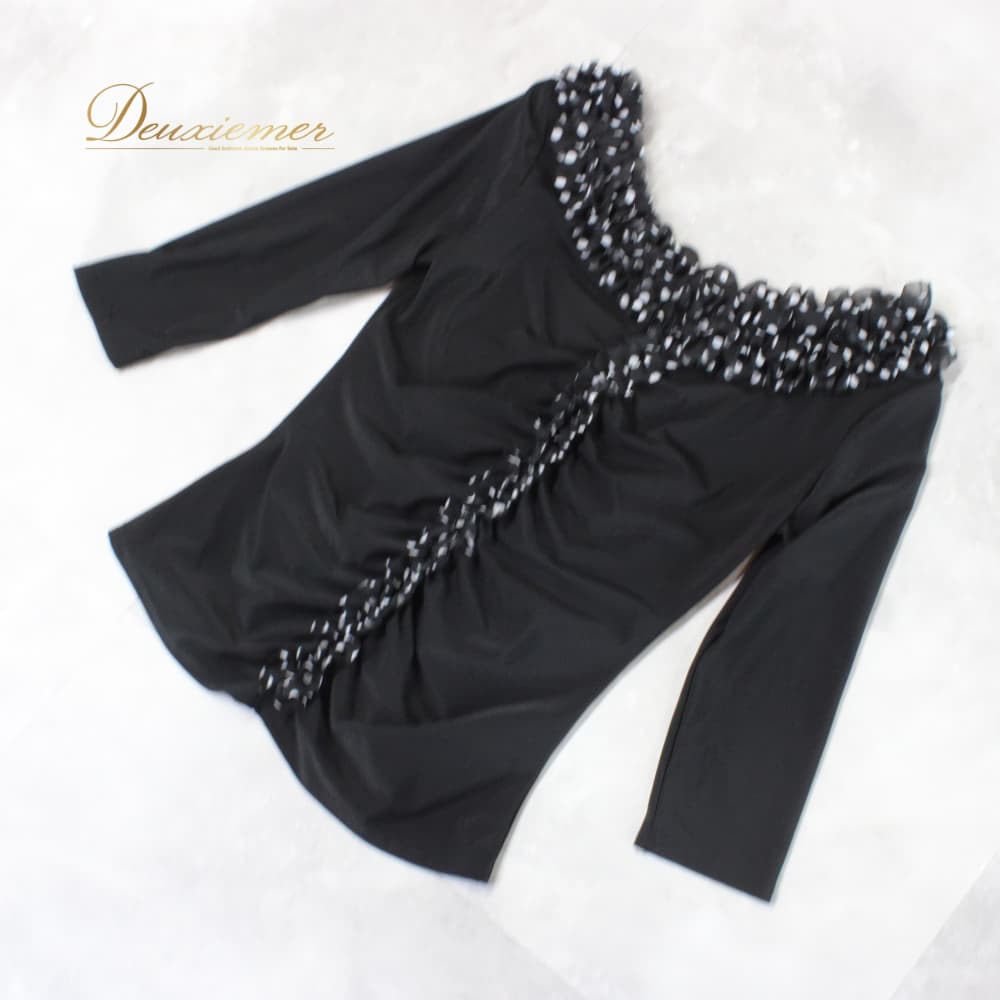 #ICHIOKU #イチオク #ドット柄 #レトロかわいい #ブラックコーデ #ホワイトコーデ #モノトーン #大人ガーリー #ガーリー #カジュアル #きれいめカジュアル #伸縮性あり #ストレッチ #ノーパッド #オシャレ #ファッションコーデ #レディースファッション #トップス #ワンピース風 #ENUTSU