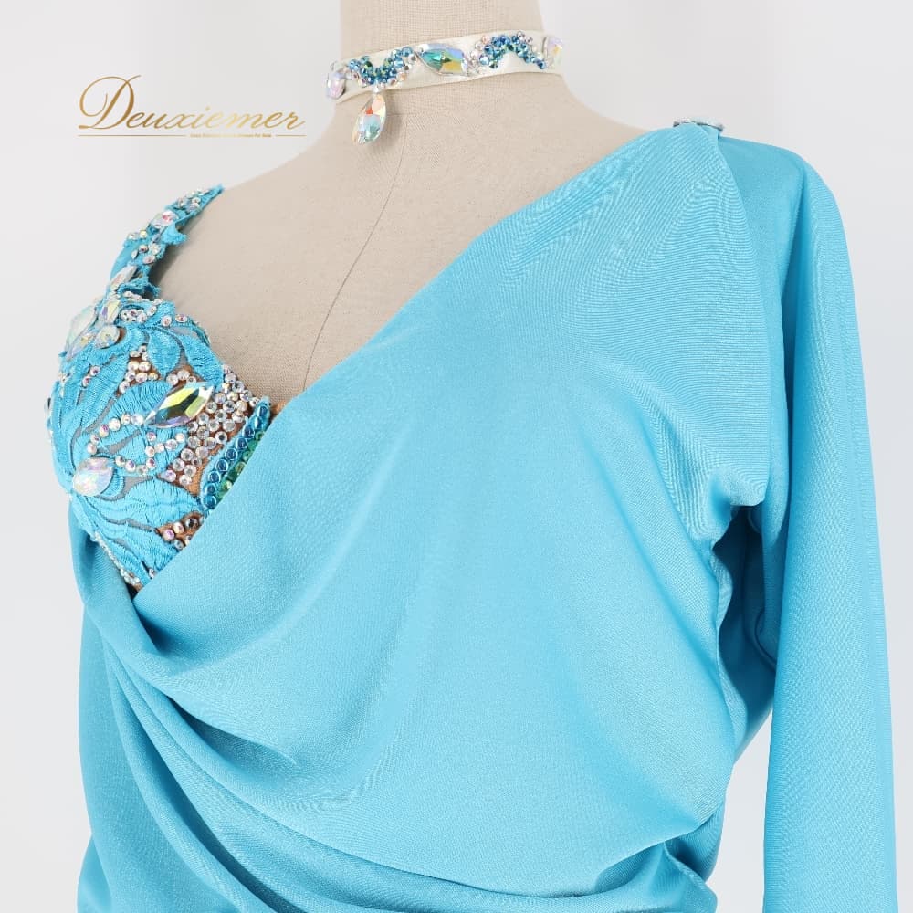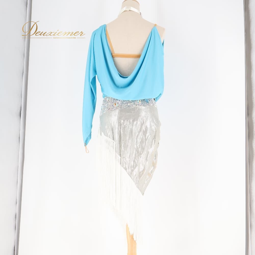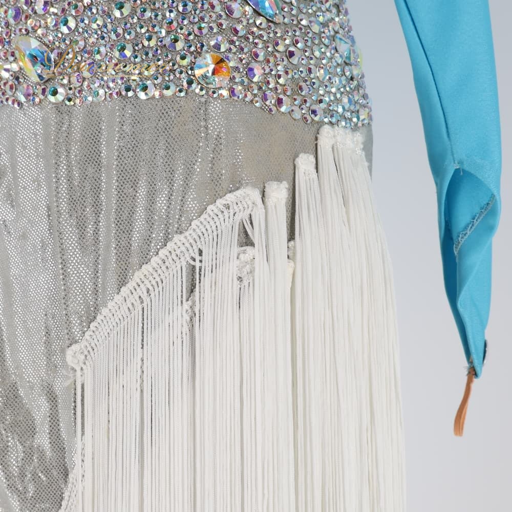 社交ダンス 衣装 ドレス ワンピース ラテン ホワイト系 ブルー系 シルバー系 水色 白 デモ 競技 ダンス パーティ 発表会 フリンジ キラキラ 光沢 ステージ衣装 エレガント
