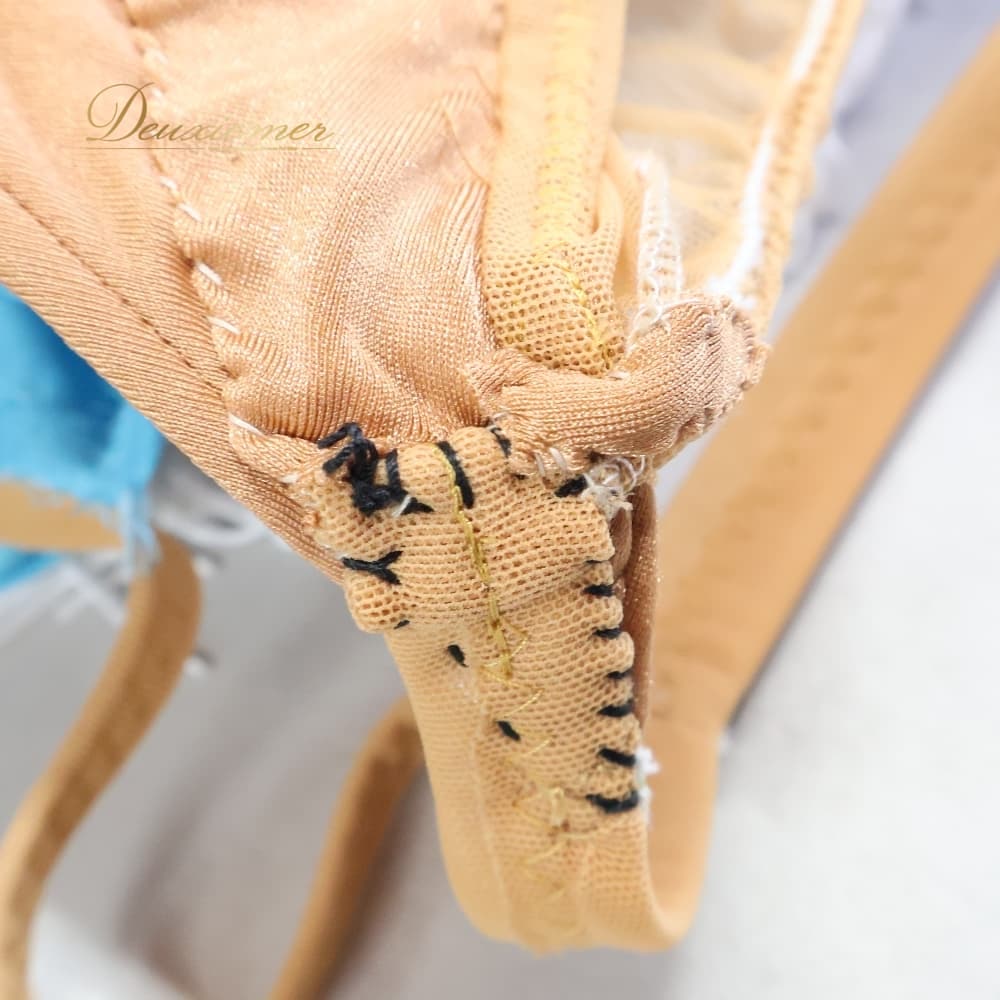 肩紐等短くなるように縫い付けられている箇所、肩脇周り補正跡御座います。