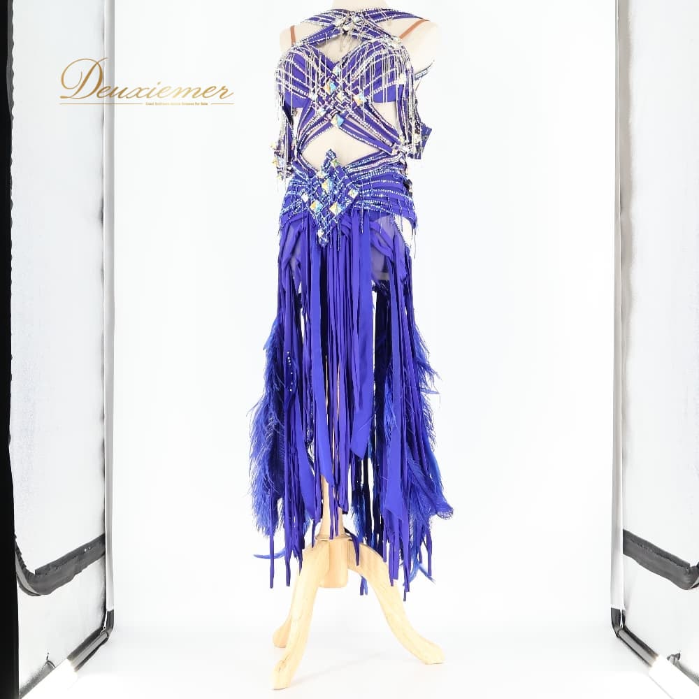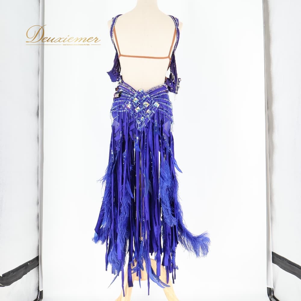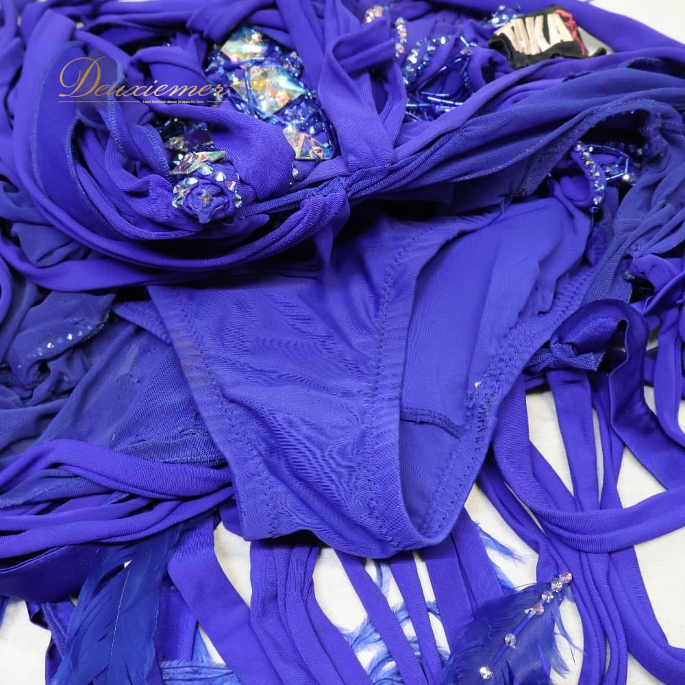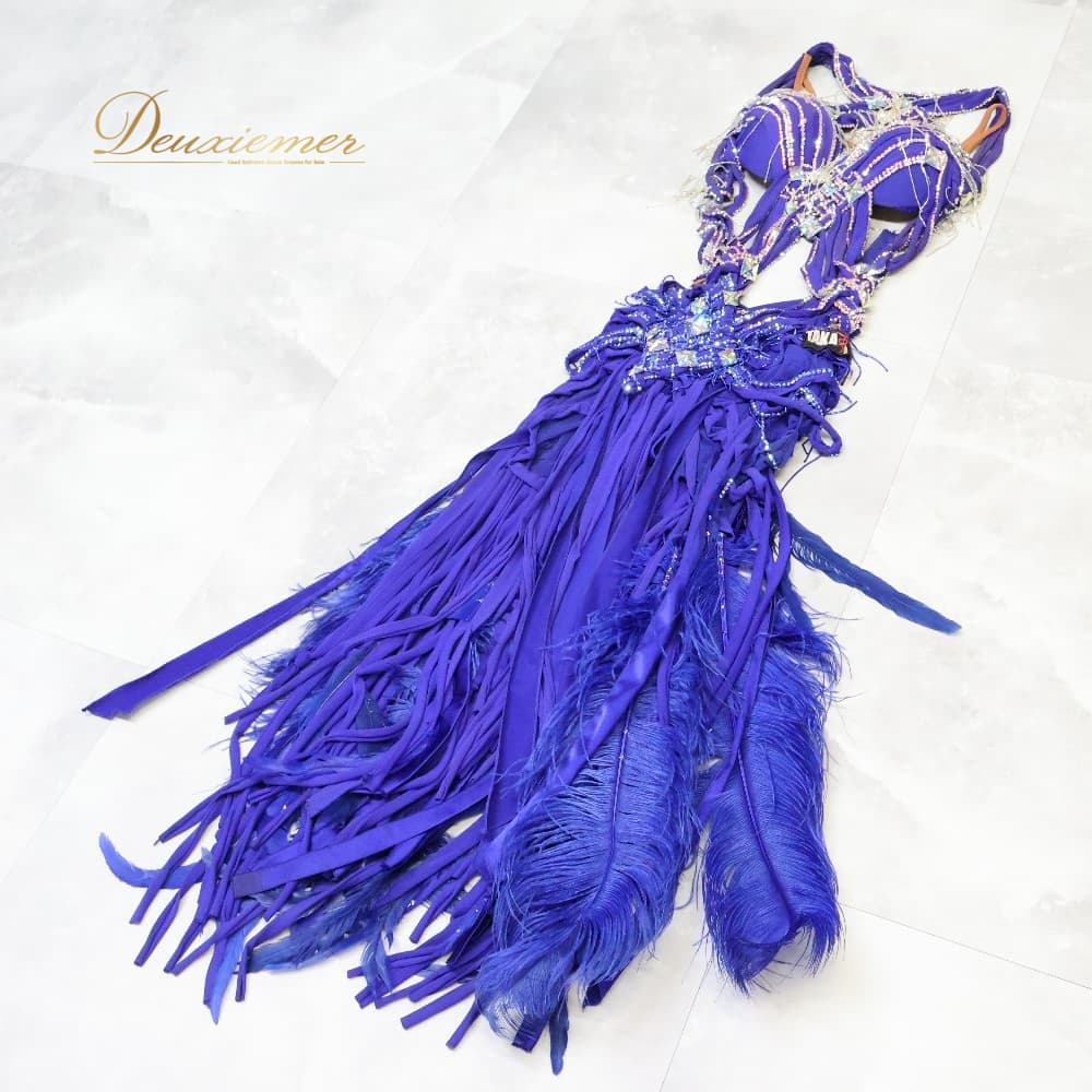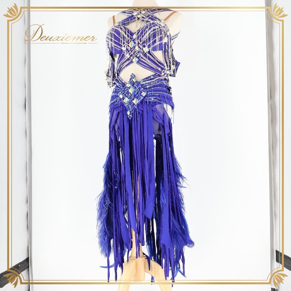 社交ダンス 衣装 TAKA DANCE タカダンス ドレス ワンピース ラテン パープル系 ブルー系 青 紫 羽 レース 豪華 華やか デモ 競技 ダンス パーティ 発表会 ラテン衣装 羽根 フォーマル
