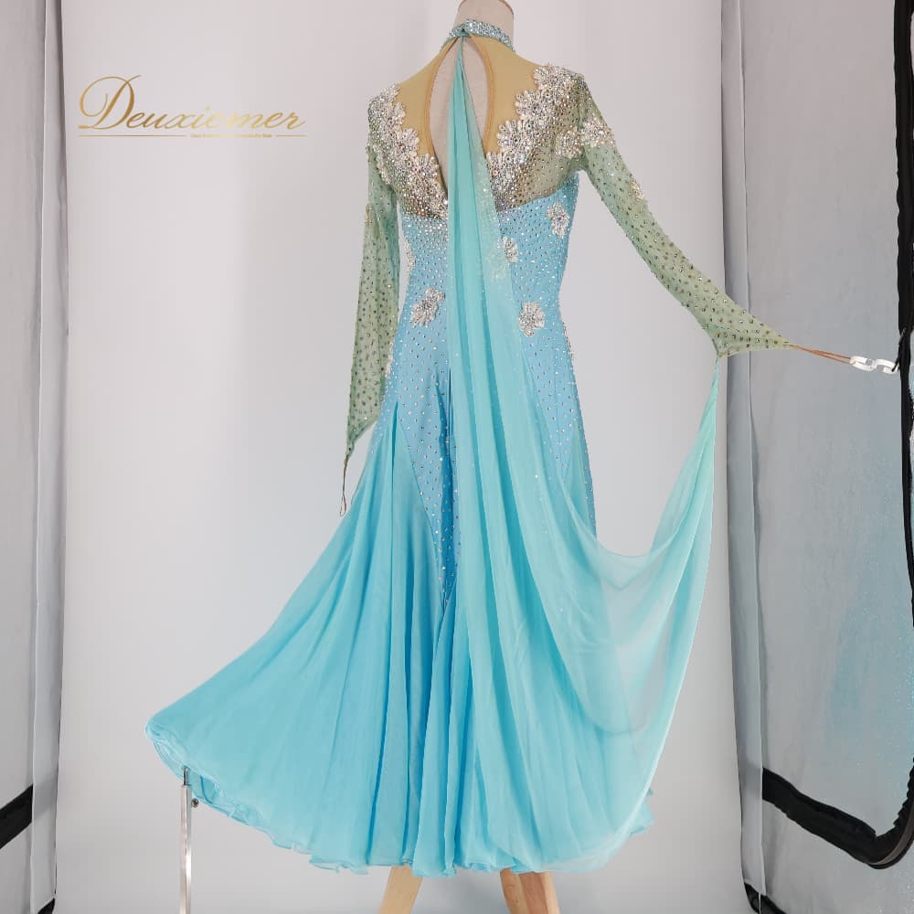 社交ダンス 衣装 ドレス ワンピース ブルー系 水色 白 フロート レース フリル ビジュー ラインストーン デモ 競技用 明るい ふんわり かわいい 上品 ダンス衣装 イベント 舞台 ホワイト系