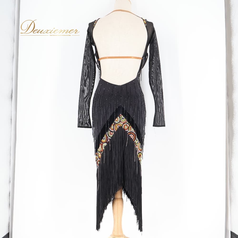 社交ダンス 衣装 Grand Amour ドレス ワンピース ラテン ブラック系 イエロー系 オレンジ系 ゴールド系 黒 黄色 金 ベロア デモ 競技 ダンス パーティ 発表会 フリンジ 華やか きらきら おしゃれ