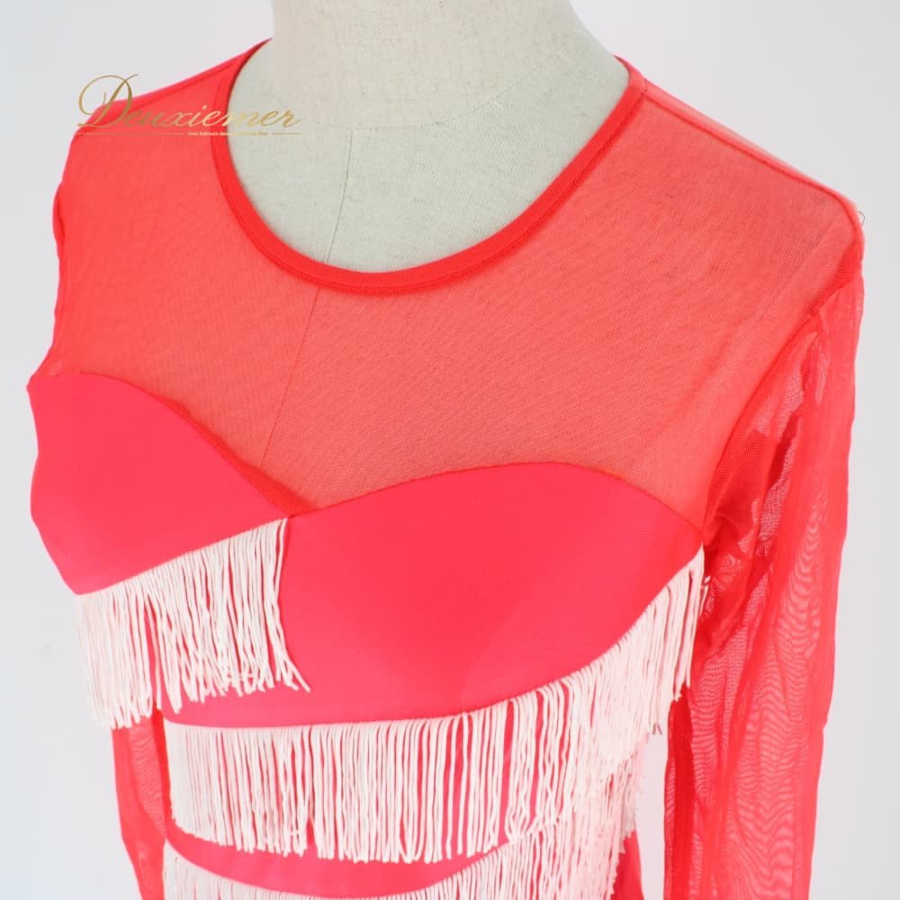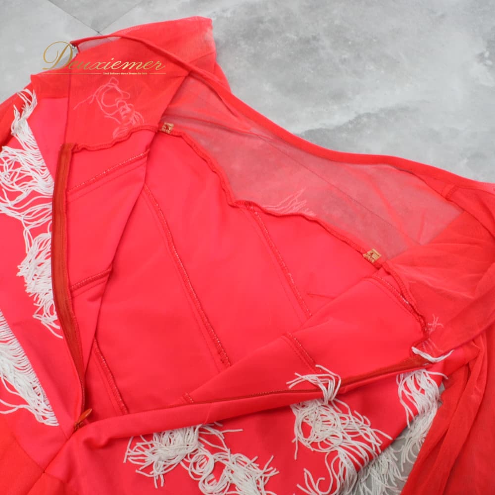 社交ダンス 衣装 DANCE FASHION EVE ダンスファッションイヴ ドレス ラテン ホワイト系 レッド系 赤 白 フリンジ バイカラー レース 長袖 ダンスパーティー パーティドレス ステージ衣装 発表会 上品 大人っぽい きれいめ 華やか エレガント