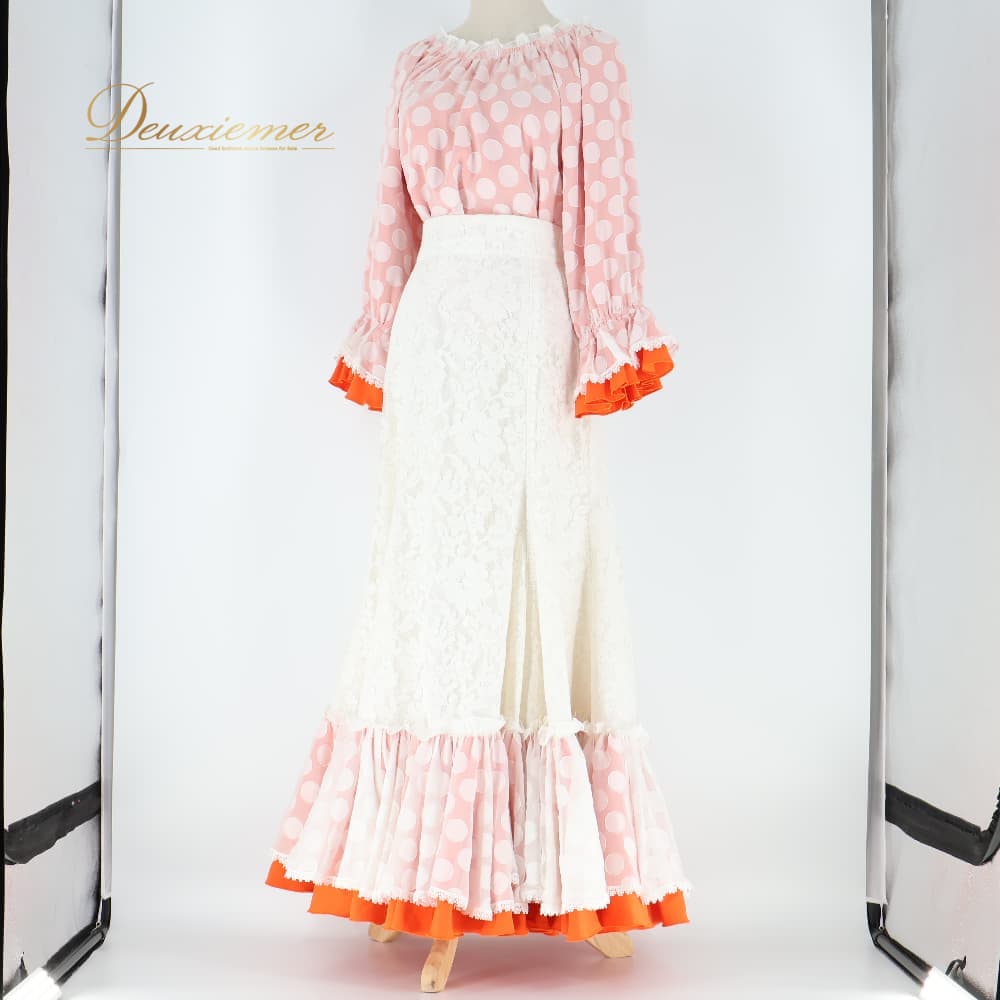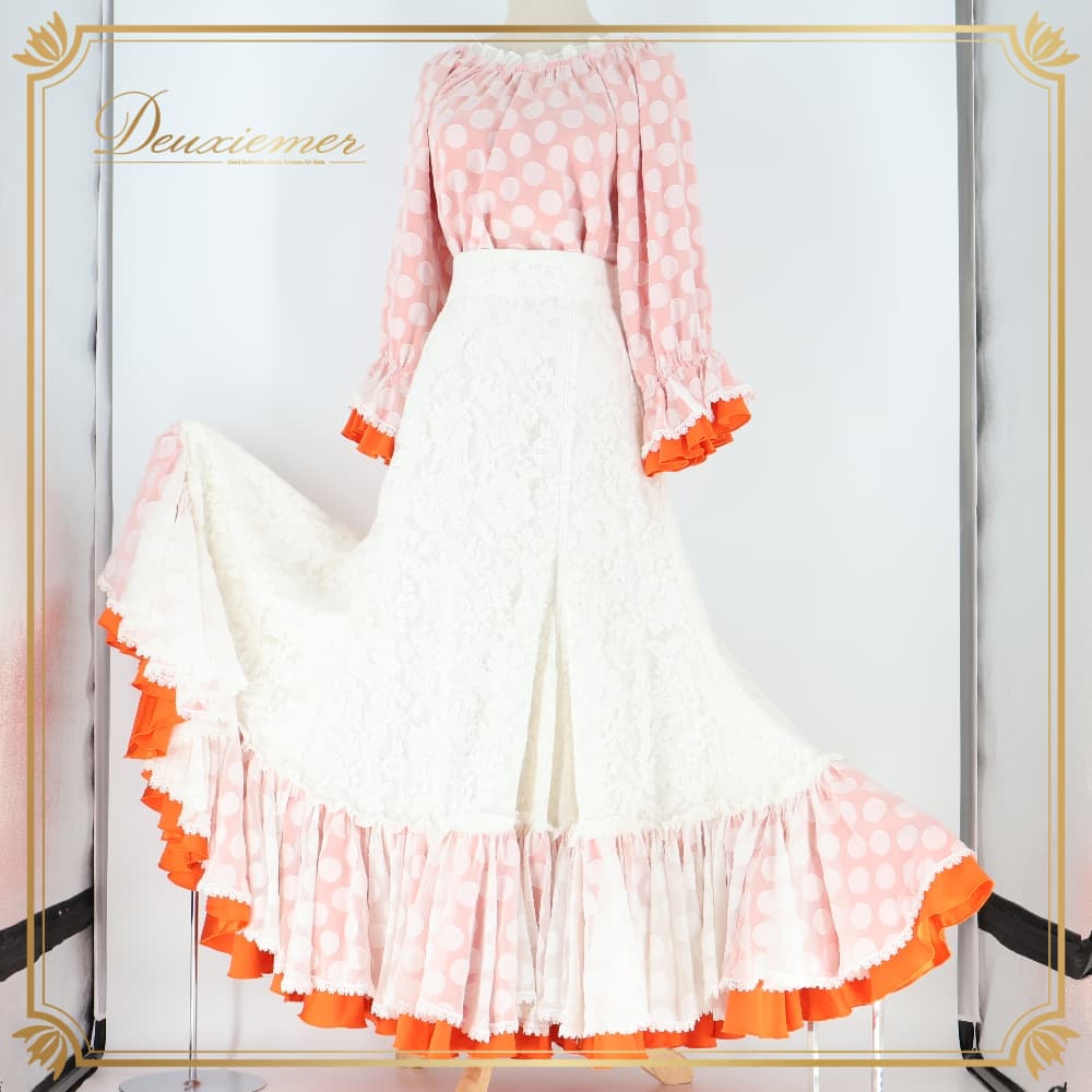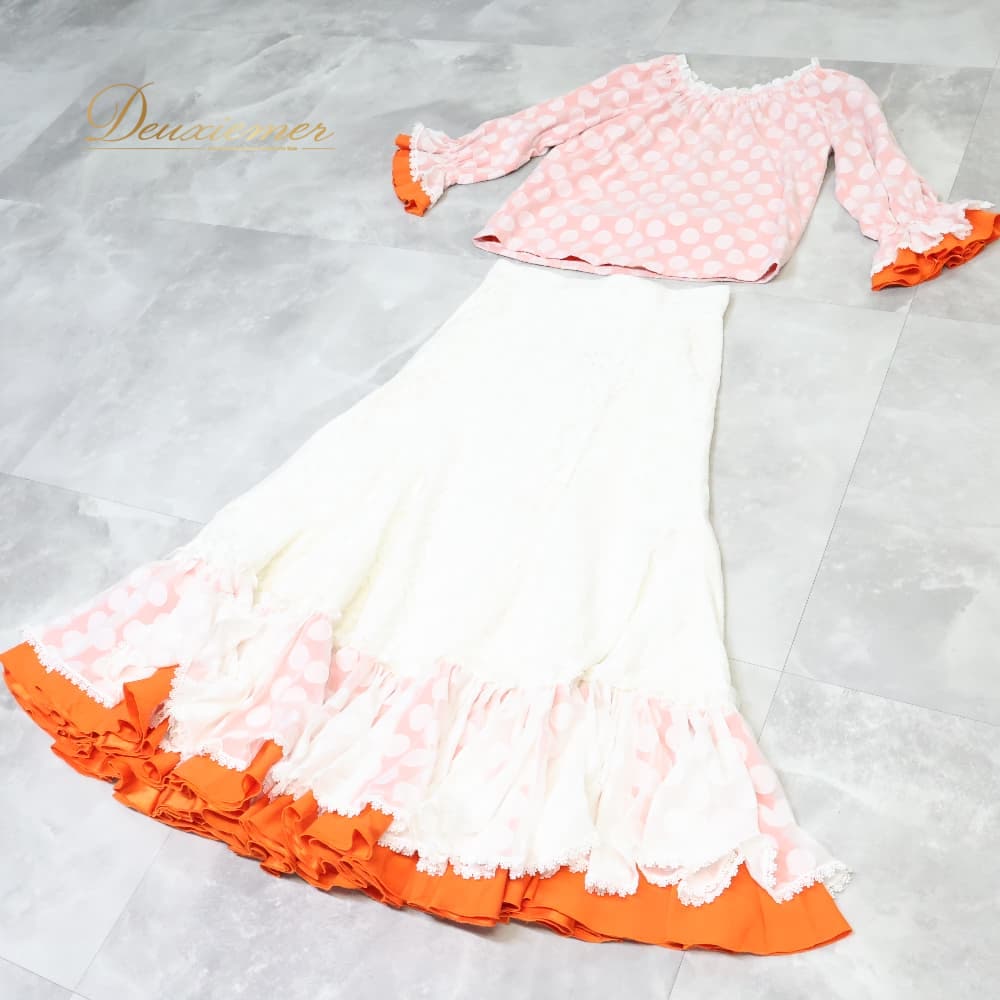 フラメンコ 衣装 SONIA JOHNES ソニアジョーンズ ツーピース セットアップ 上下セット ホワイト系 オレンジ系 白 水玉 ドット フリル レース ハイウエスト 長袖 ダンス パーティ 発表会 ダンス衣装 レディース