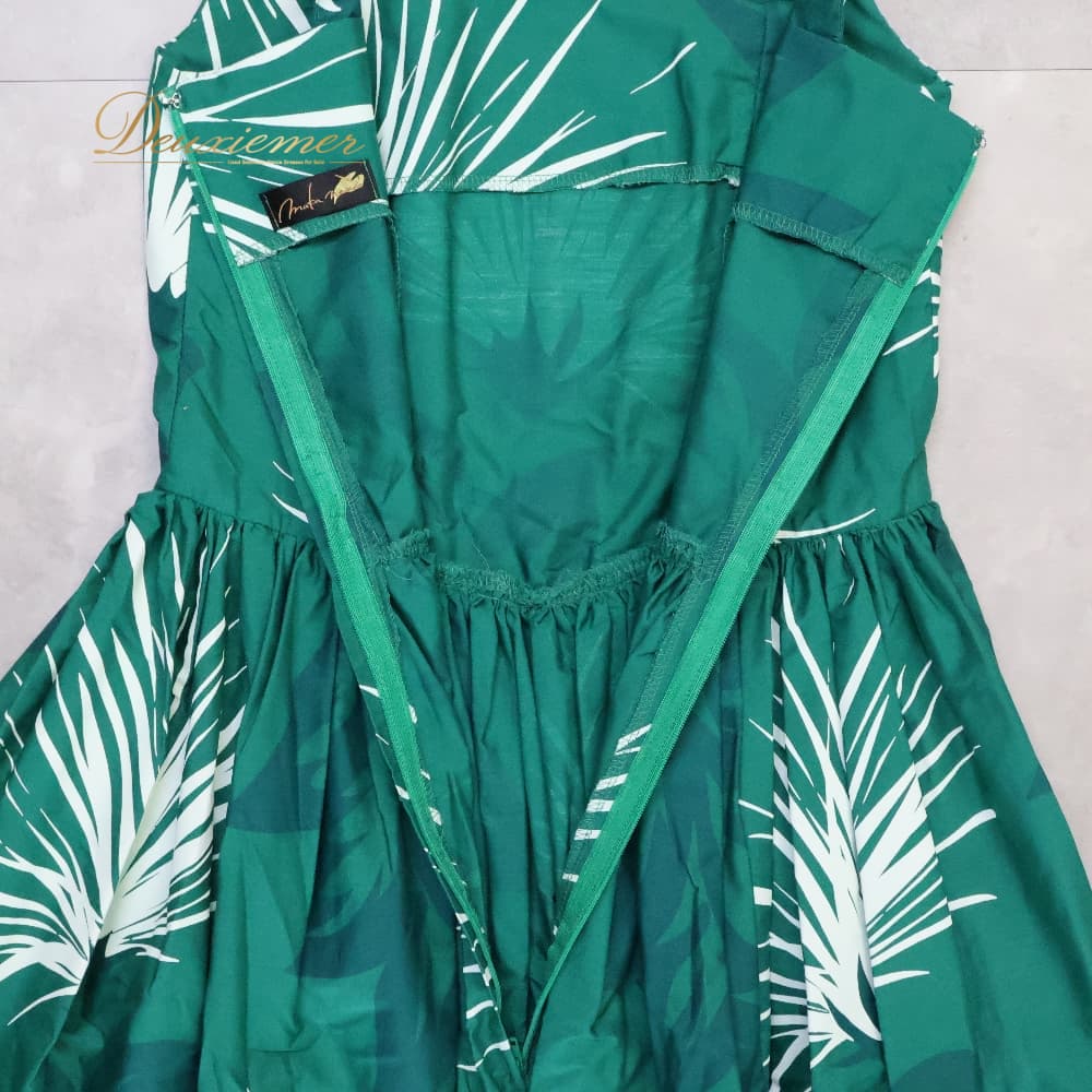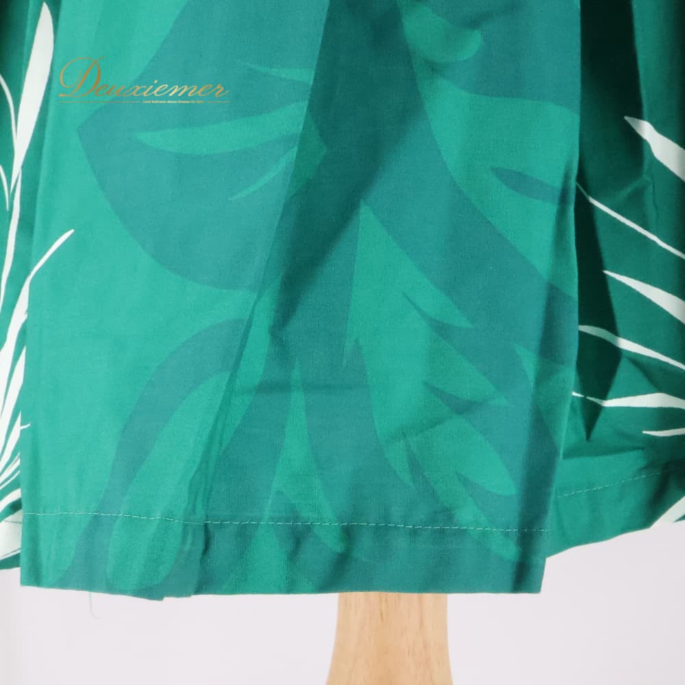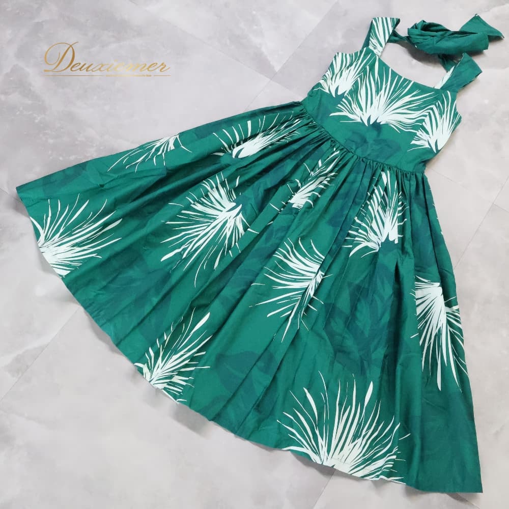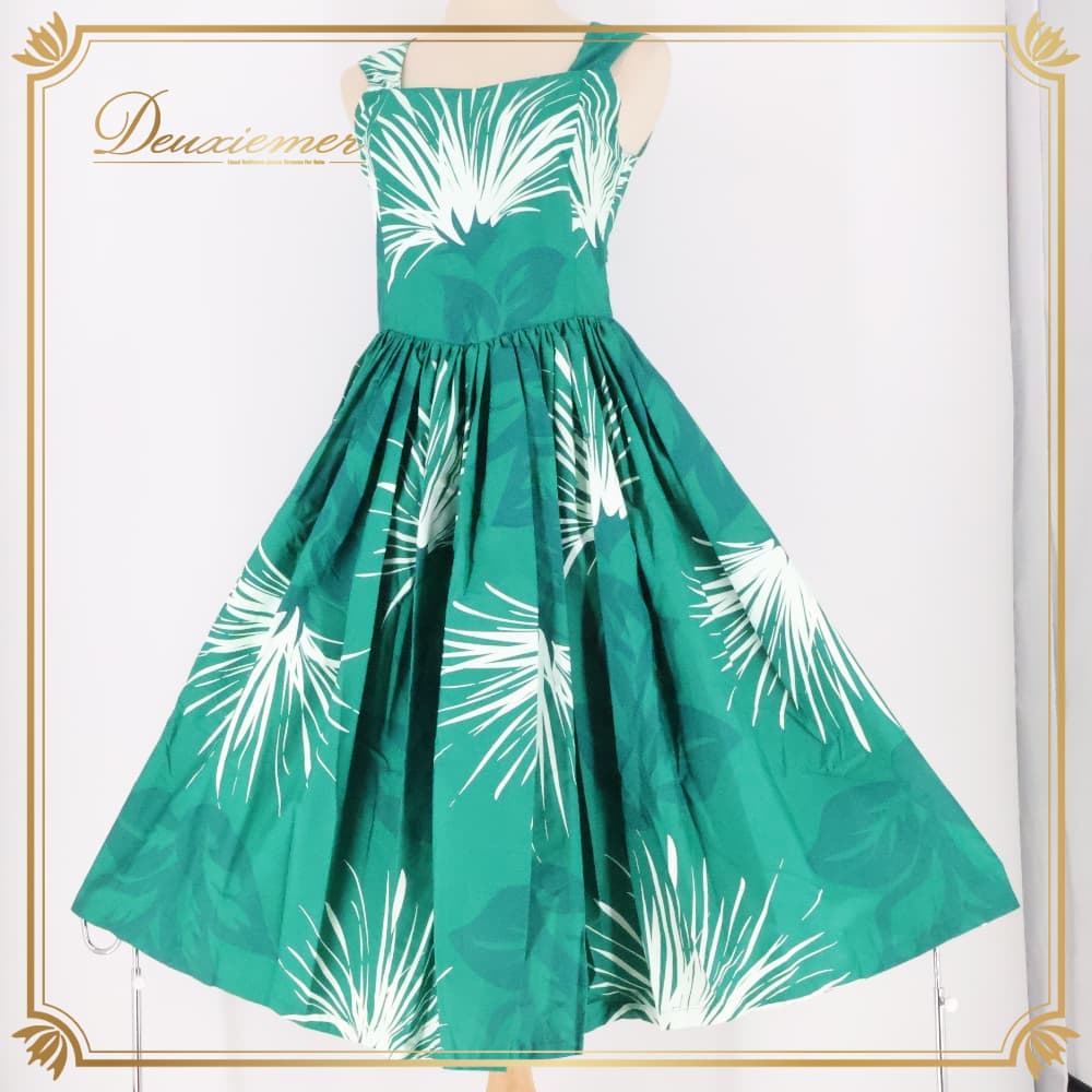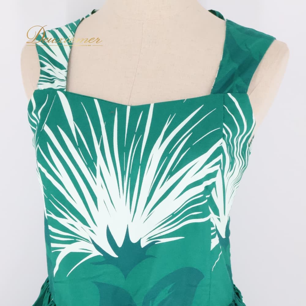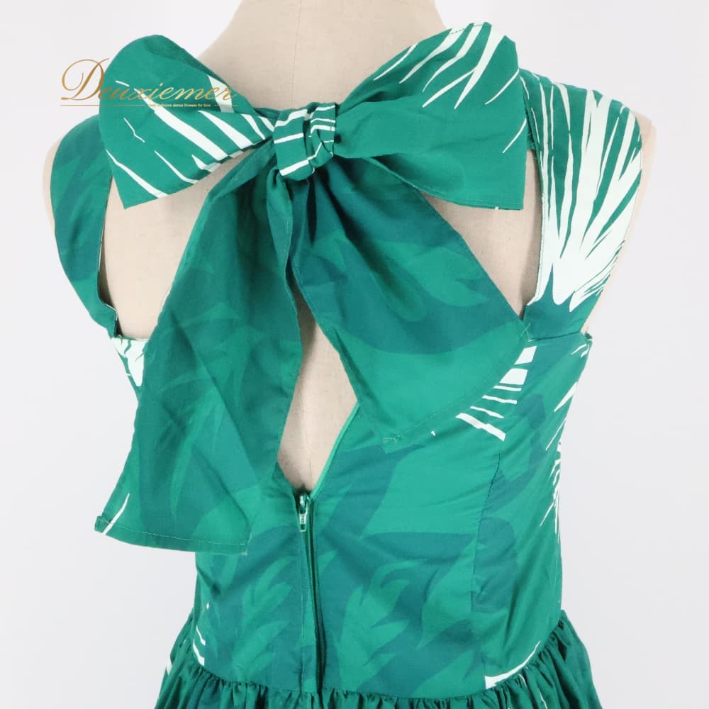 フラダンス 衣装 レイアロハ ワンピース ドレス グリーン系 ホワイト系 日本製 リボン ノースリーブ かわいい 鮮やか 華やか 明るい 緑 白 ハワイアン アロハ ハワイアンプリント フラ ダンス レッスン 練習 背面リボン 大きいリボン フローラル柄