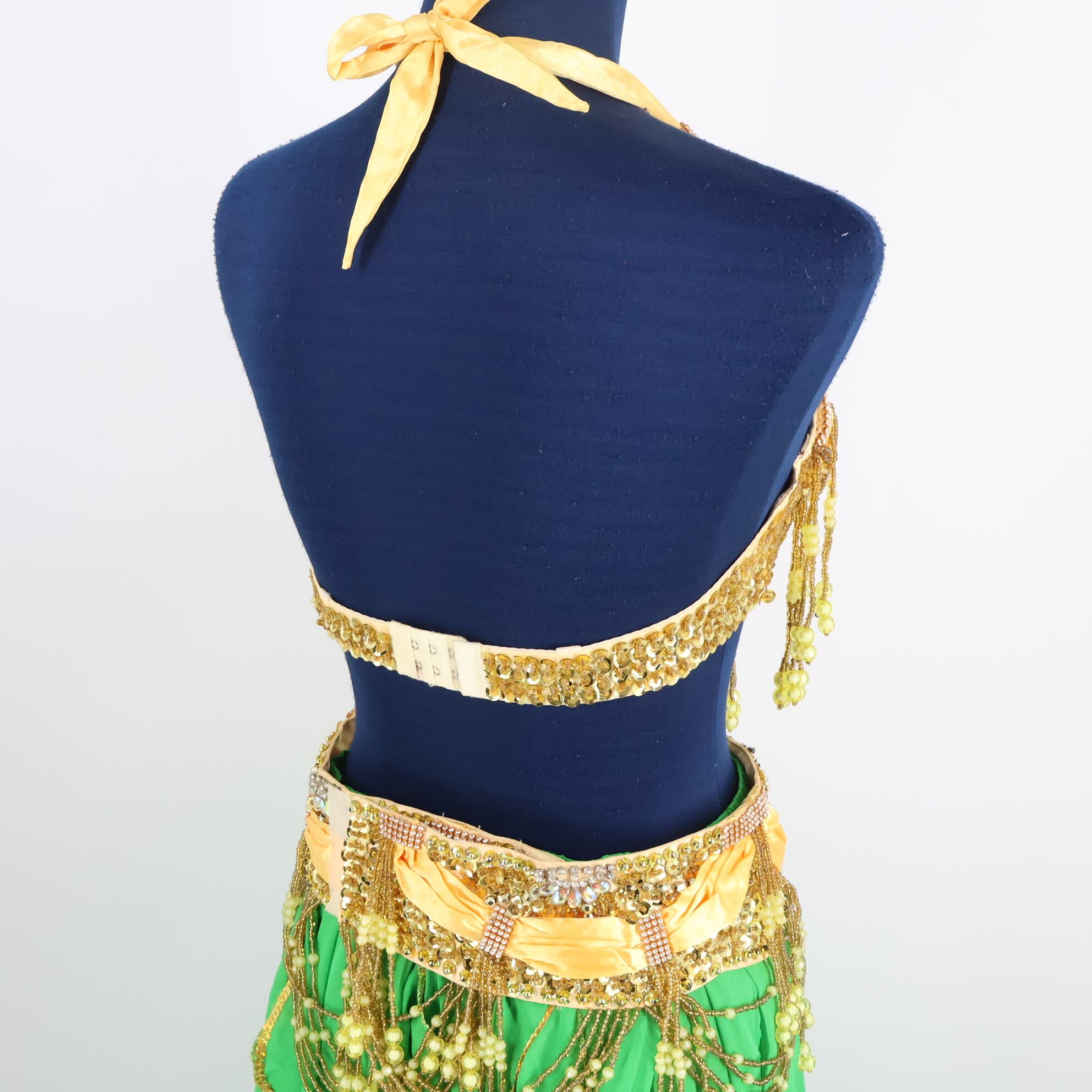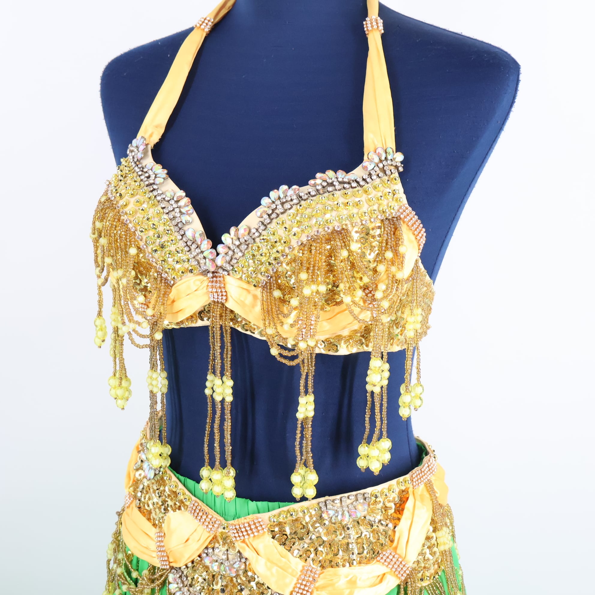 【ベリーダンス用 オリエンタル衣装】イエロー×グリーン Qiaoshi スパンコールラメ ビーズ 黄色 緑 ゴールド フリル 爽やか ブラトップ ベルト スカートセット 豪華 綺麗