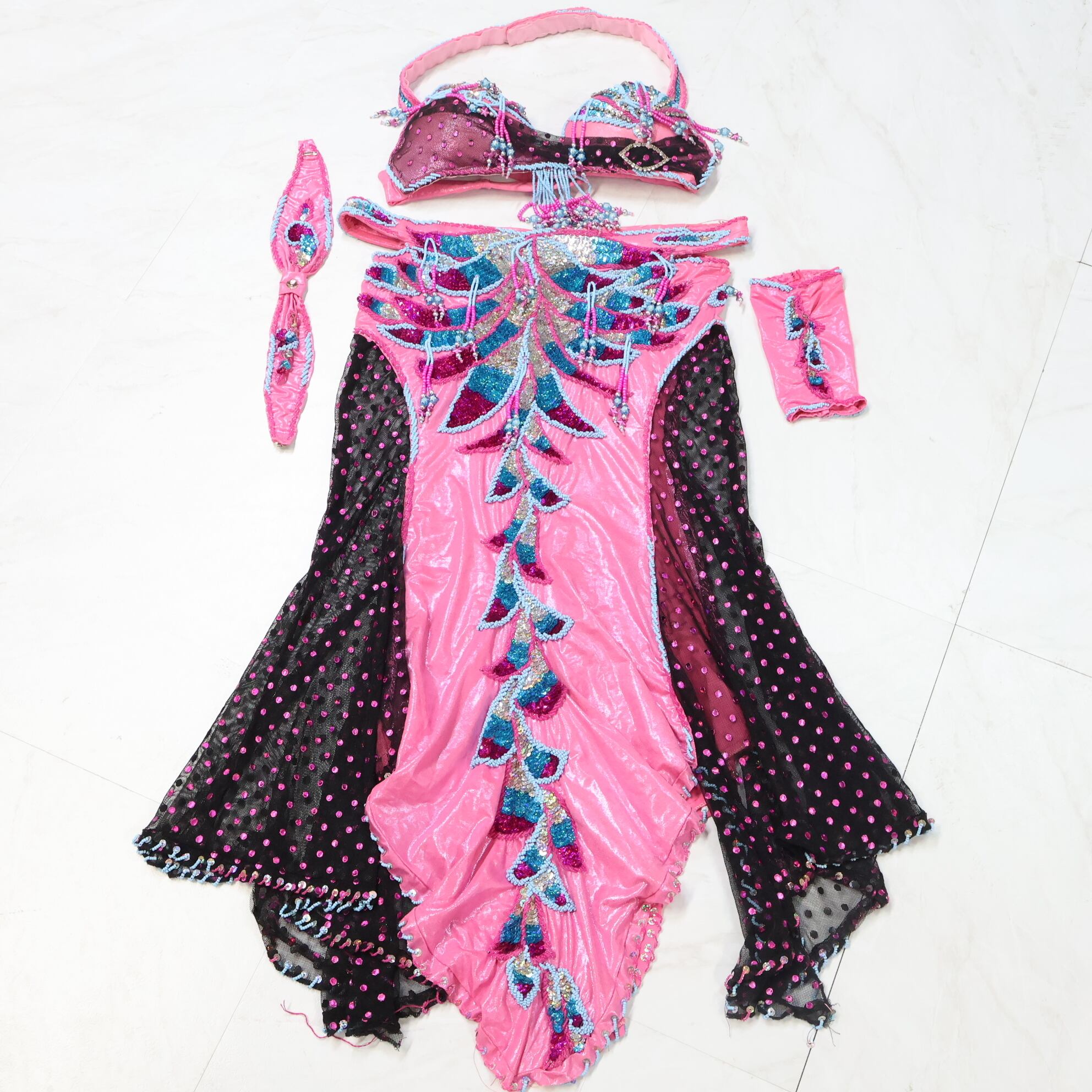【ベリーダンス用 オリエンタル衣装】ピンク×水色 スパンコールラメ ビーズ シルバー レース 可愛い 女性らしい 豪華 黒 水玉 ブラトップ スカート アクセサリーセット