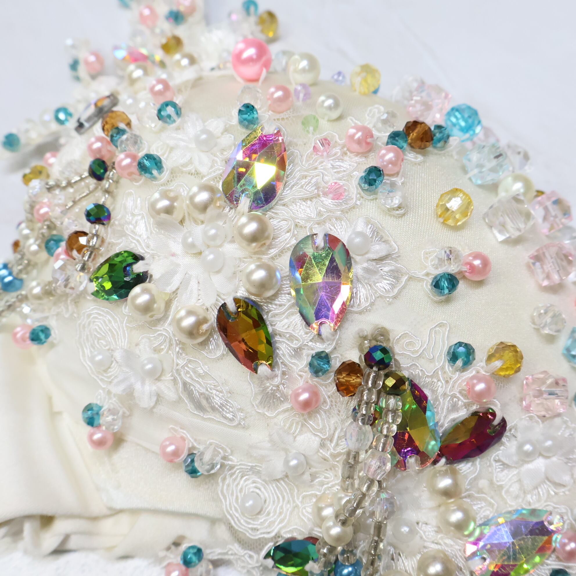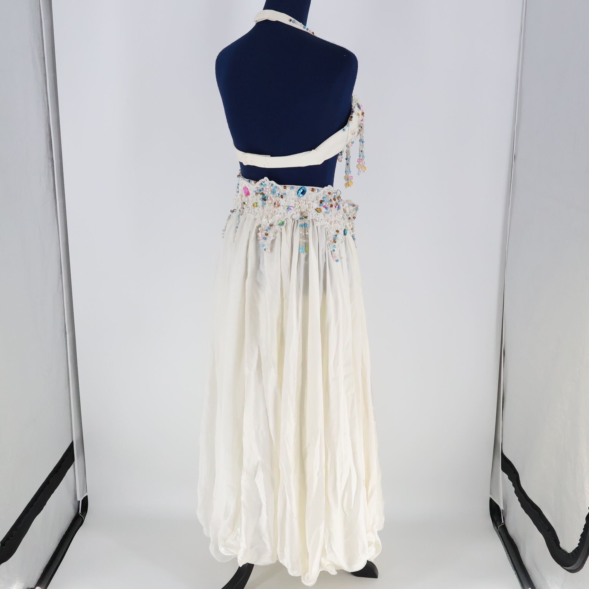 【ベリーダンス用 オリエンタル衣装】ホワイト ビーズ カラフル 豪華 白 花柄 真珠 シルバー フリル レース ふんわり 可愛い ブラトップ スカートセット 女性らしい