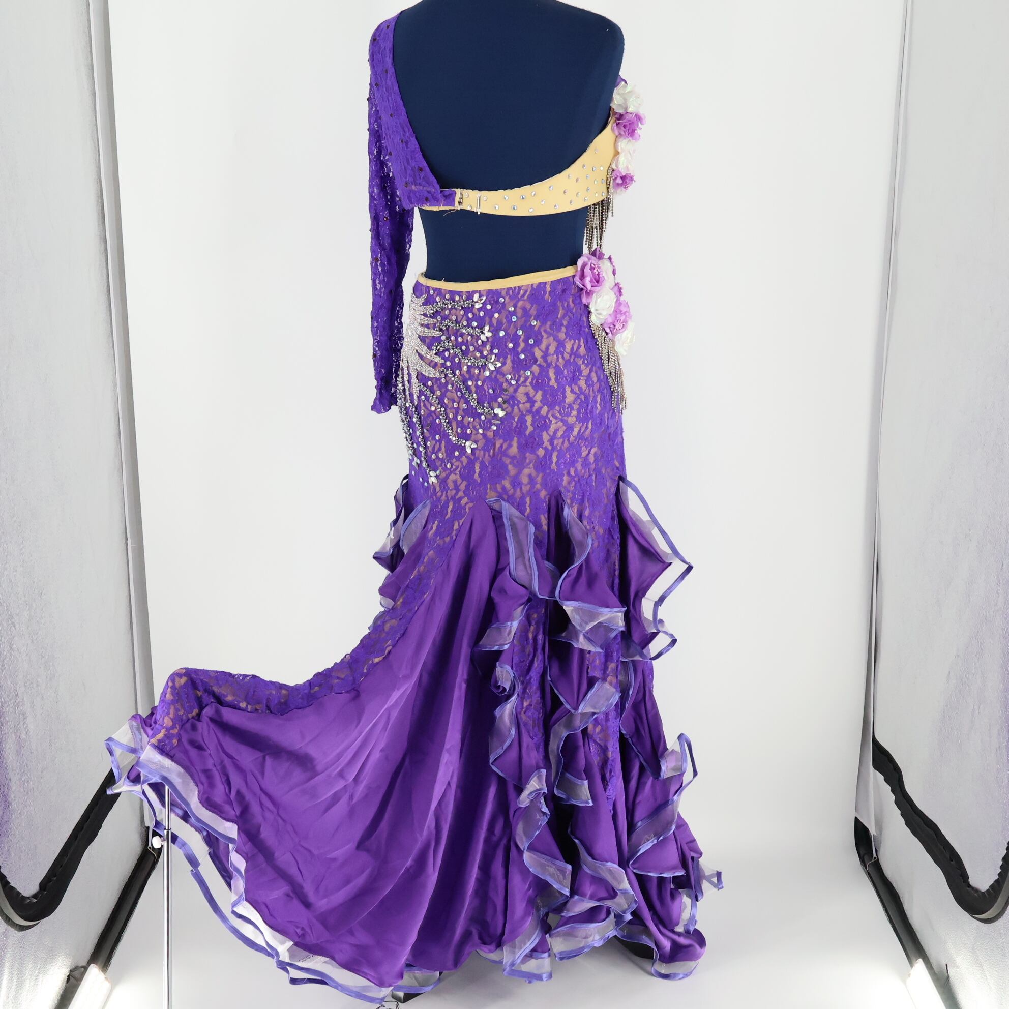 【ベリーダンス用 オリエンタル衣装】パープル ラインストーン 豪華 紫 シルバー 花のコスチューム フリル 華やか レース ブラトップ スカートセット 煌びやか 高級感 ゴージャス 綺麗 鮮やか ボリューム