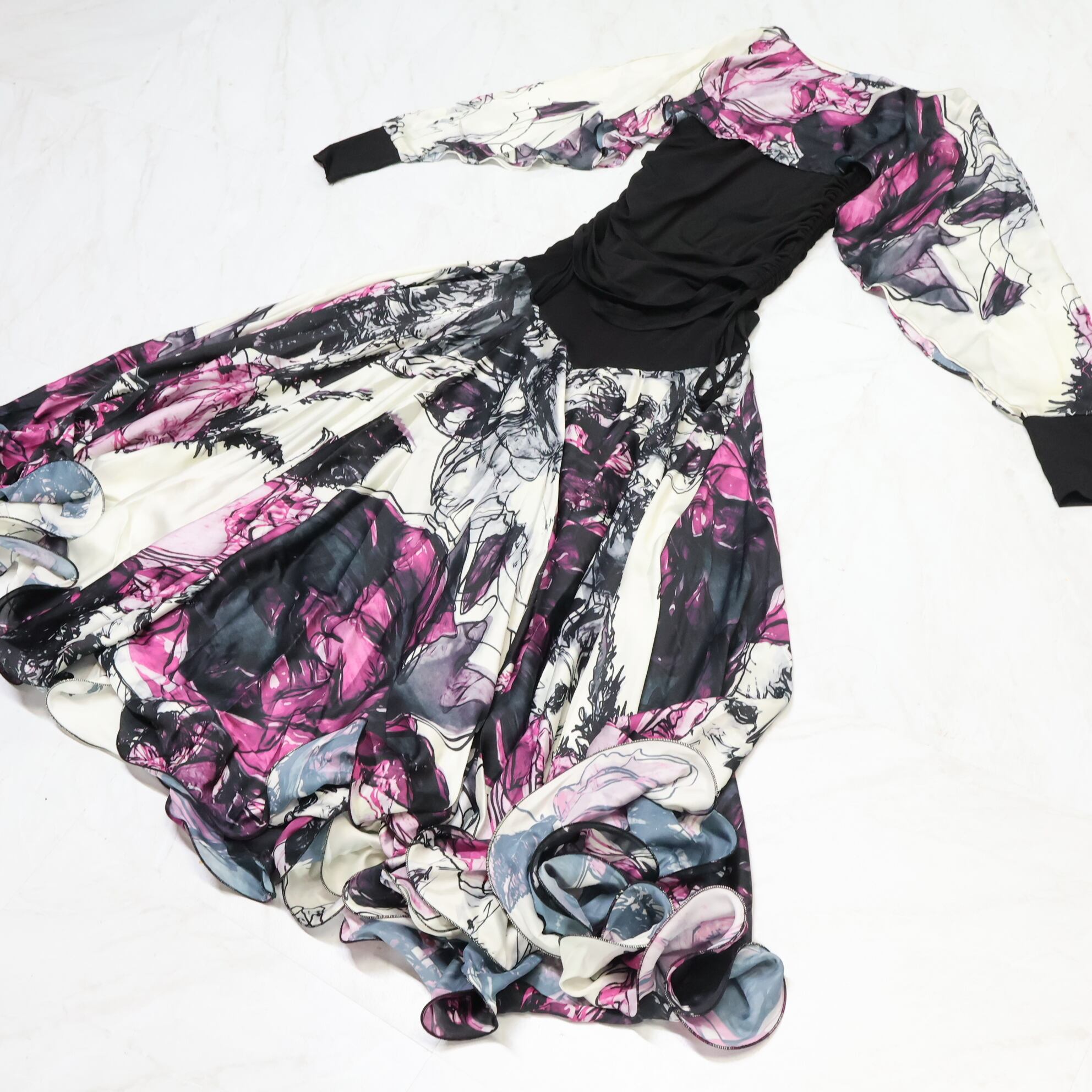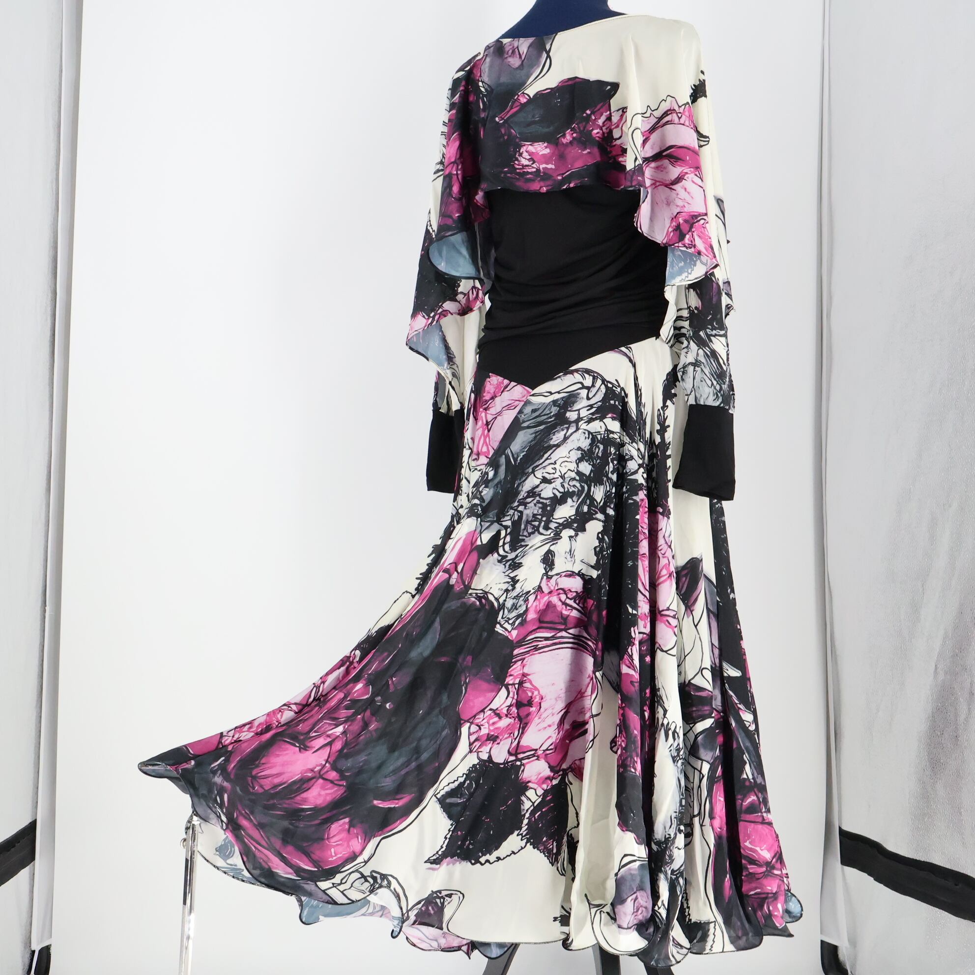 【美品 社交ダンス衣装】ブラック create-sun 上下セット ツーピース パープル 紫 黒 白 柄 レッスン 練習着 伸縮 レース 軽い