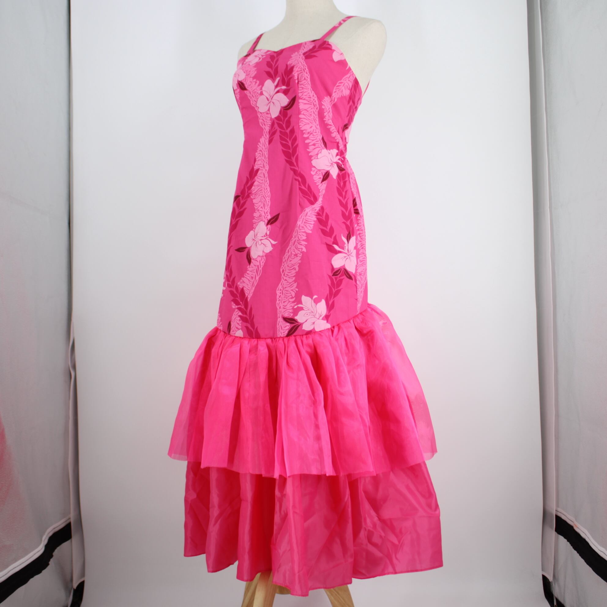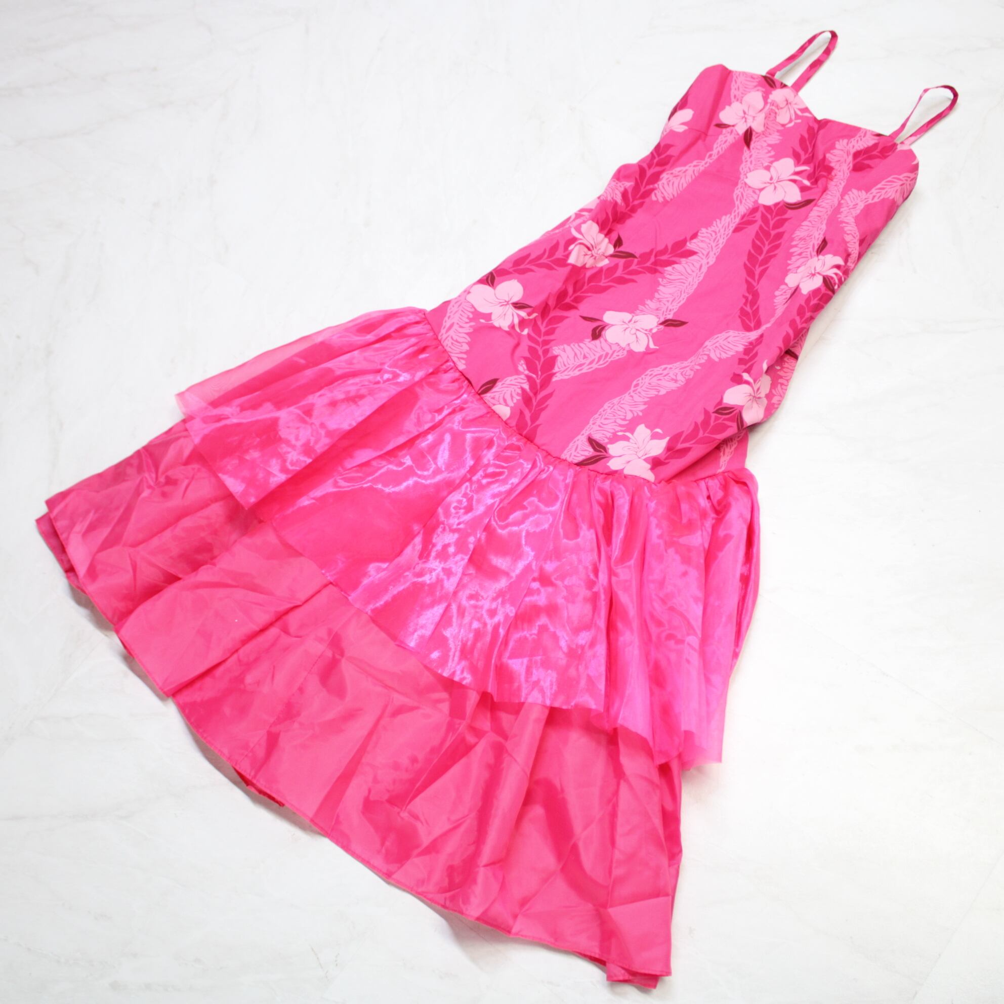【美品 フラダンス衣装】ピンク ワンピース ドレス ハイビスカス柄 フリル ショッキングピンク キャミソール ハワイアン 花柄